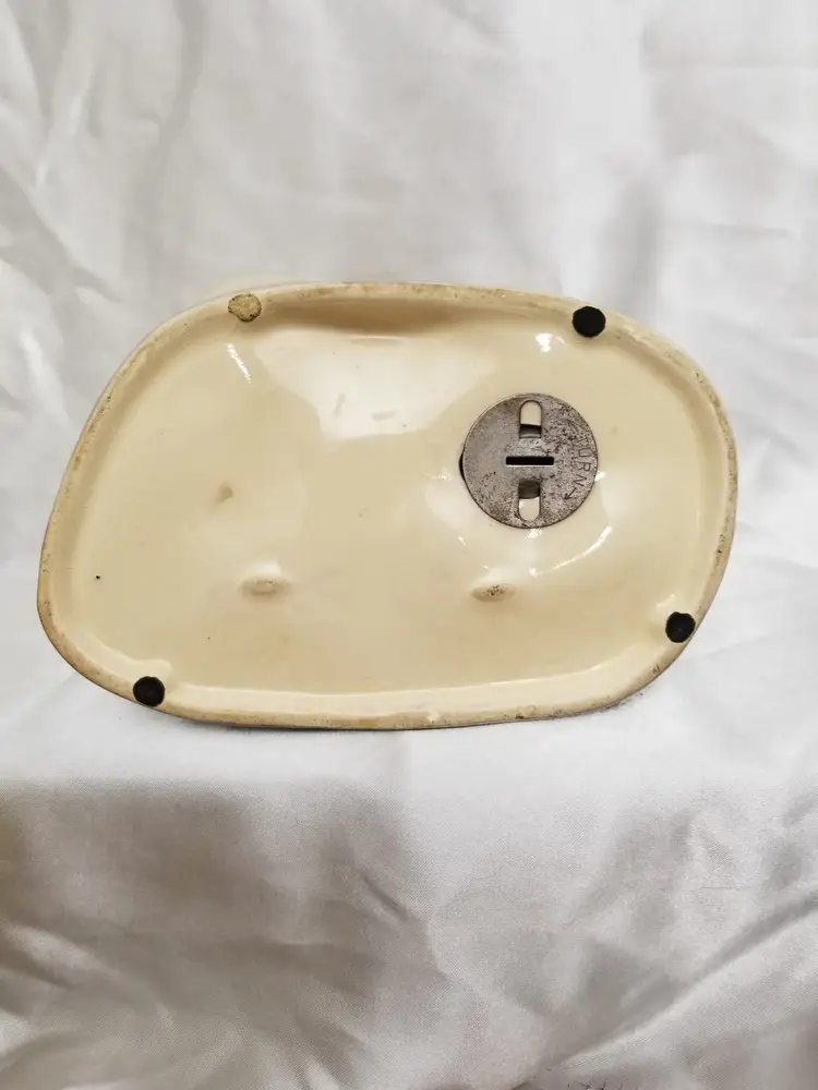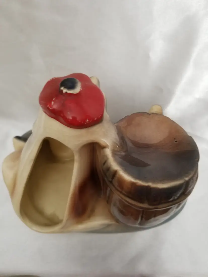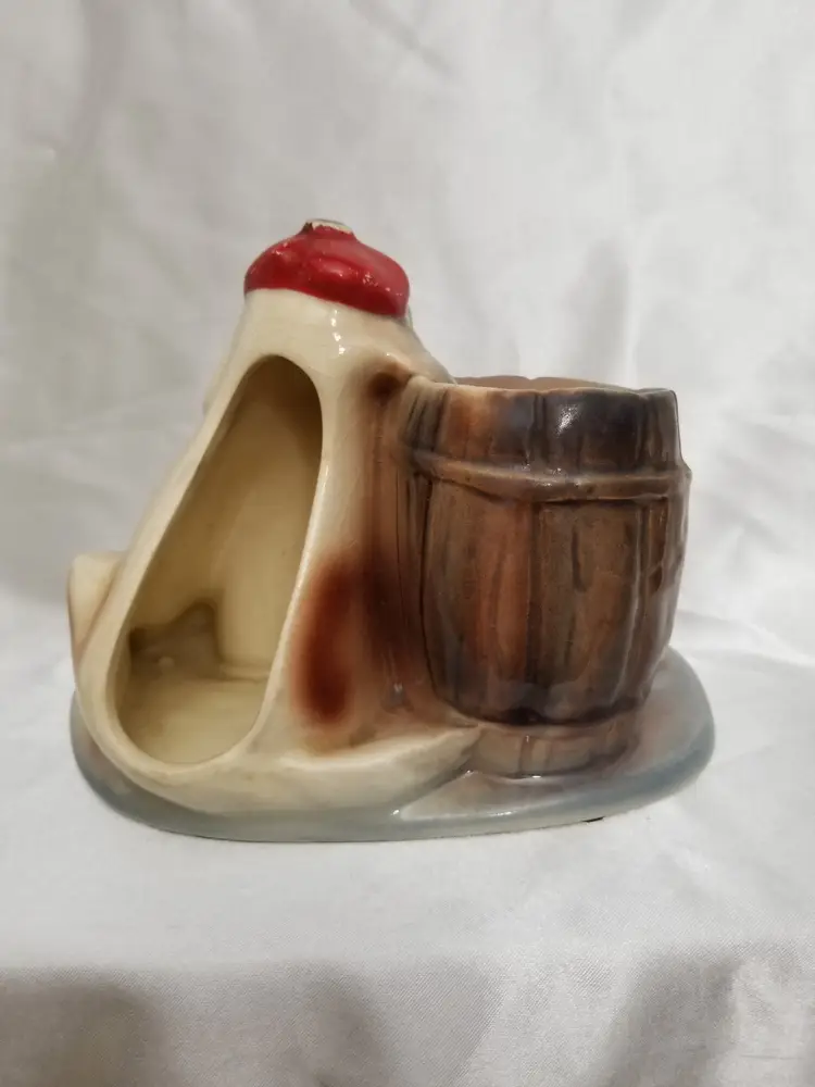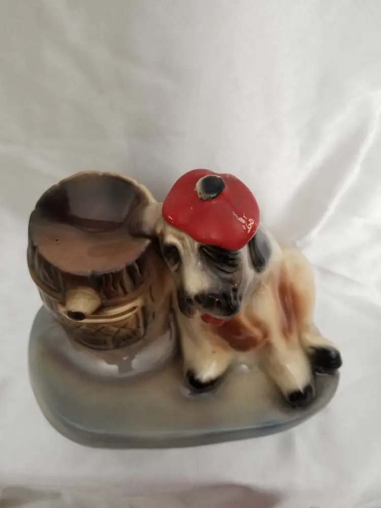 The Vintage McCoy Pottery St. Bernard Dog Bank, also affectionately known as the "Hungover Dog" bank, is a charming and whimsical ceramic figurine that captures the essence of the mid-20th century kitsch and home decor. Crafted in the 1950s, this delightful piece features a St. Bernard dog with an amusingly tipsy expression, propped against a whiskey barrel. The barrel serves as the bank's coin slot, inviting playful interactions and adding a touch of humor to the function of saving money. The St. Bernard dog is intricately painted in cold paint on his tongue and hat, showcasing rich details, while the rest is painted under glaze. The bank measures 6 1/2 inches in height, 8 1/2 inches in length, and 5 3/4 inches in width, making it an eye-catching yet compact addition to any space. This particular piece exhibits the signs of its vintage status with some wear to the paint and an all-over crazing pattern, which adds to its character and authenticity. The crazing is a network of fine cracks in the glaze that often appears on older ceramics and is a result of the material's natural aging process. Despite this, the bank remains in good condition with its original stopper intact, ensuring your coins are secure within the barrel. The overall design is a nod to the whimsical and playful themes that were popular in the 1950s, and the McCoy Pottery is a well-known and respected American pottery company. This bank is not only a functional item for collecting loose change but also a delightful conversation starter and a testament to the enduring appeal of kitsch and nostalgic decor. Please note that the wear and crazing are consistent with the age and use of the bank, and the pictures provided offer a clear representation of its current condition. If you have any further questions or would like additional information, don't hesitate to ask. Thank you for considering this unique piece of vintage pottery!