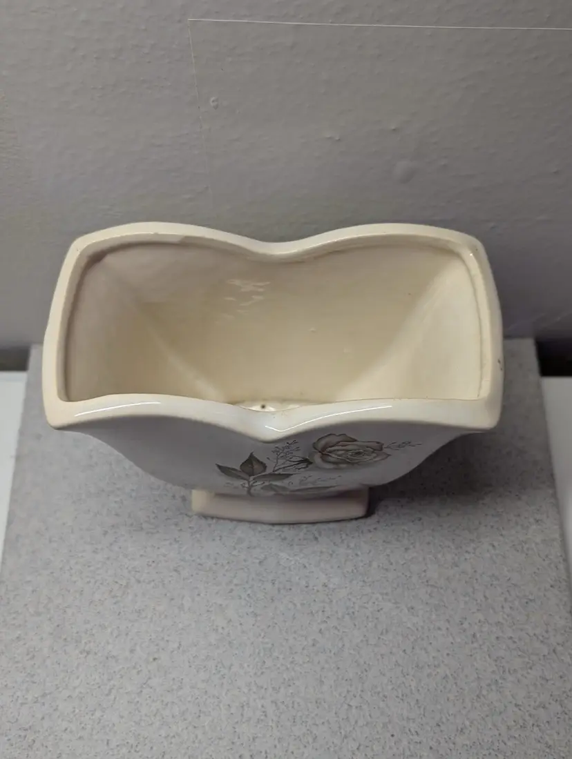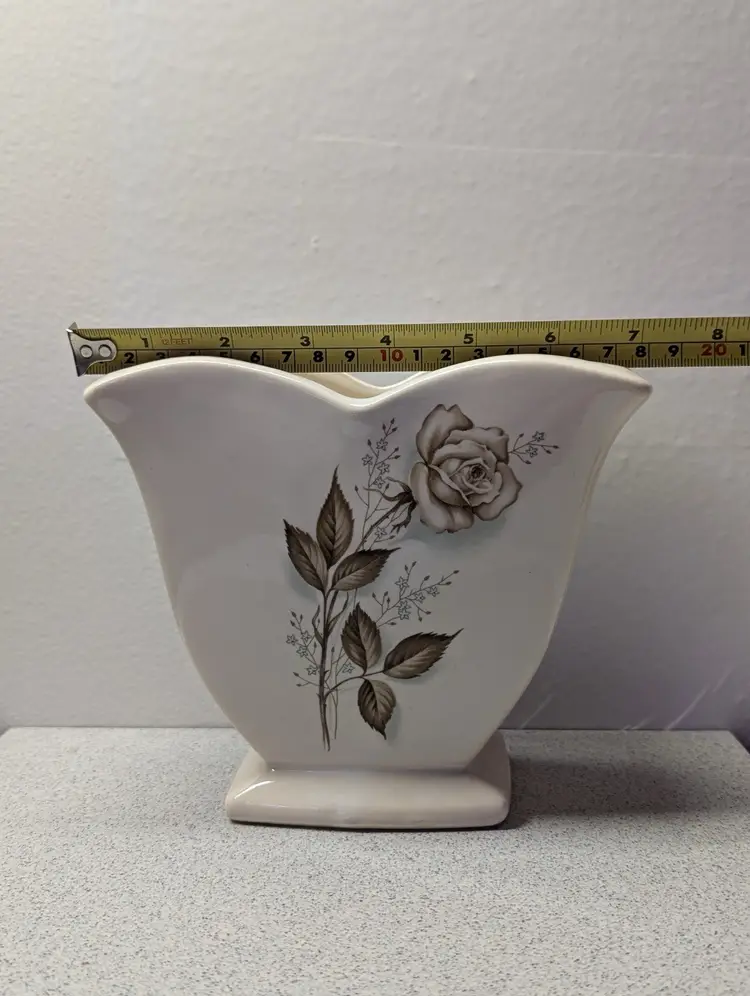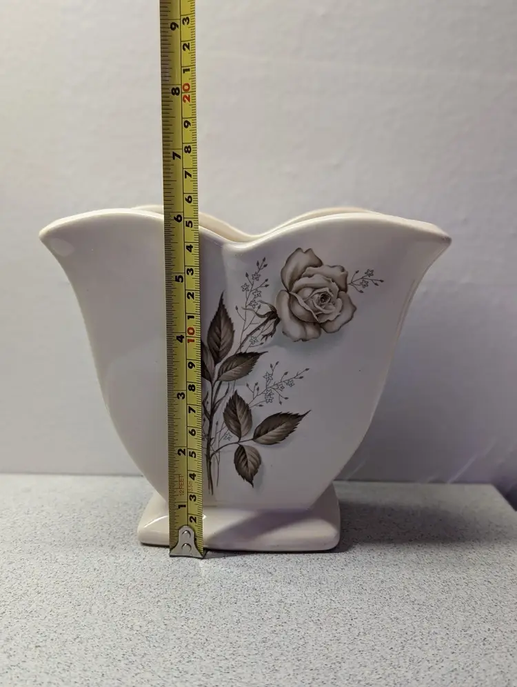This vintage McCoy pottery vase is a beautiful addition to any collection. The applied white rose design is intricately crafted with a floral pattern, making it a perfect decoration for any room. The vase is made of high-quality ceramic with a glossy finish, ensuring it will last for years to come. The production style is art pottery with a pottery production technique, and the subject is a beautiful rose. This vase is perfect for anyone who loves flowers or vintage pottery.