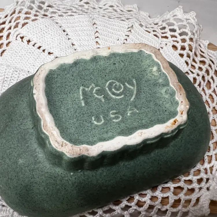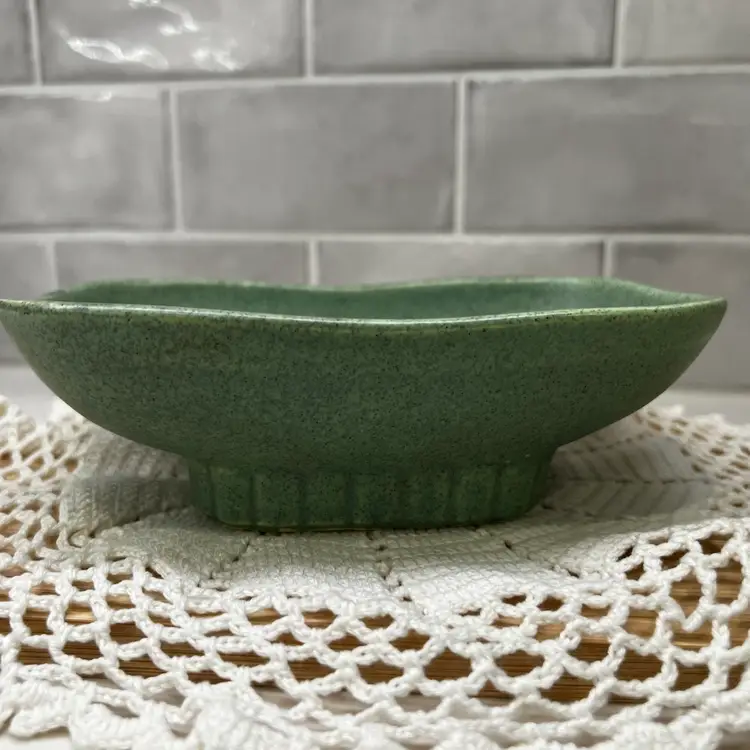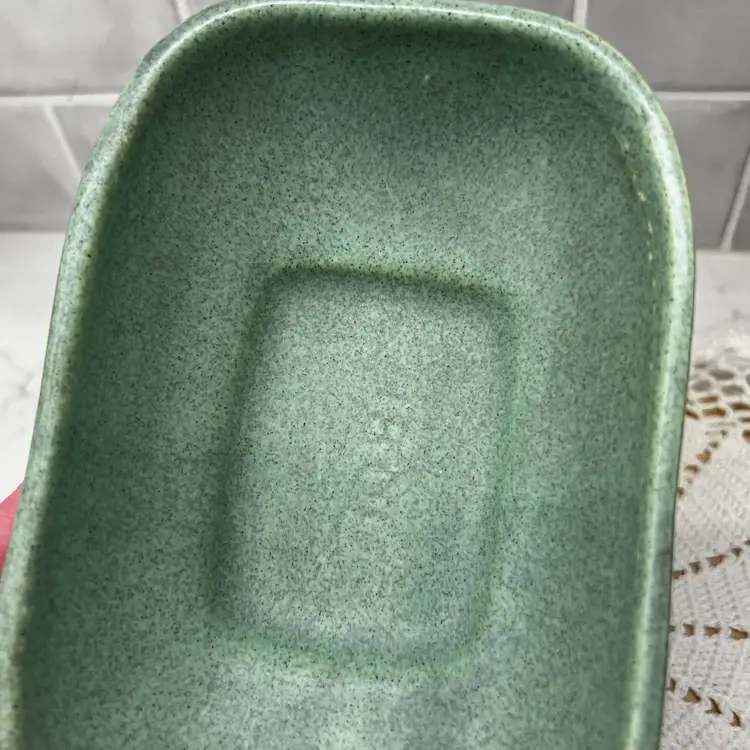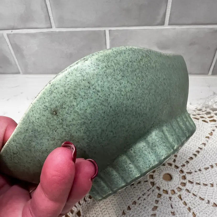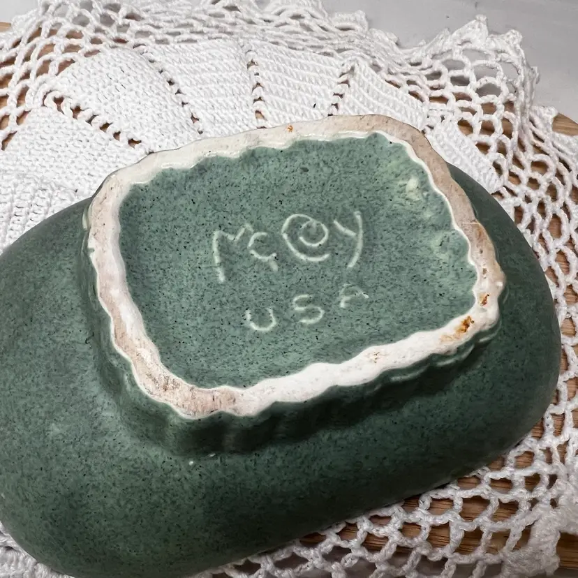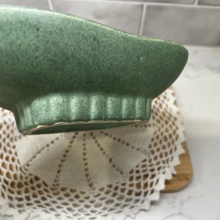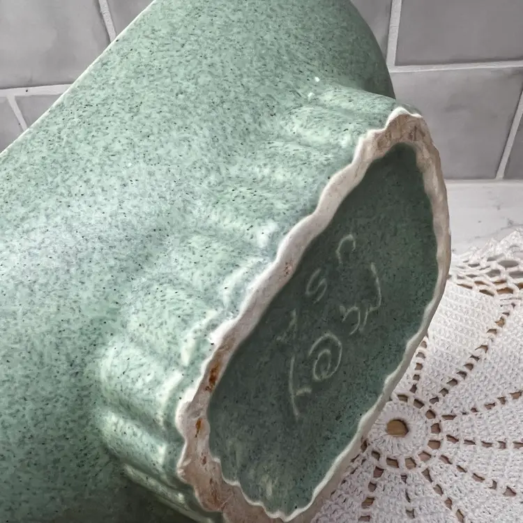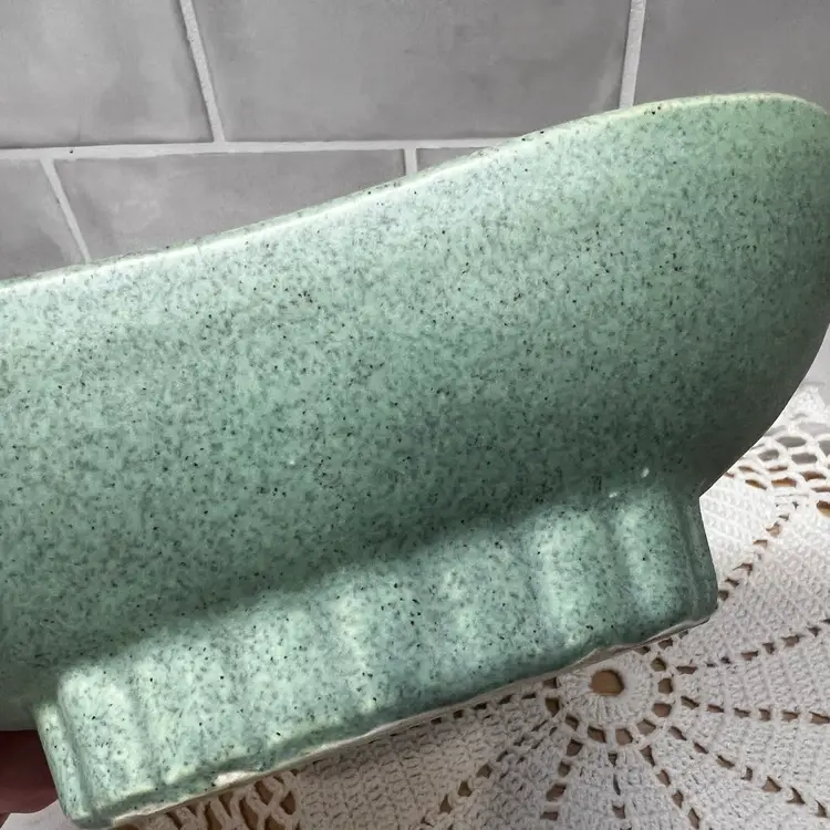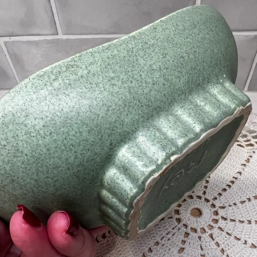 McCoy Speckled Green Planter - 1960s - #1081 USA. McCoy is marked on the bottom. Measures 7" L x 2 5/8" at the base.