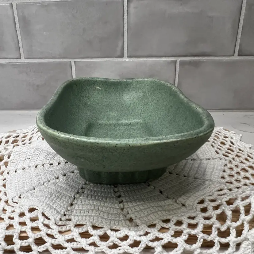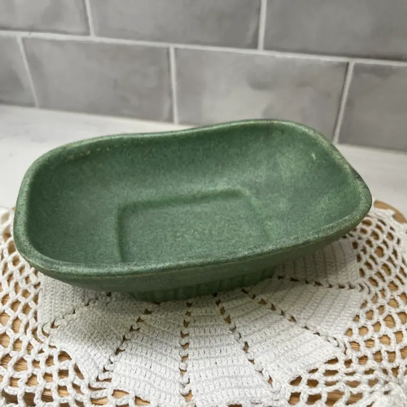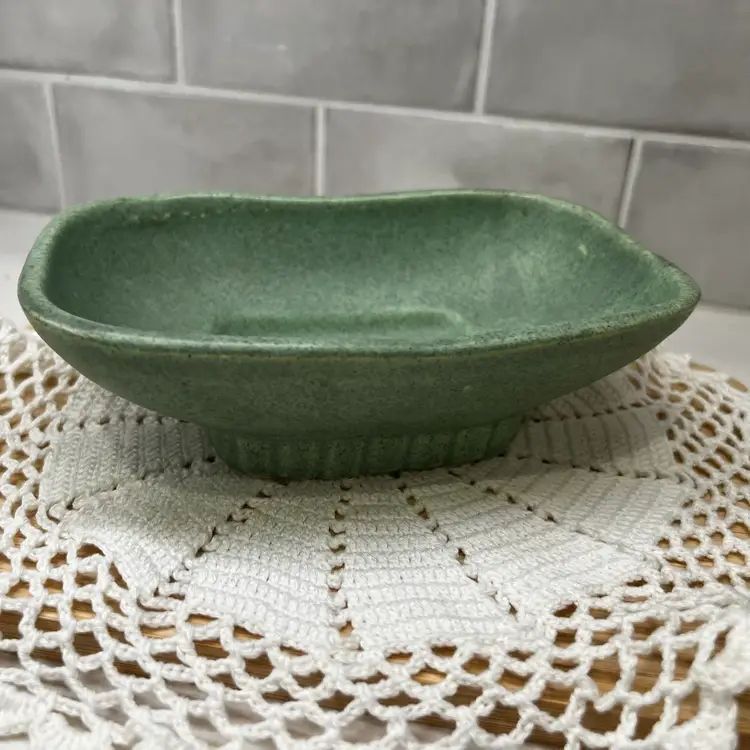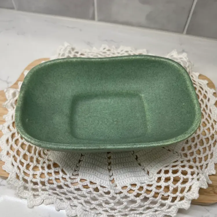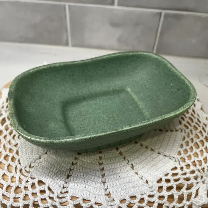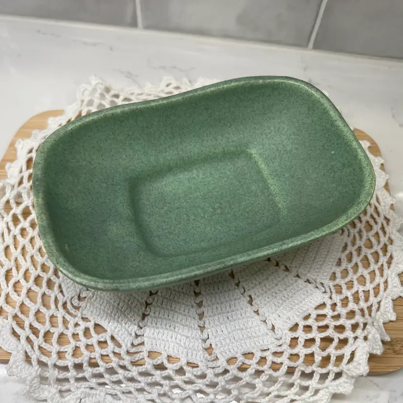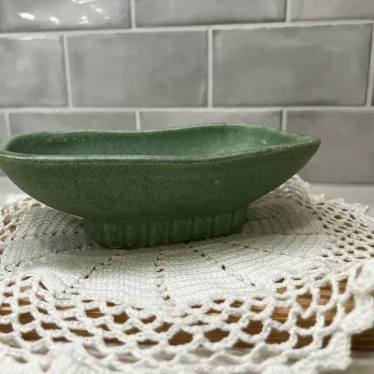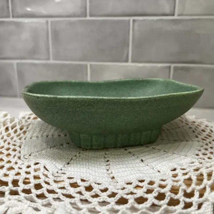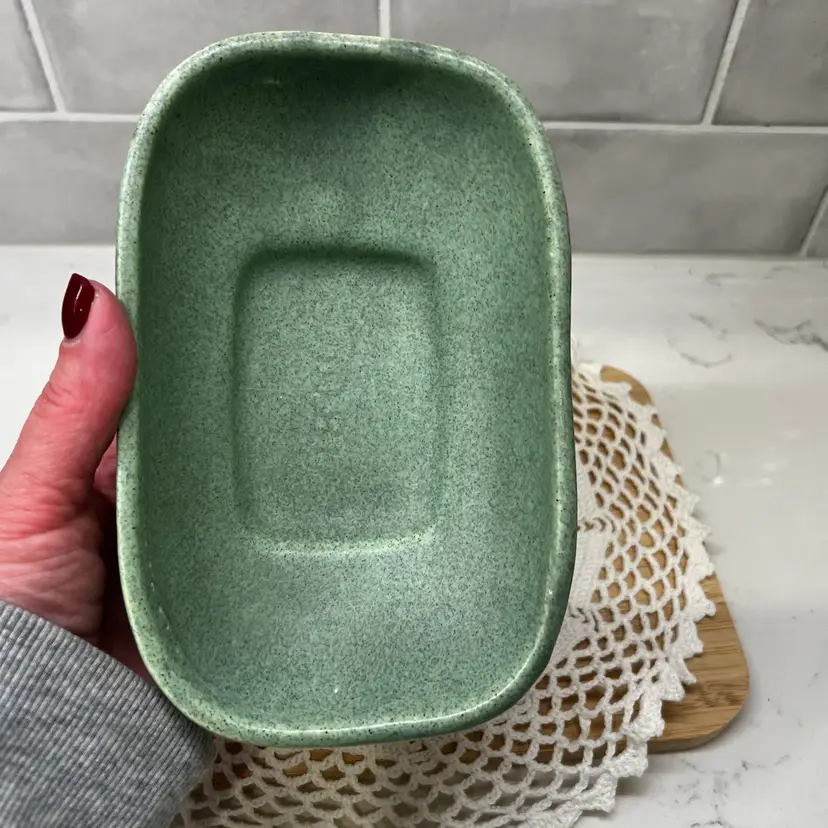 McCoy Speckled Green Planter - 1960s - #1081 USA. McCoy is marked on the bottom. Measures 7" L x 2 5/8" at the base.