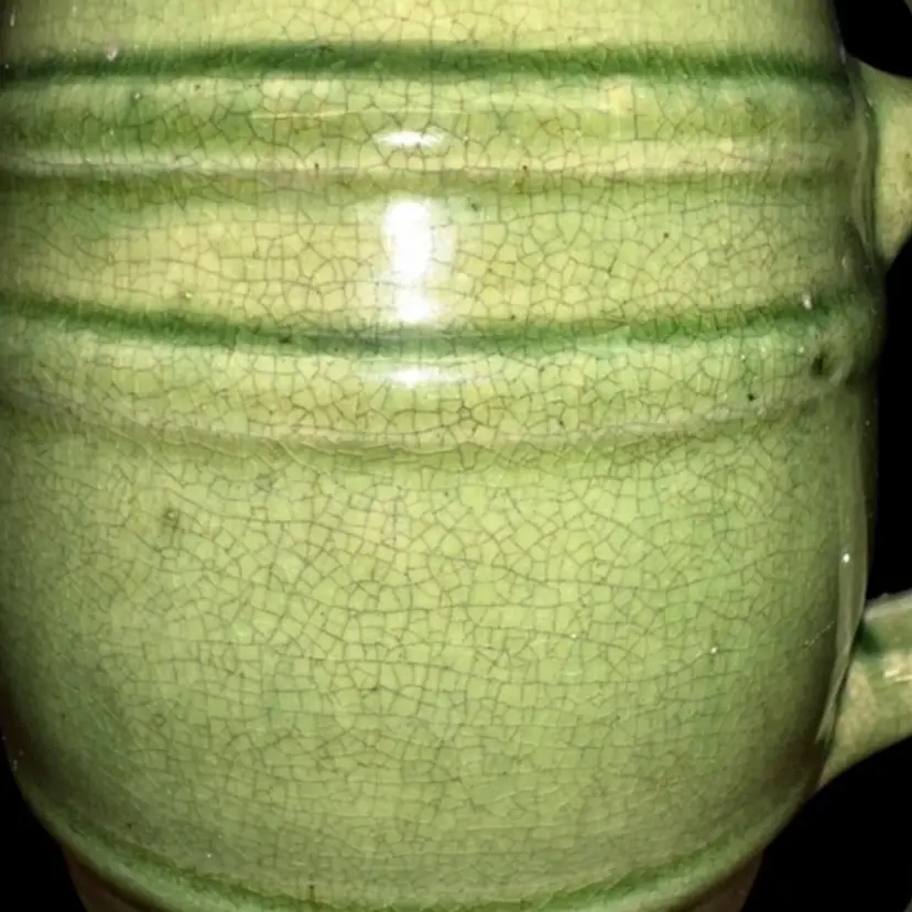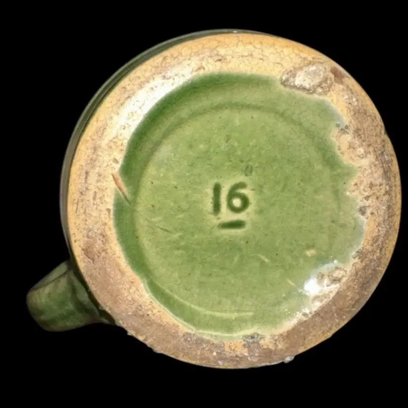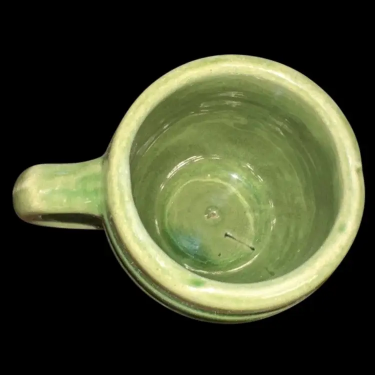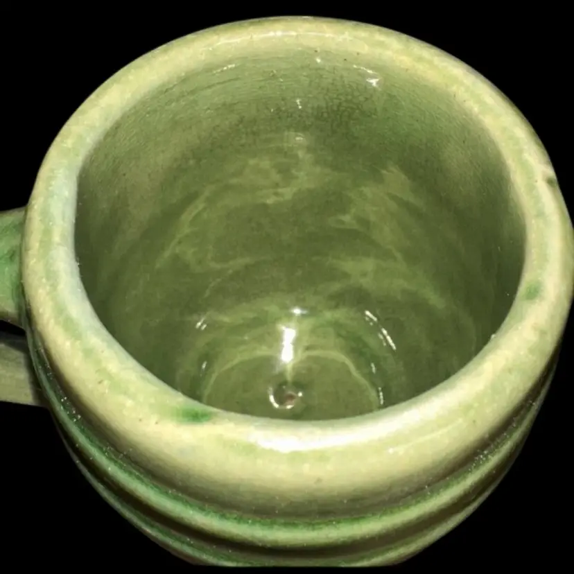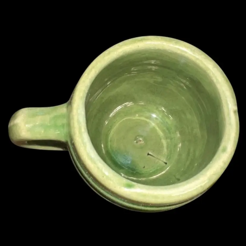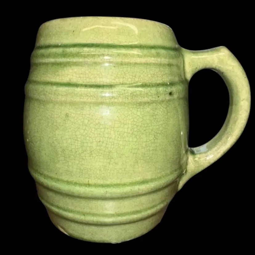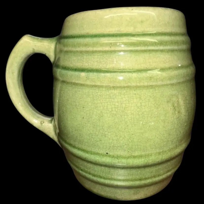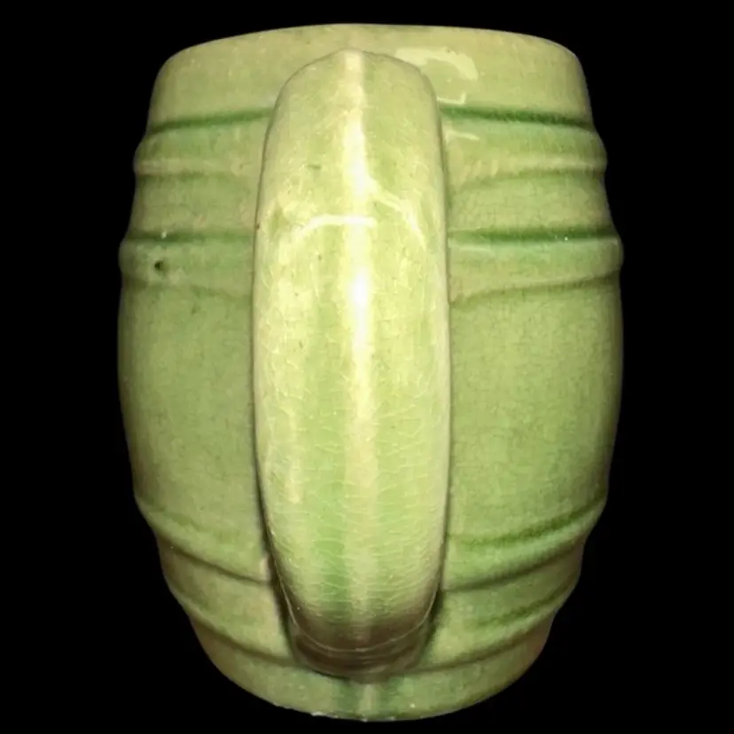 Vintage McCoy early Stoneware Green Barrel Mug #16 4 3/4” tall x 3 3/8” diameter x 4 3/4” wide No chips or cracks but crazing throughout