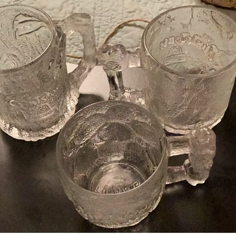 Set of three Flintstones McDonald’s, coffee cups glass set you will get three of them rock Donald rock Road mug 2 are mare in France by McDonald’s corporation. 1 is made in USA