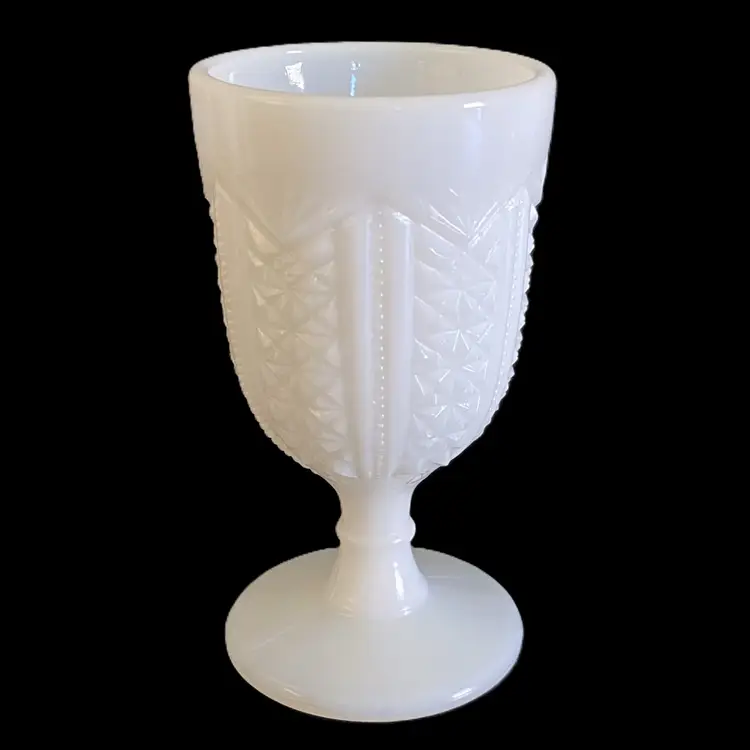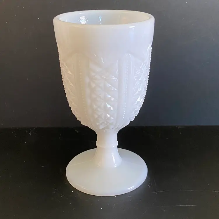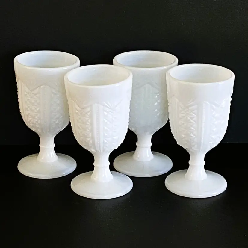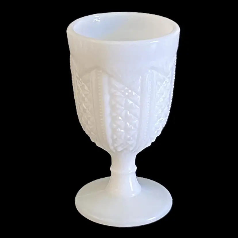 Vintage McKee EAPG milk glass wine glasses. Made from pressed milk glass with a zipper and diamond pattern called Rainbow. Small size for sherry or cordials, they each hold 2 oz. of fluid.