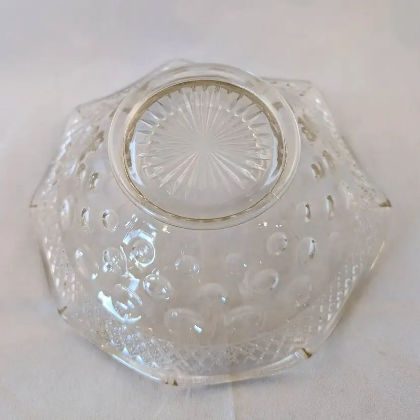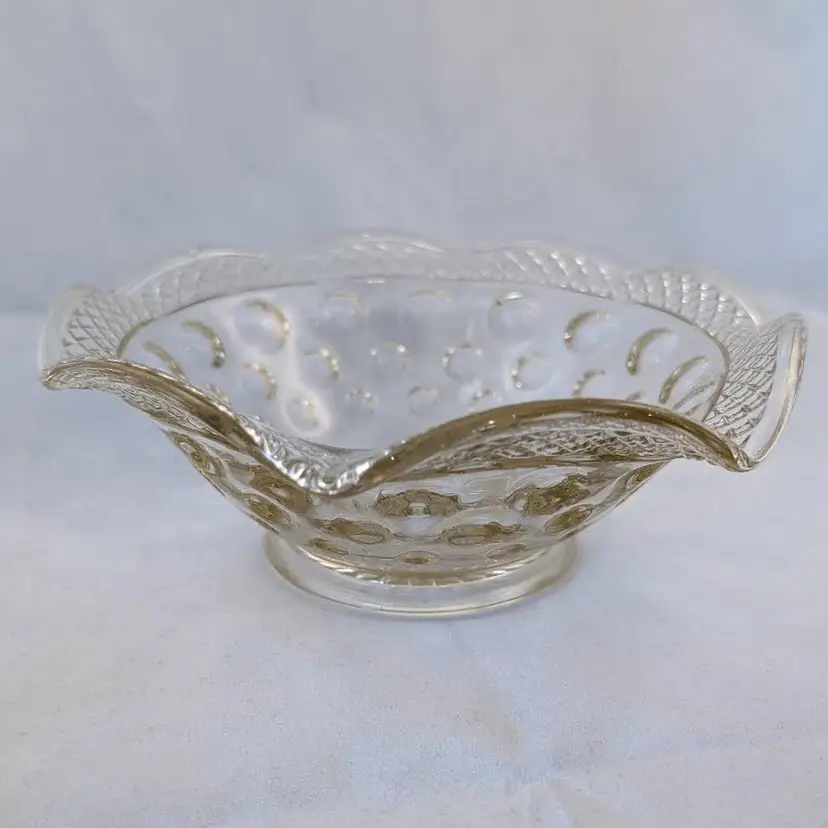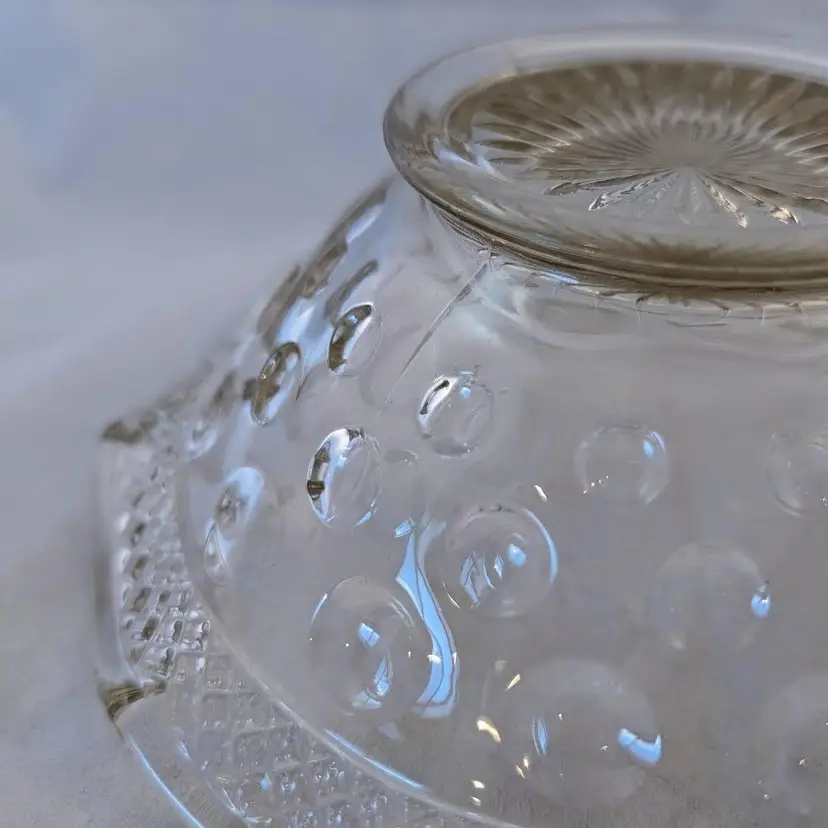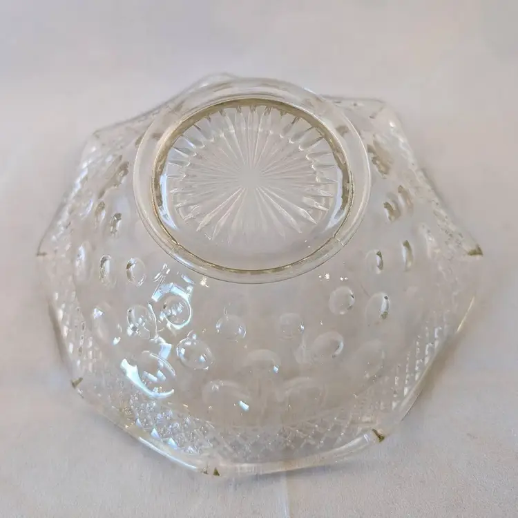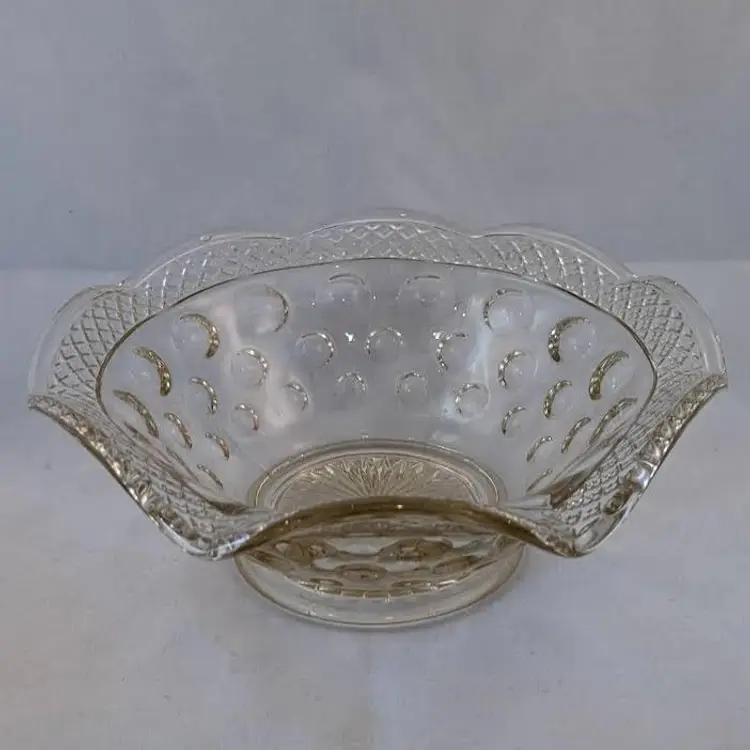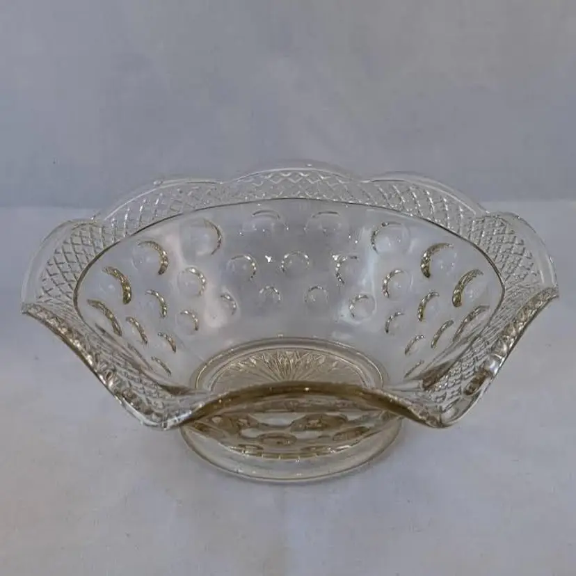 This beautiful bowl was made by McKee Glass Co and is their Opal Pattern. It features a crosshatch boarder and a concave thumbnail/dot design. It is clear glass but has a slight golden tint to it. It is in excellent, used condition but has a few bubbles in the glass and seam lines.