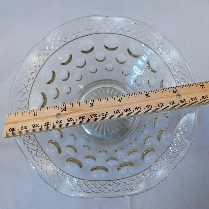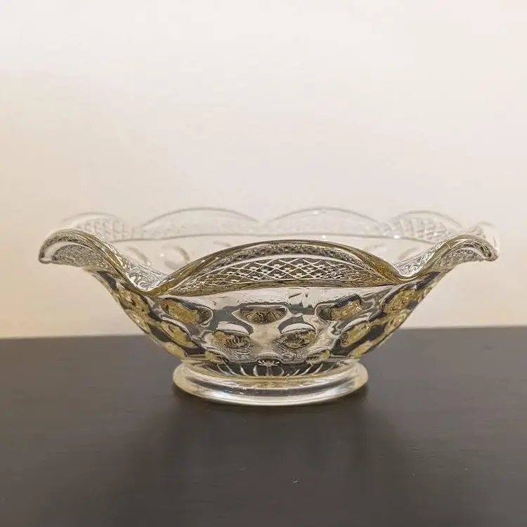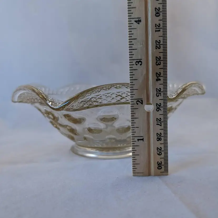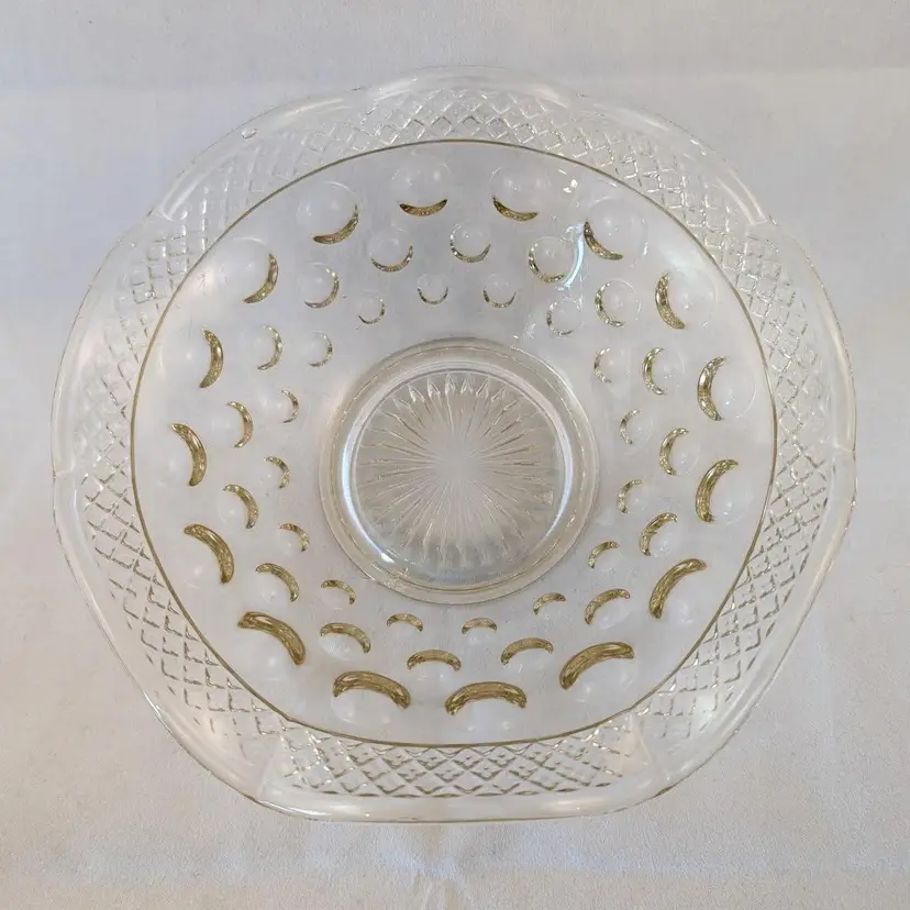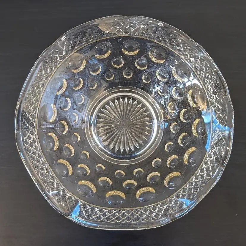 This beautiful bowl was made by McKee Glass Co and is their Opal Pattern. It features a crosshatch boarder and a concave thumbnail/dot design. It is clear glass but has a slight golden tint to it. It is in excellent, used condition but has a few bubbles in the glass and seam lines.