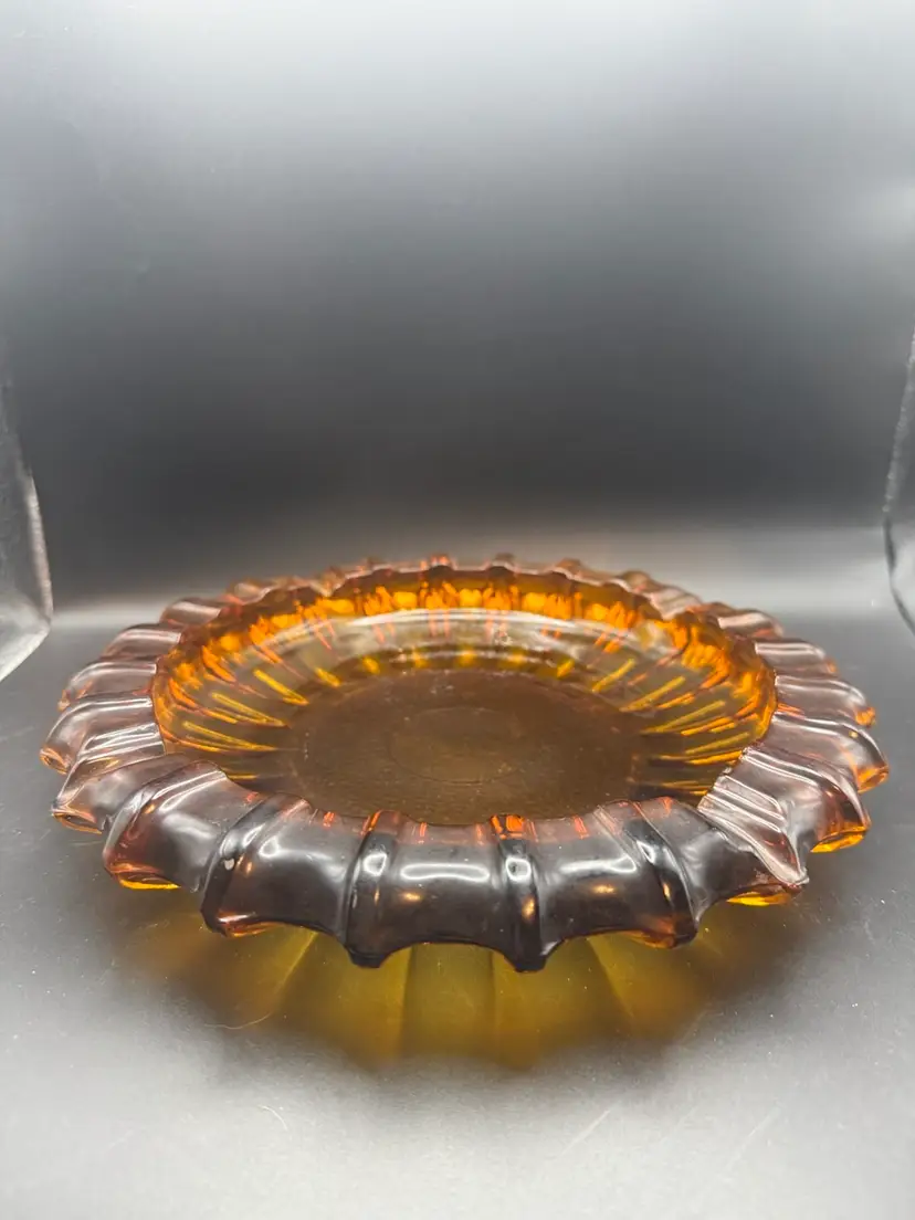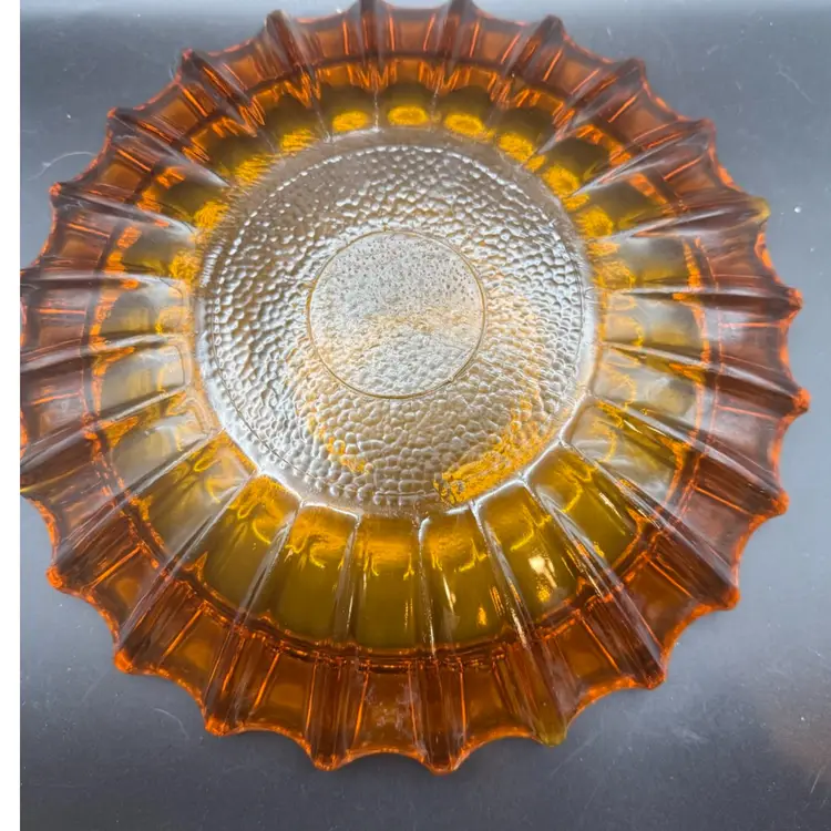 This is a 10in HEAVY Blenko ashtray from the 1960s with a starburst ribbed pattern.