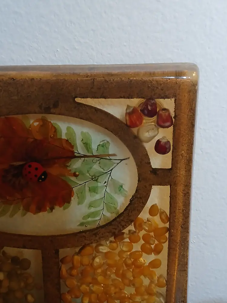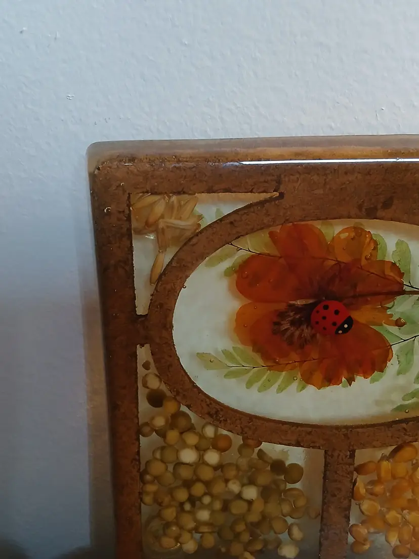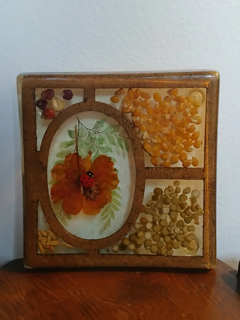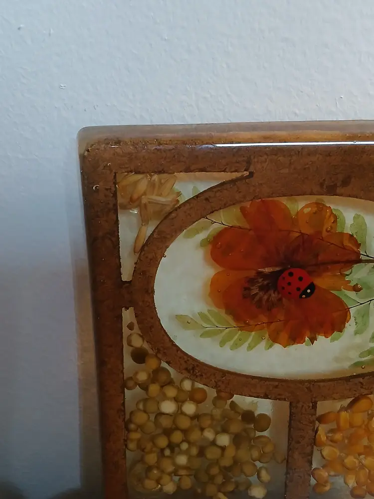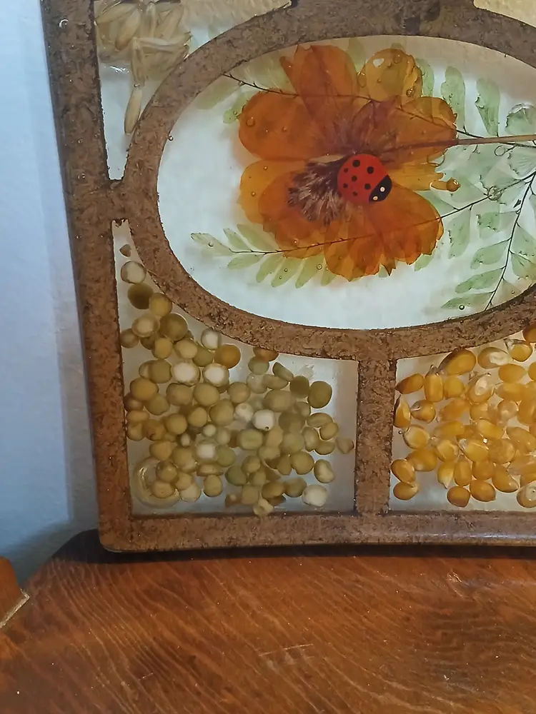 Beautiful vintage lucite footed trivet with a botanical theme. Cork border with 5 cutout sections, each containing different items; pressed orange flower with painted ladybug, corn, lentils, seeds and grains. Perfect addition to your MCM kitchen or kitsch collection.