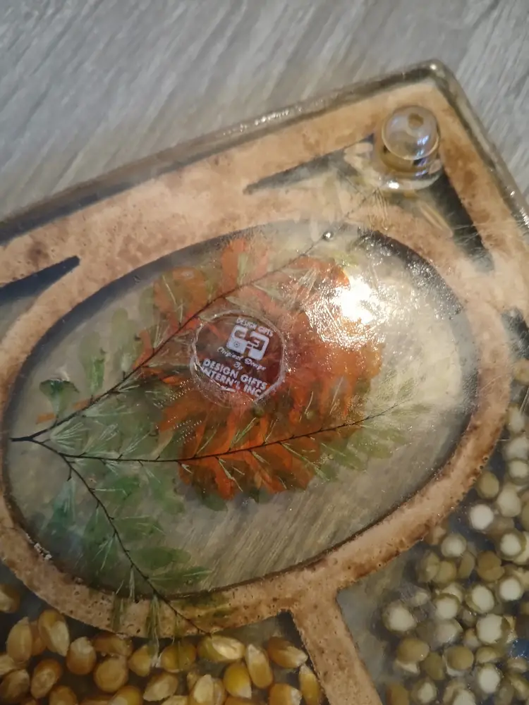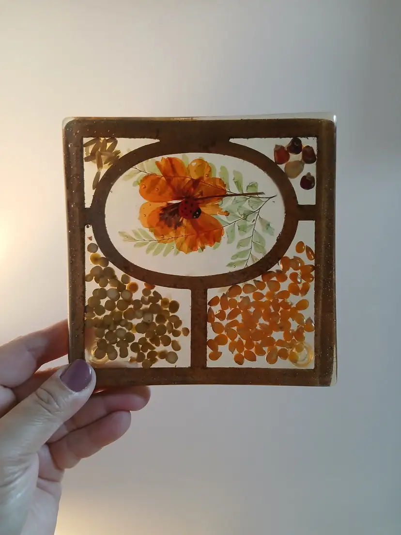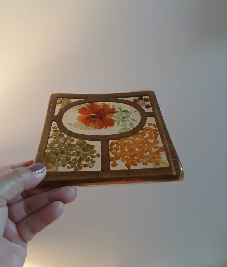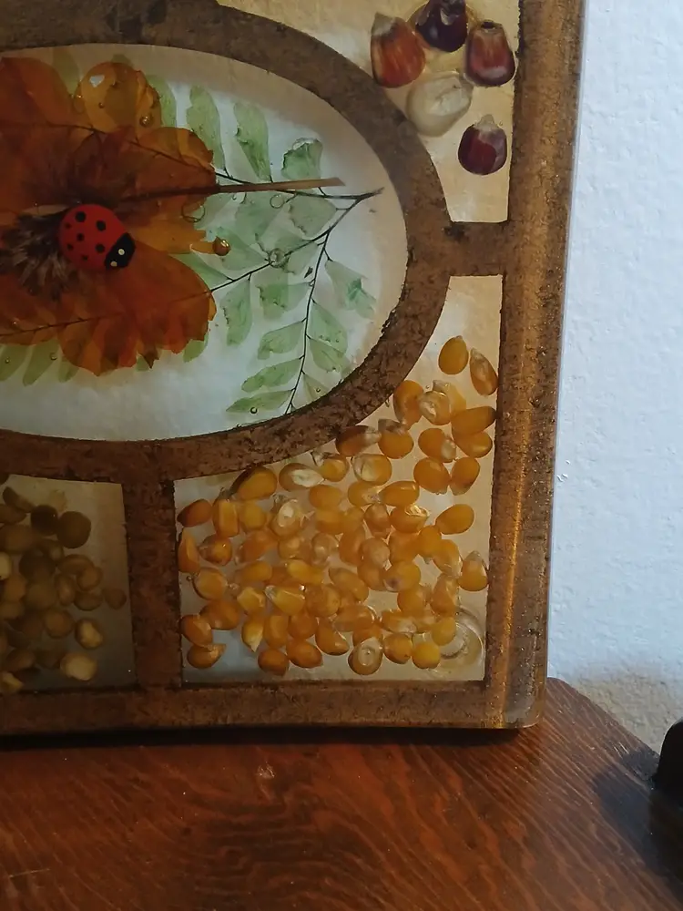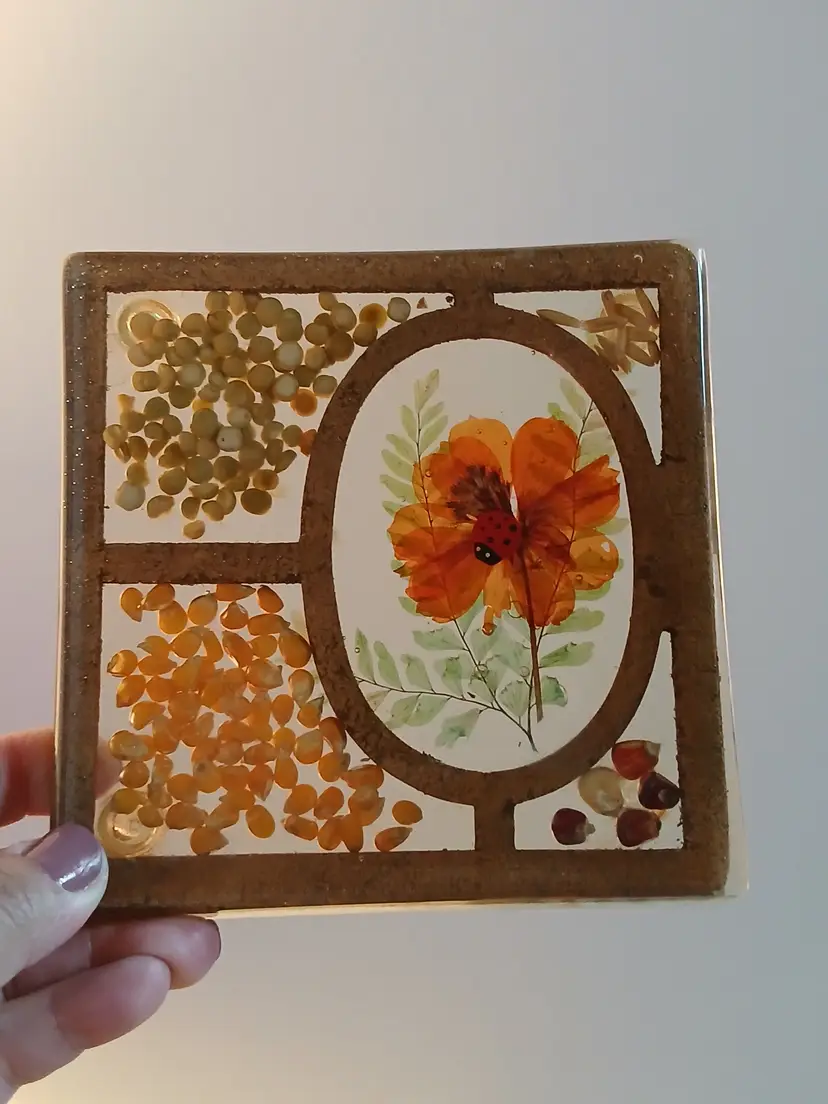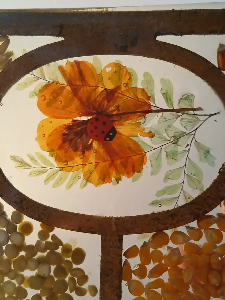 Beautiful vintage lucite footed trivet with a botanical theme. Cork border with 5 cutout sections, each containing different items; pressed orange flower with painted ladybug, corn, lentils, seeds and grains. Perfect addition to your MCM kitchen or kitsch collection.
