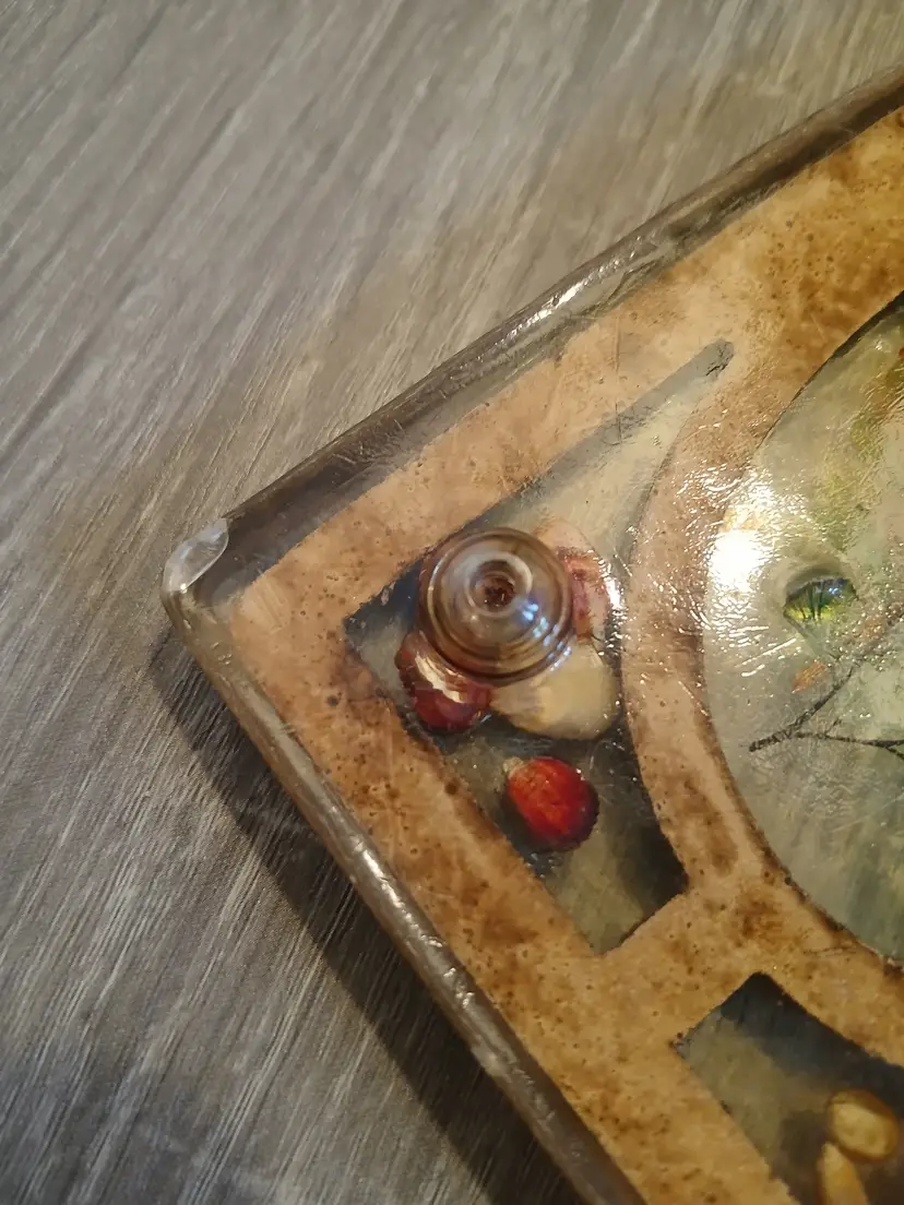 Measures approximately 5.5" x 5.5" square. Original makers sticker on back. In very good pre-owned condition, with 1 small corner chip in resin.