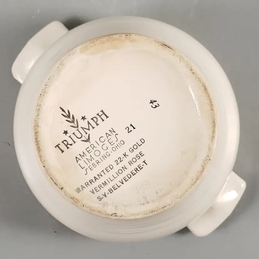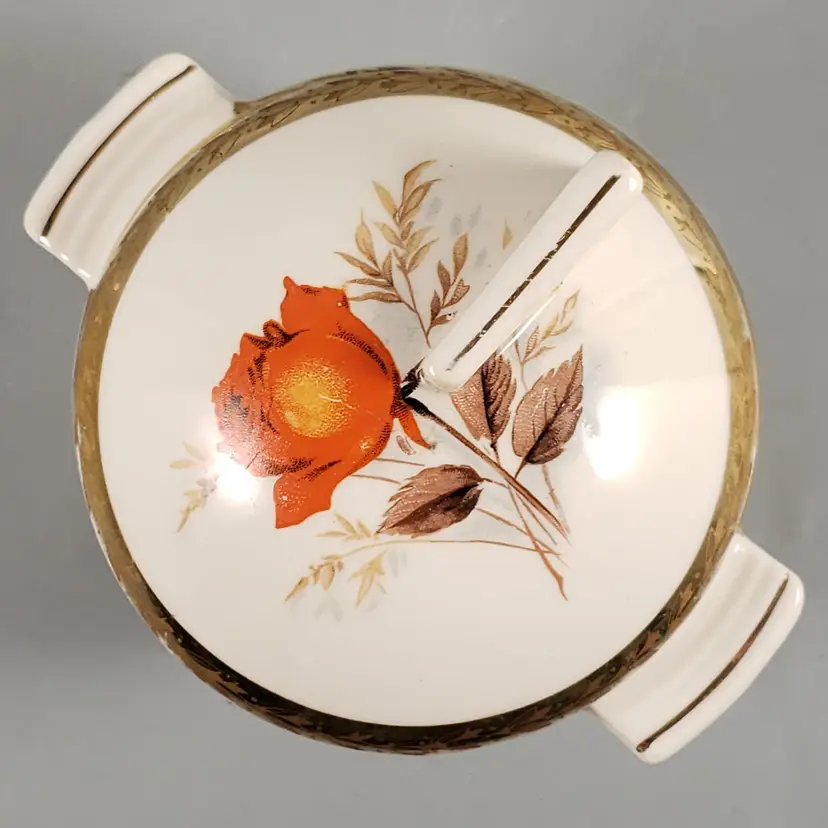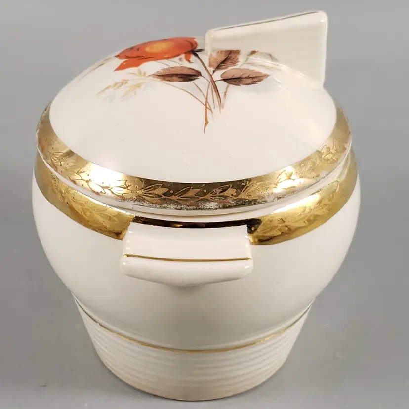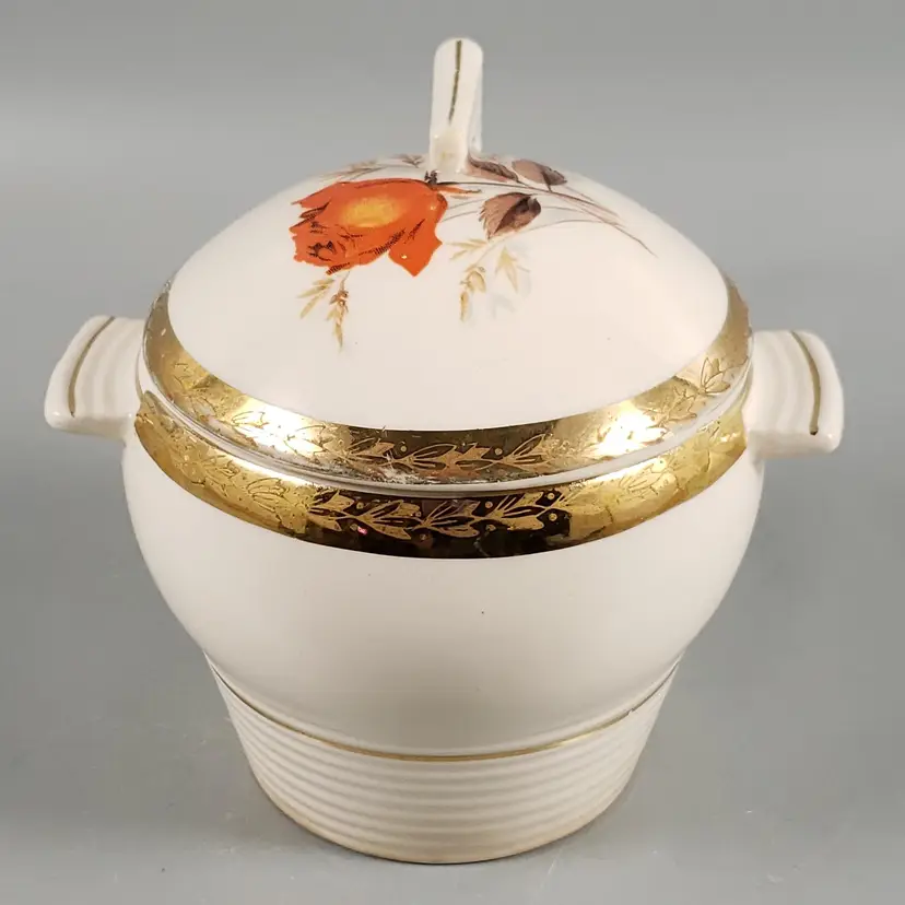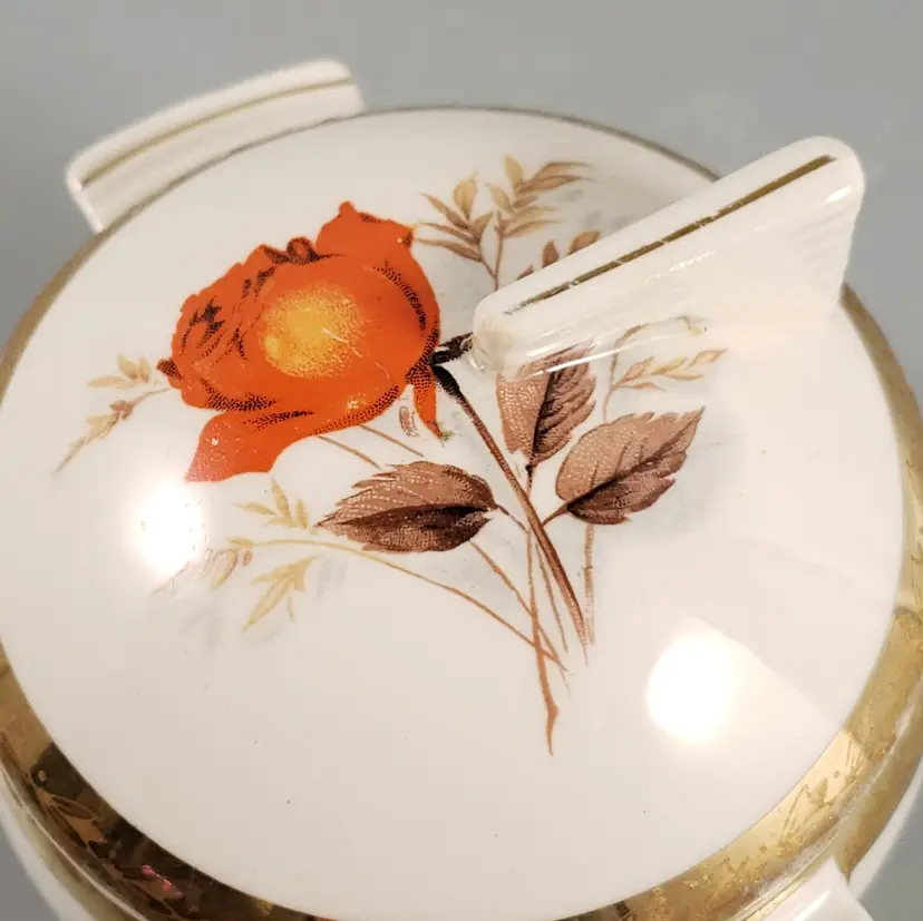 • Ceramic • Round body with "futuristic" style handles • Transfer print, decal rose • Stenciled gold trim with floral design around border & gold accents on handles • Black stamp on base: