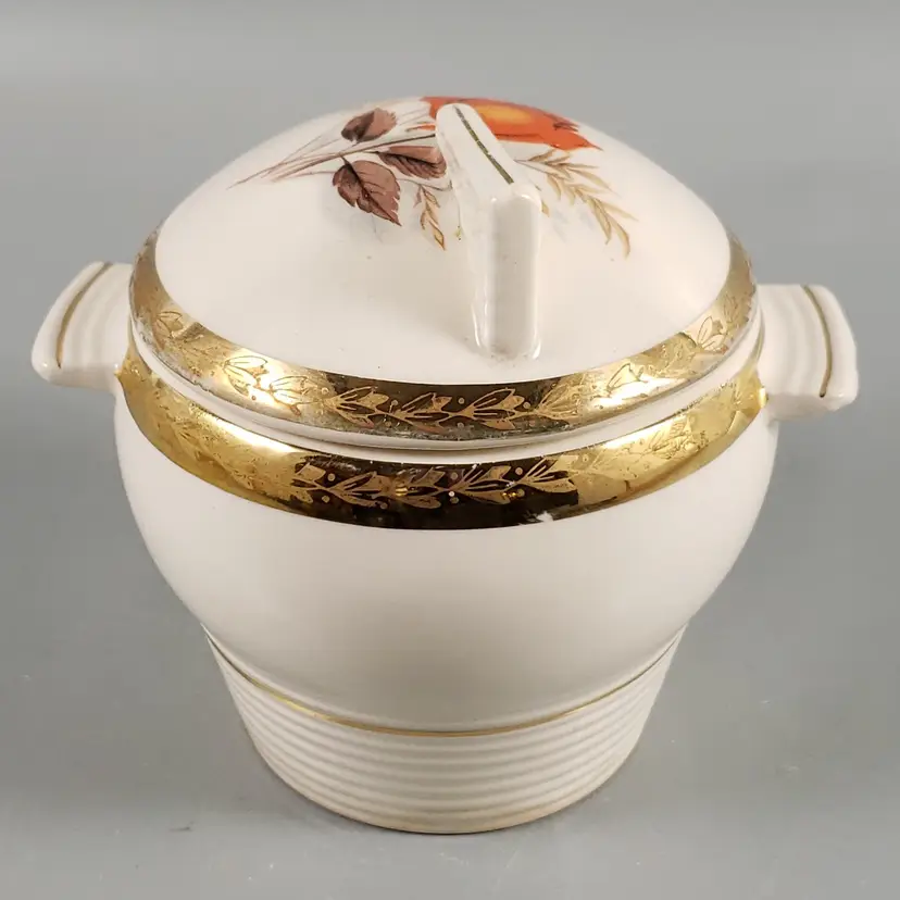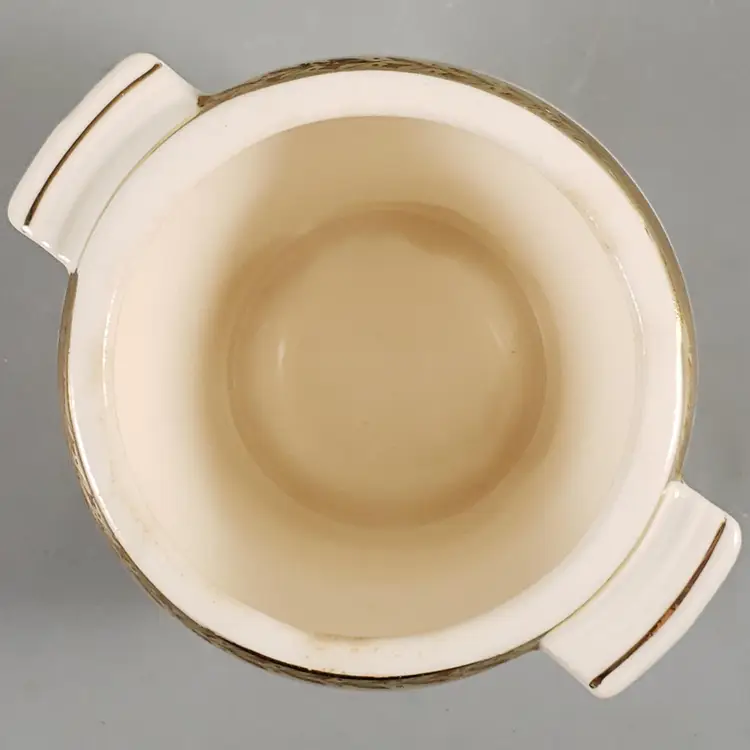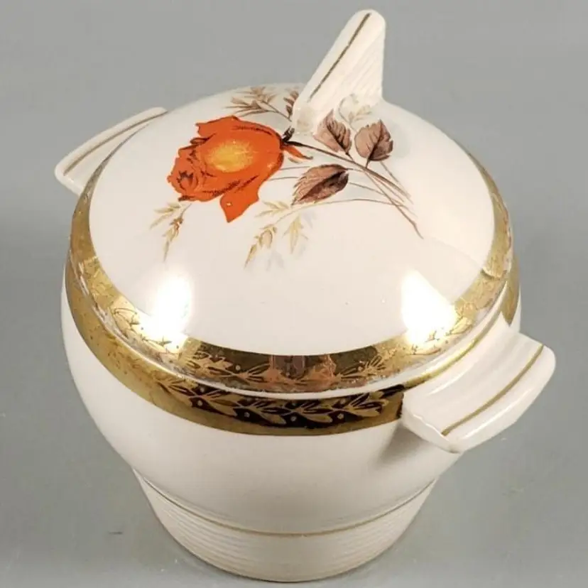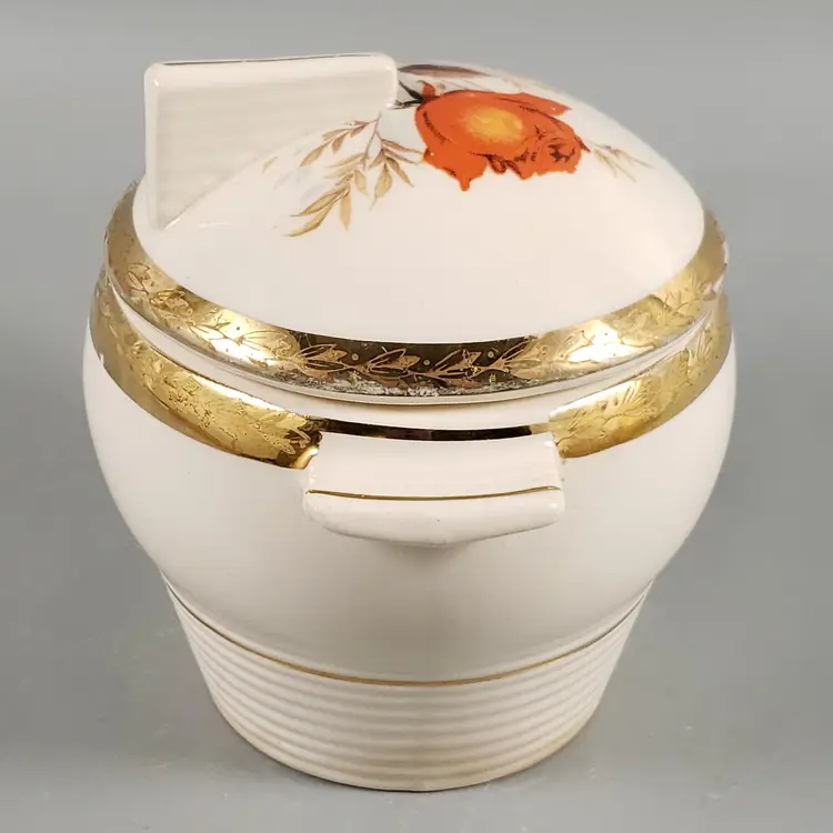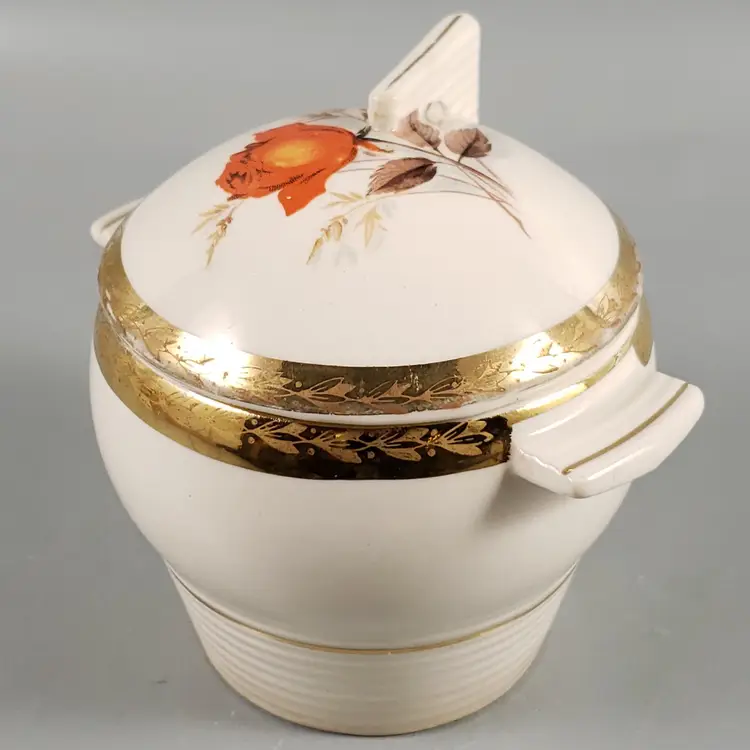 • Ceramic • Round body with "futuristic" style handles • Transfer print, decal rose • Stenciled gold trim with floral design around border & gold accents on handles • Black stamp on base: