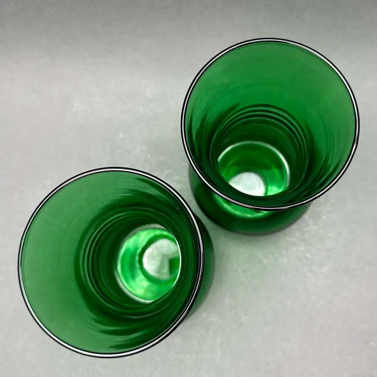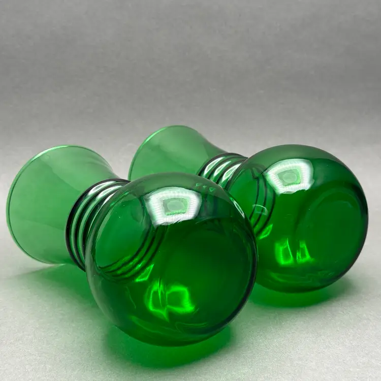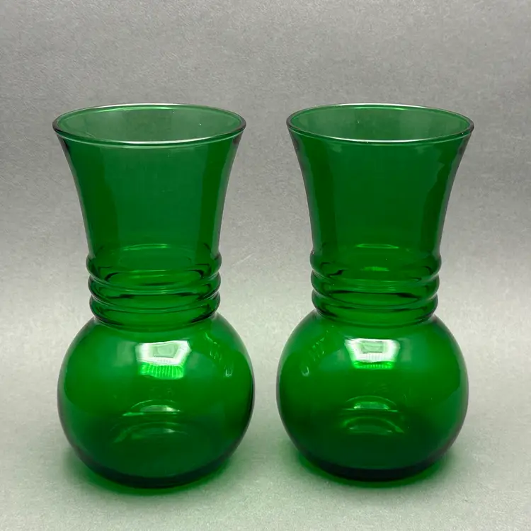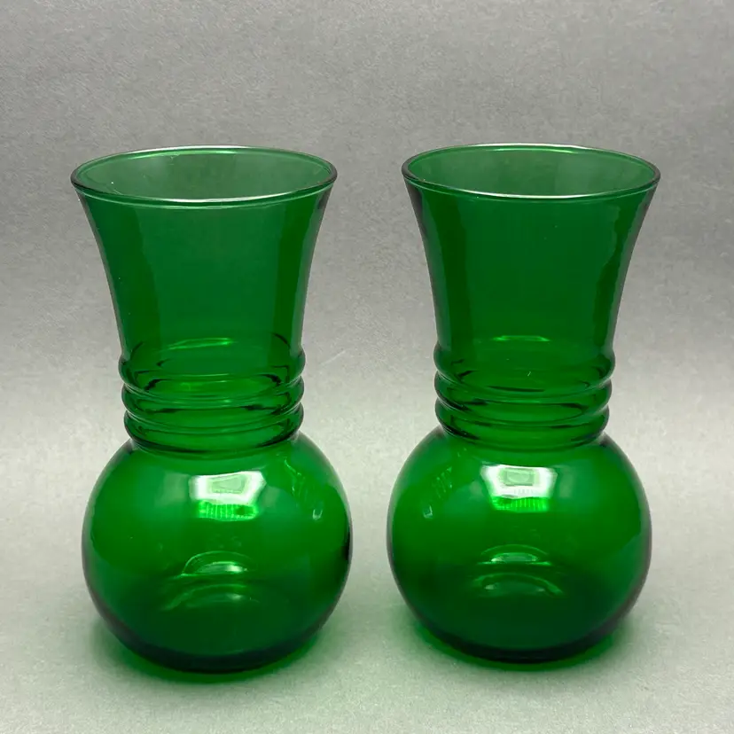Vintage pair of MCM Anchor Hocking forest green ribbed glass vases. They are a bold green color with a bulbous lower body, ribbed center leading up to a flared rim.