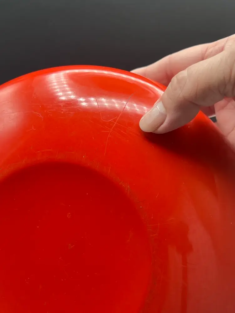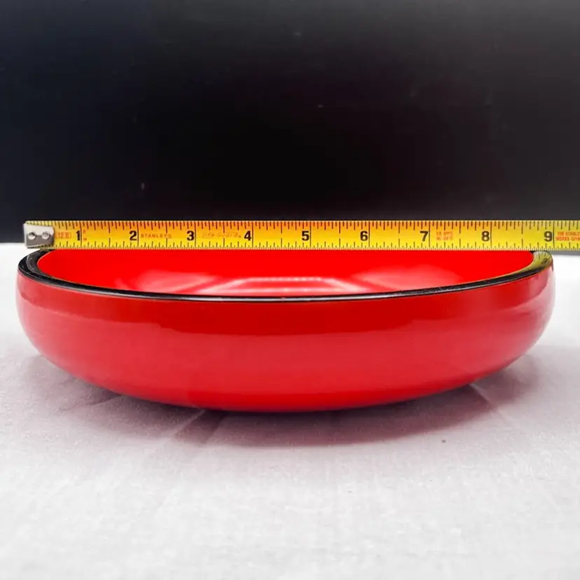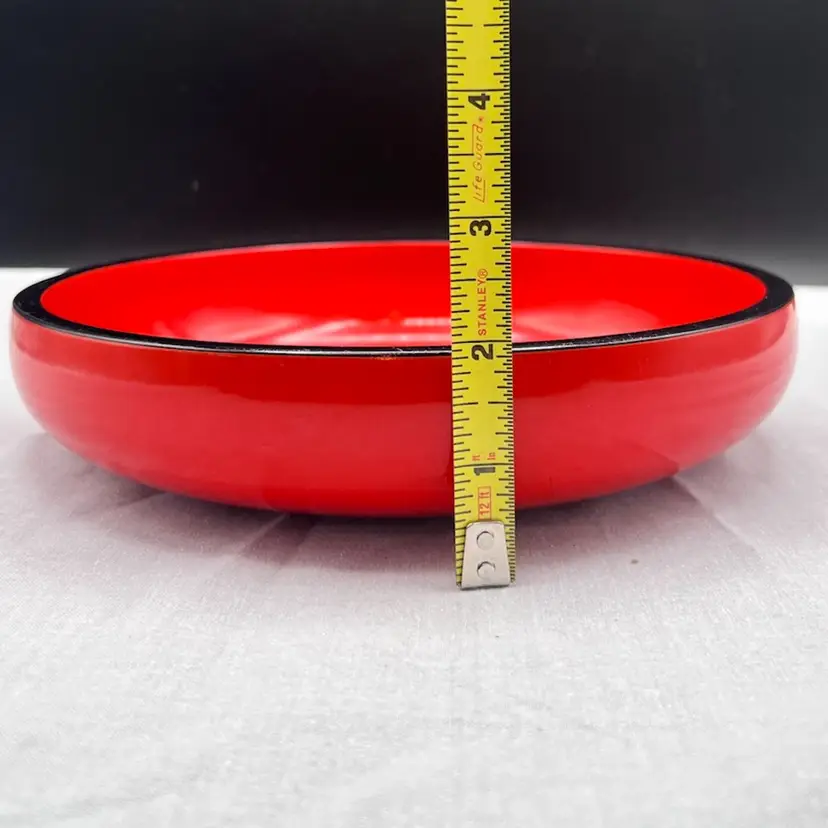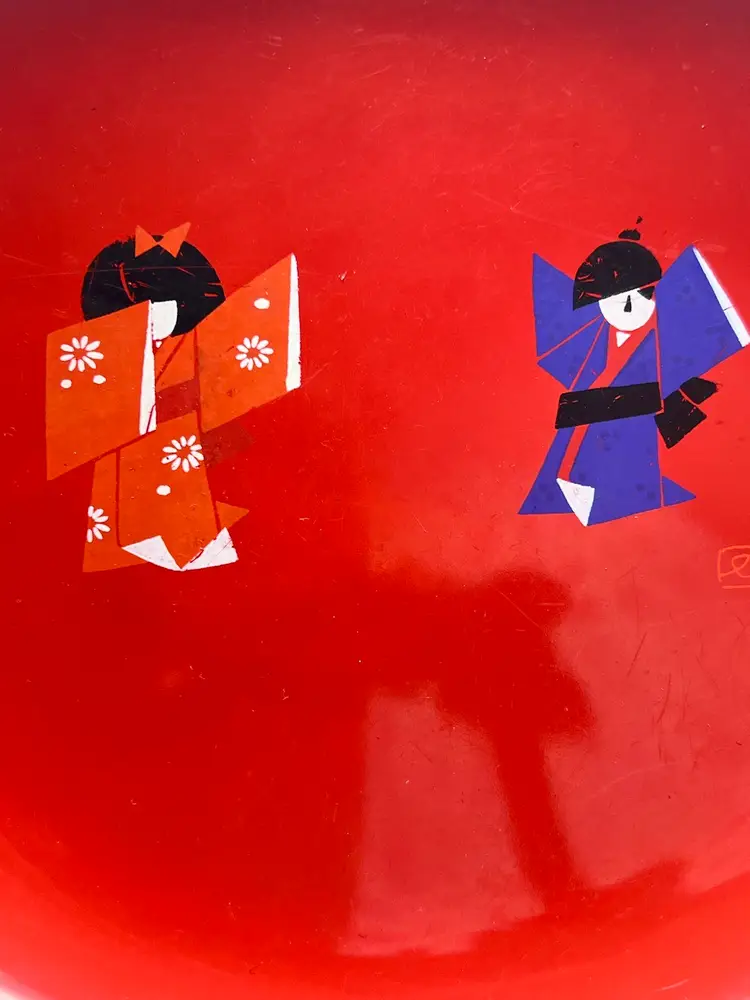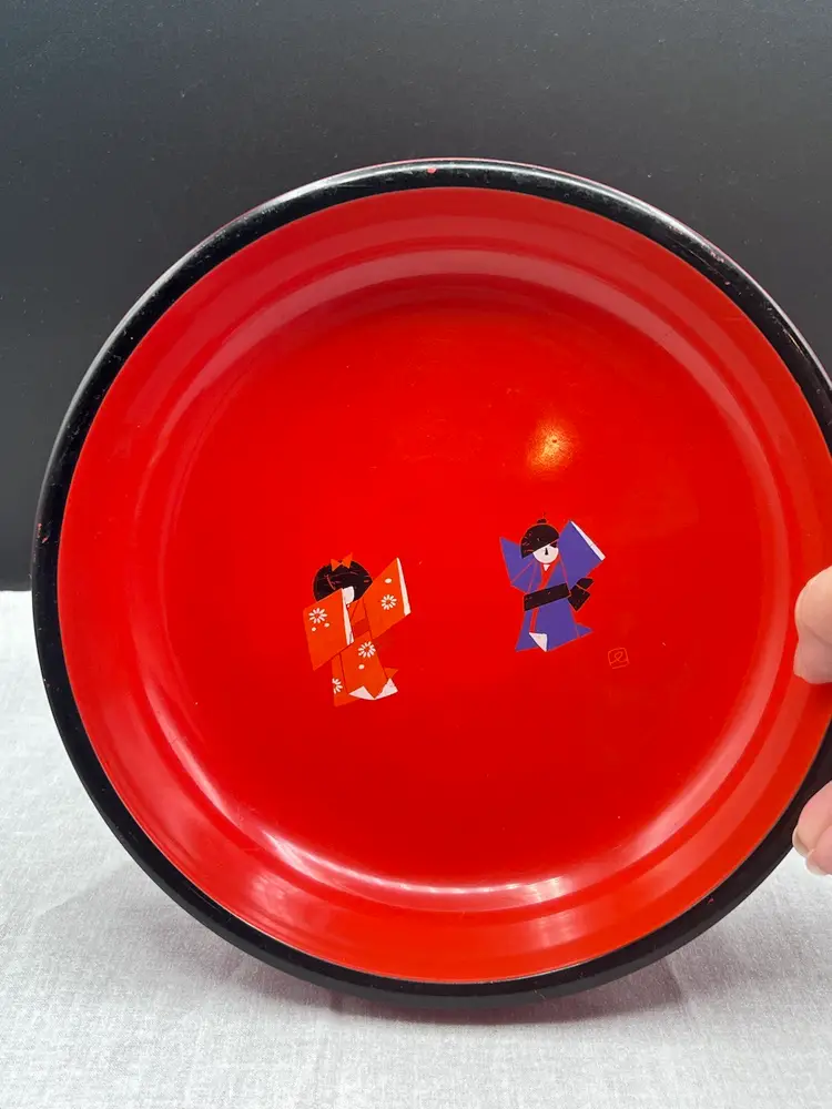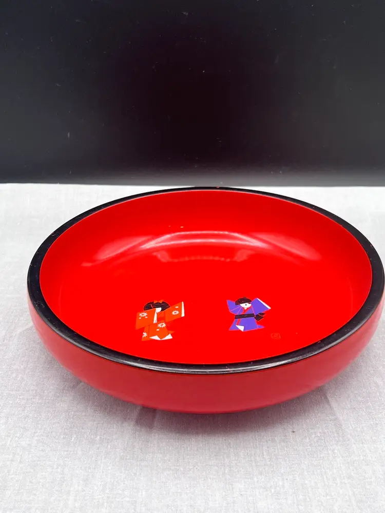 Beautiful Vintage MCM Asian Red Lacquerware Bowl Two People/Children Doing Karate/Exercise 9" in diameter x 2" depth In good vintage condition, there are a couple spots on the people that the paint is worn - see pics for details Sticker on back Japan