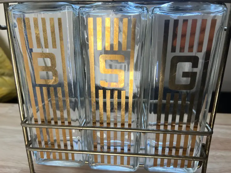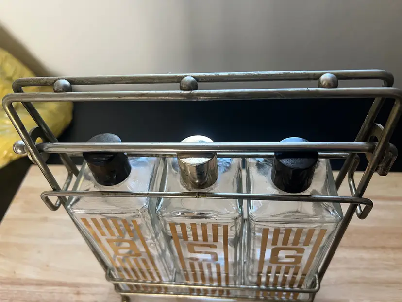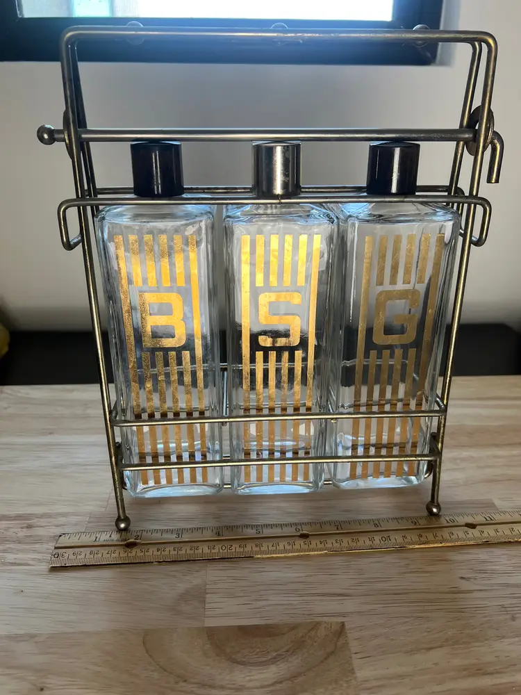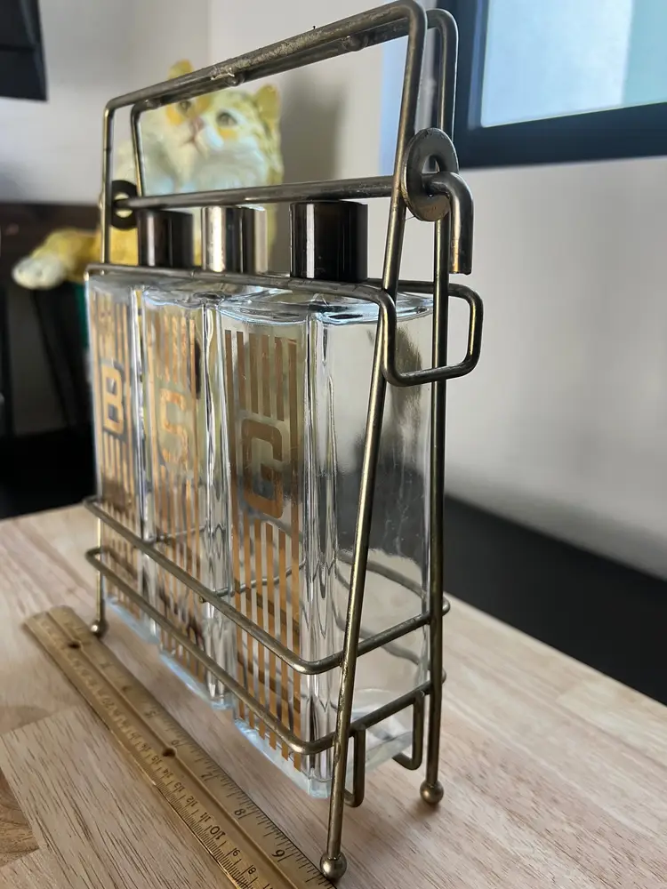 MCM Barware Decanter Bottle Carrying Caddy, Gin, Scotch, Bourbon. This set is in good condition. Slight wear on some of the paint on the bottles. Normal wear overall for it's age. Metal holder needs to be cleaned. See pics.