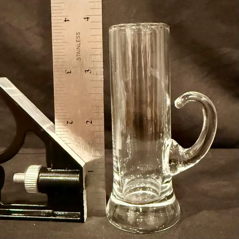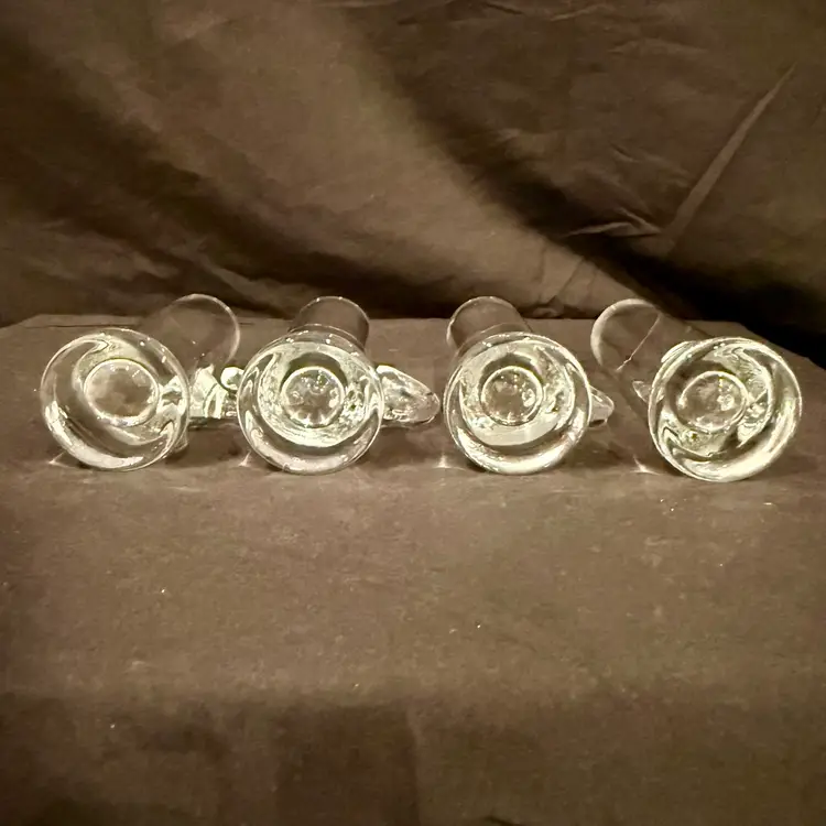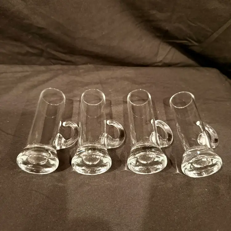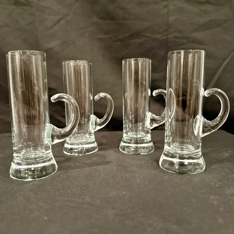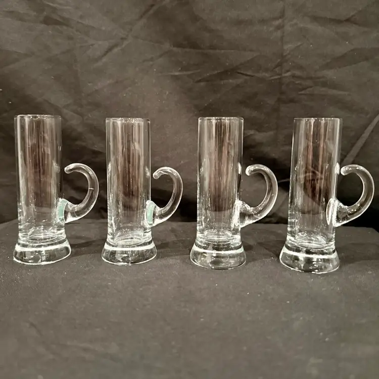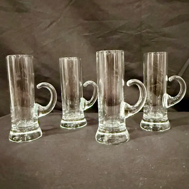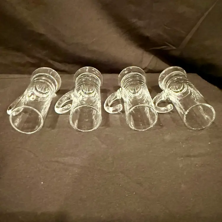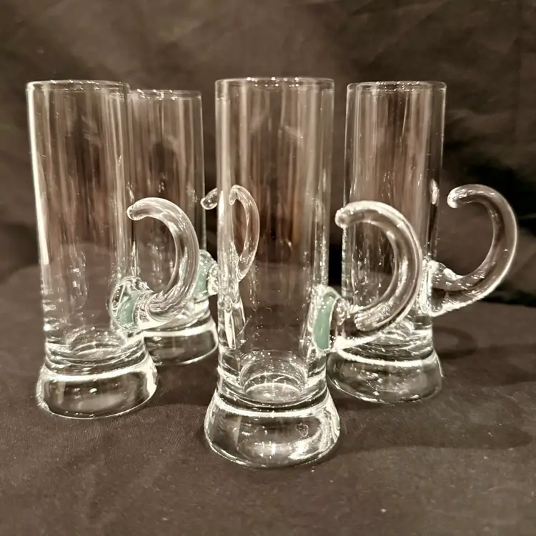 This vintage MCM barware set consists of four hand-blown liqueur cordial aperitif shot glasses with elegant crystal handles, measuring 4 inches in height. The Mid-Century Modern style and original production make them a unique addition to any drinkware collection. Made of glass in a clear color, these handmade pieces exude a sophisticated and timeless charm, perfect for enjoying a special drink or cocktail in style.