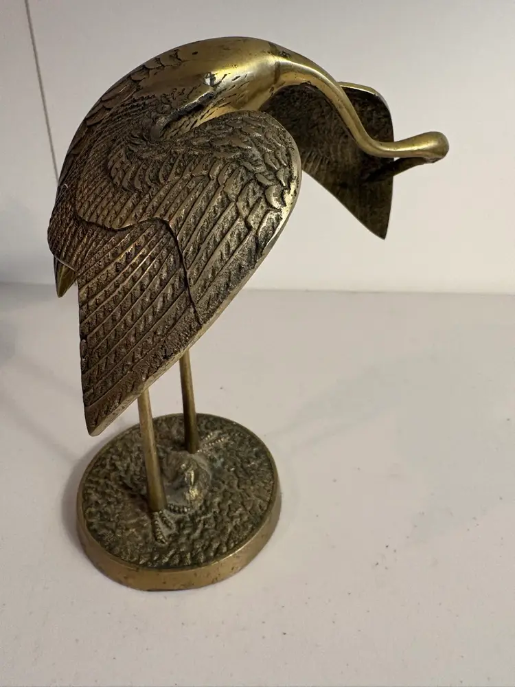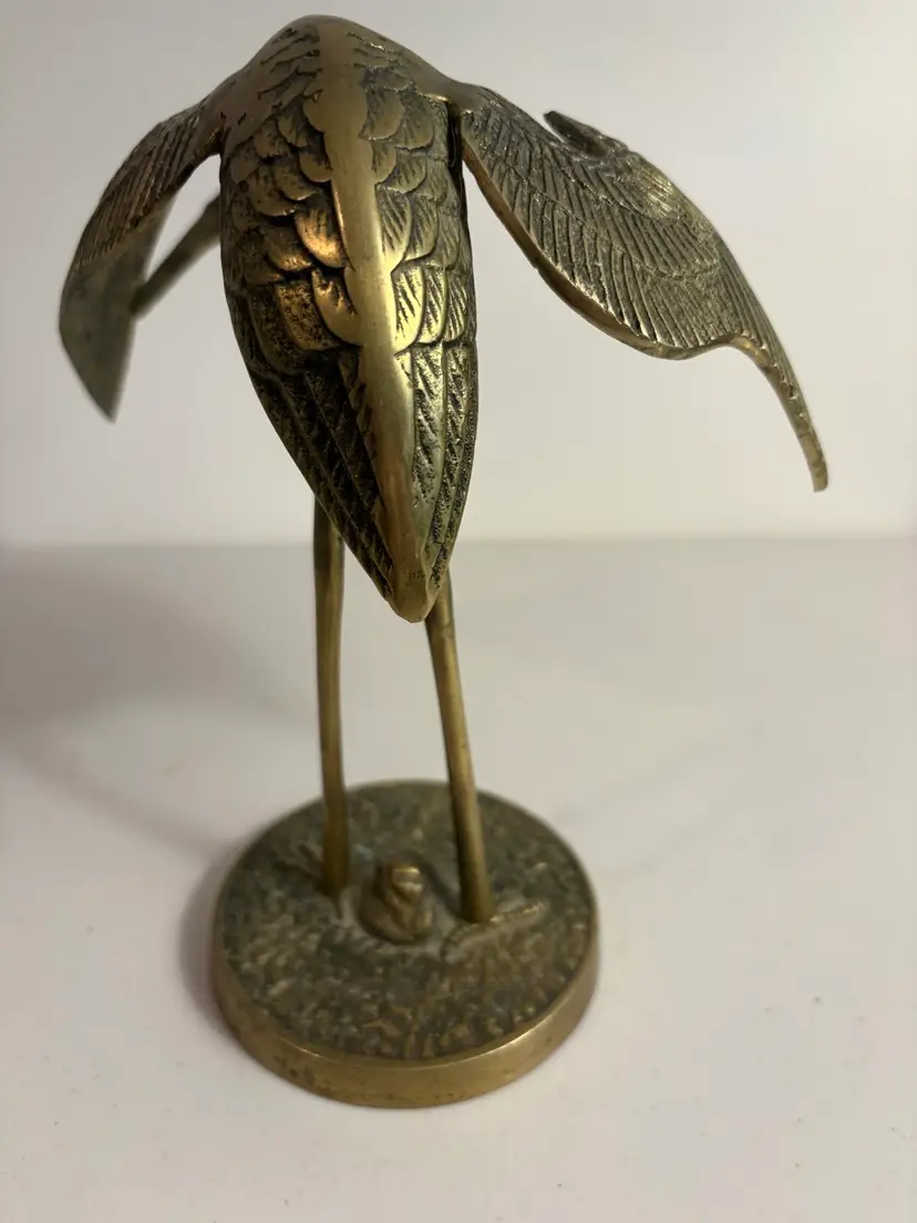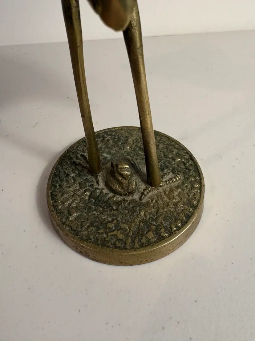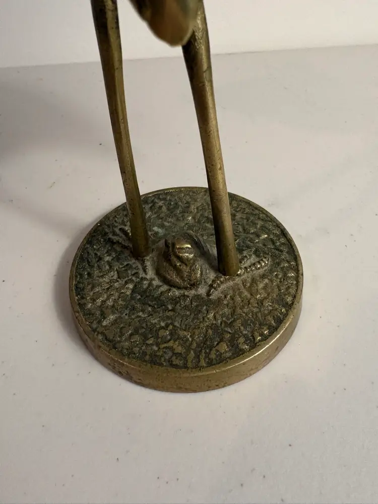 This vintage MCM brass crane egret heron statue sculpture is a beautifully handcrafted figurine made of brass, featuring a natural patina that adds to its charm. Originating from Korea, Republic of, this coastal bird sculpture captures the essence of nature with its intricate design and craftsmanship. Perfect for collectors of metalware or those who appreciate unique decorative pieces, this piece adds a touch of elegance and nostalgia to any space.