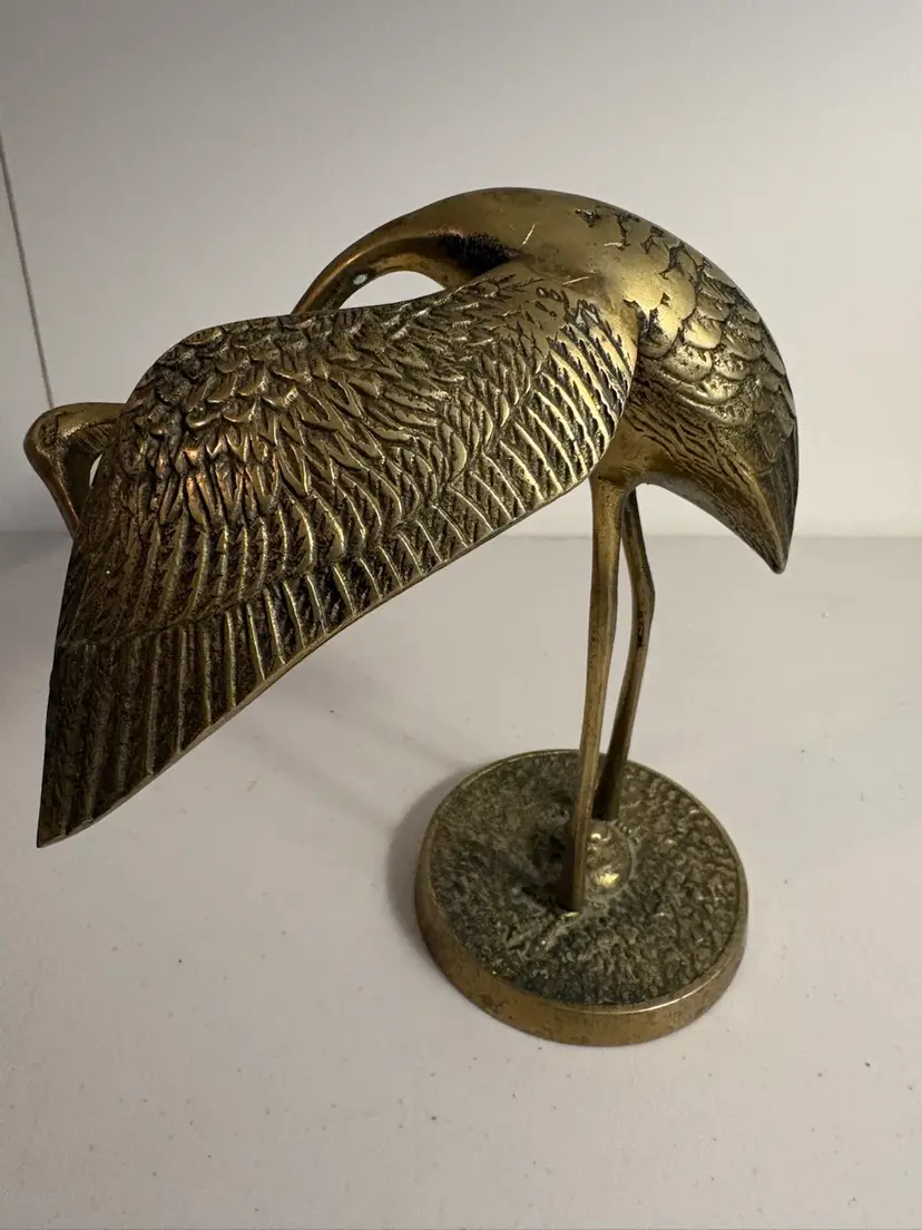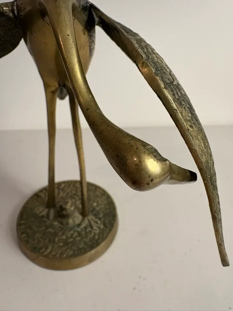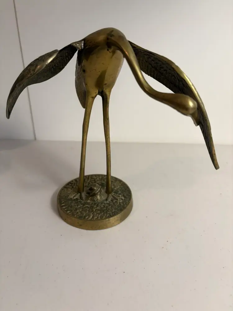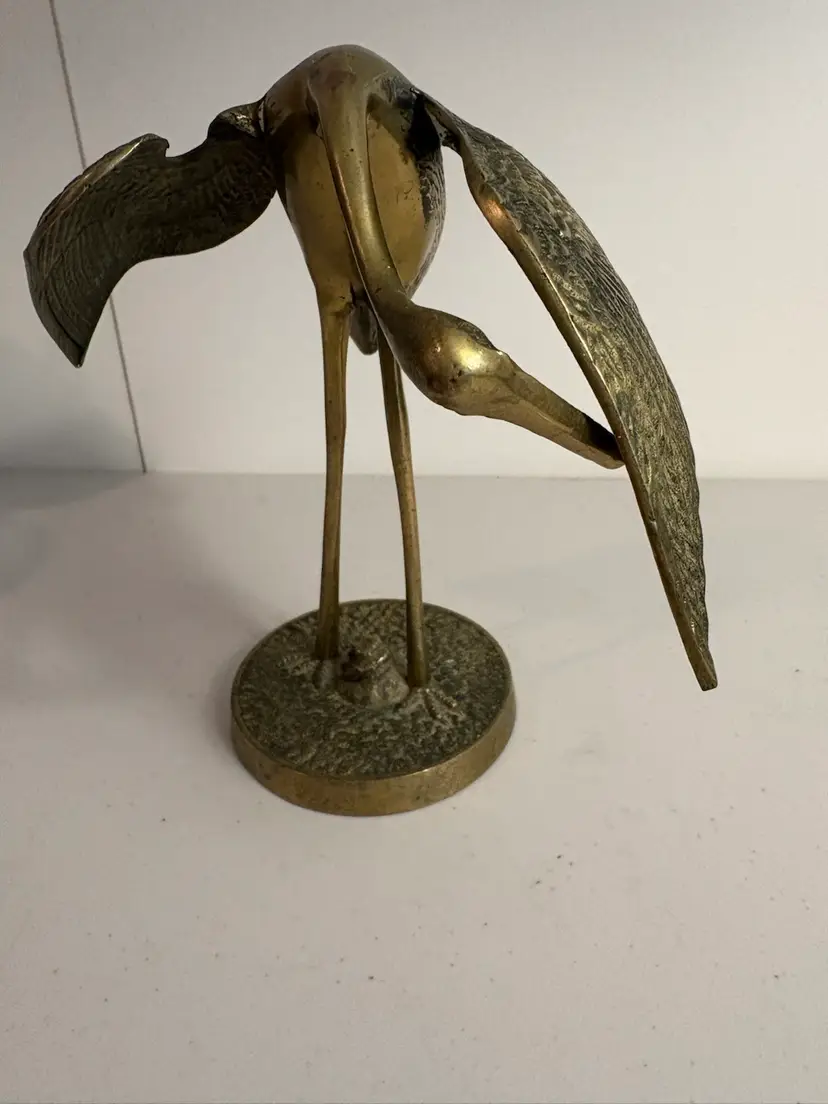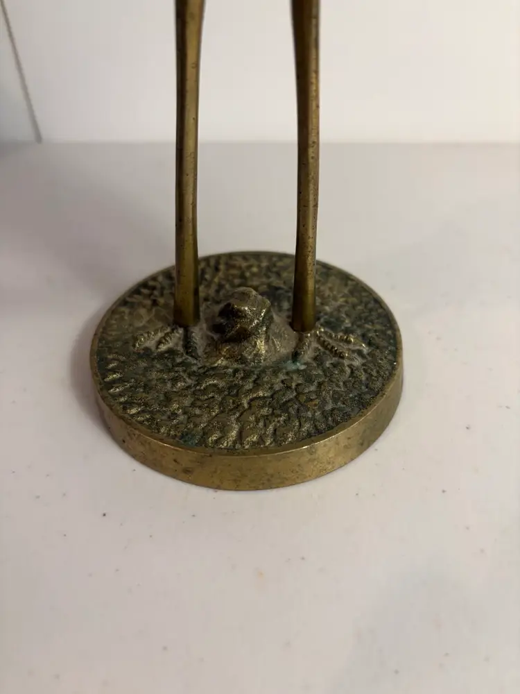 This vintage MCM brass crane egret heron statue sculpture is a beautifully handcrafted figurine made of brass, featuring a natural patina that adds to its charm. Originating from Korea, Republic of, this coastal bird sculpture captures the essence of nature with its intricate design and craftsmanship. Perfect for collectors of metalware or those who appreciate unique decorative pieces, this piece adds a touch of elegance and nostalgia to any space.