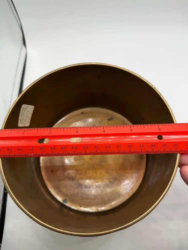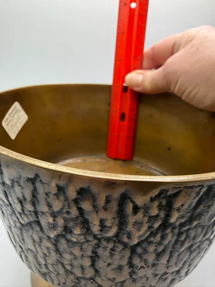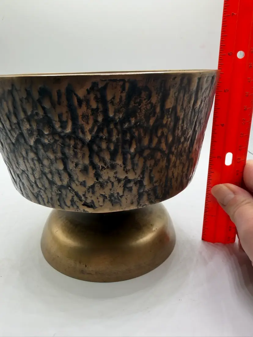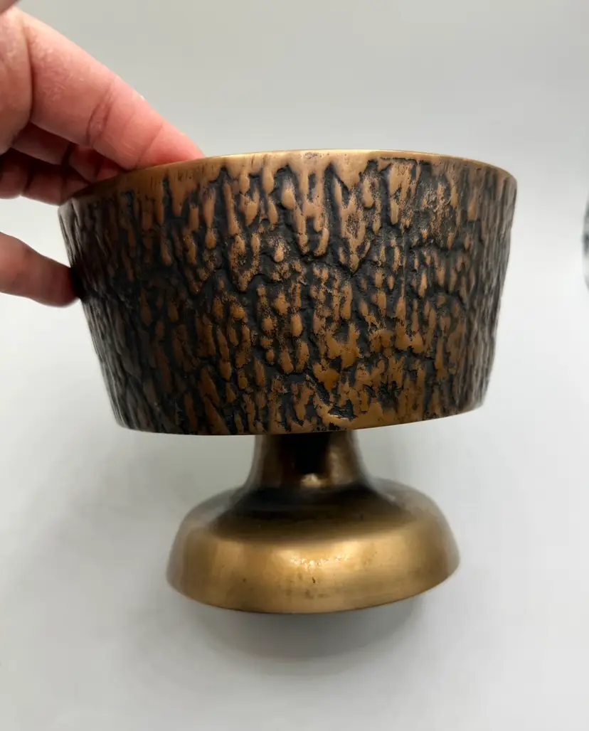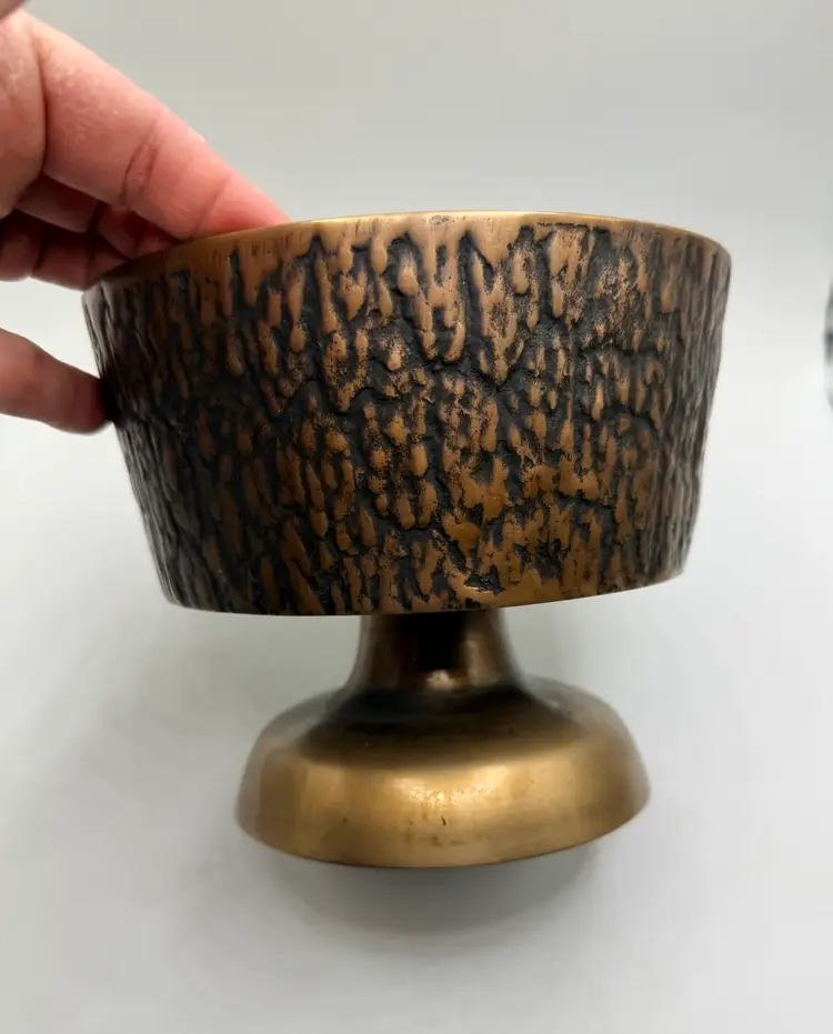 Stunning 1960’s MCM 5.5 inch tall x 6.75 inch wide pedestal brass bowl. Bowl part is 3 inches in depth. The outside is carved to look like tree. It still has its original stickers attached.