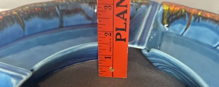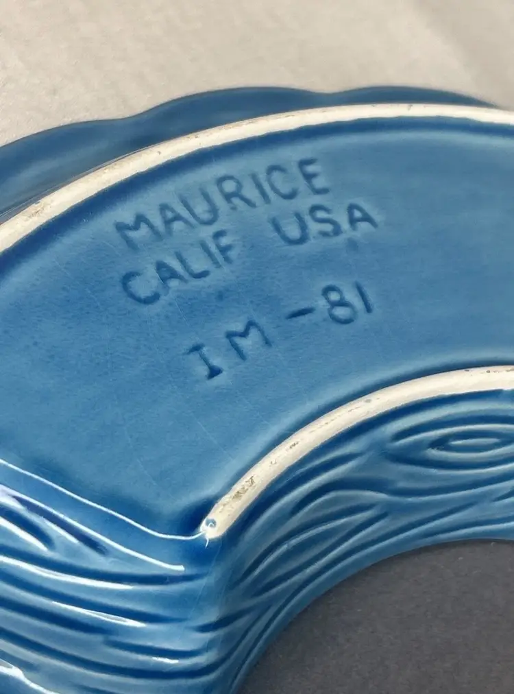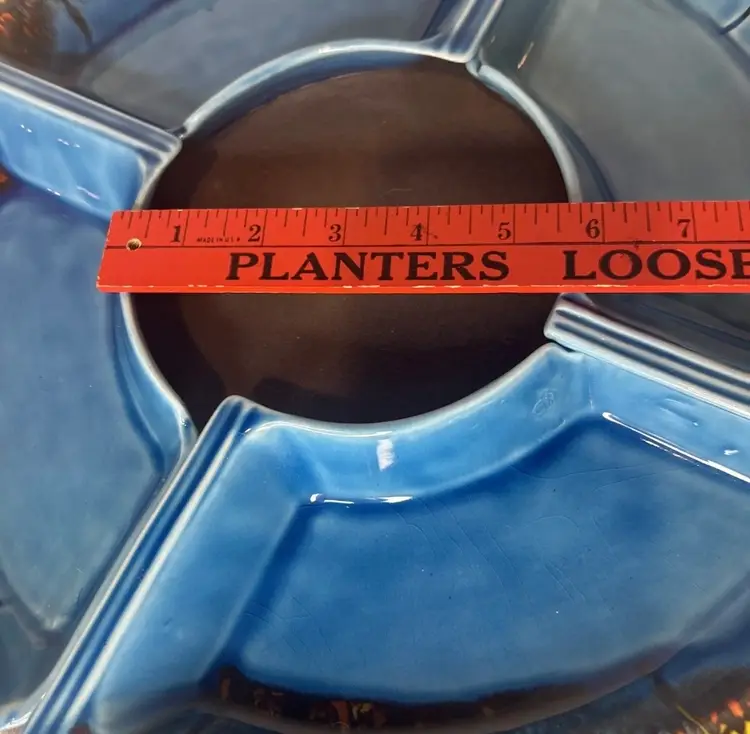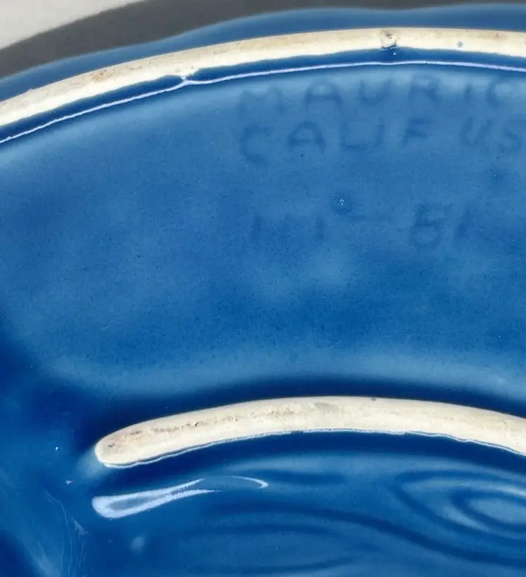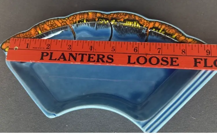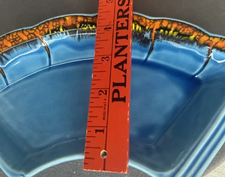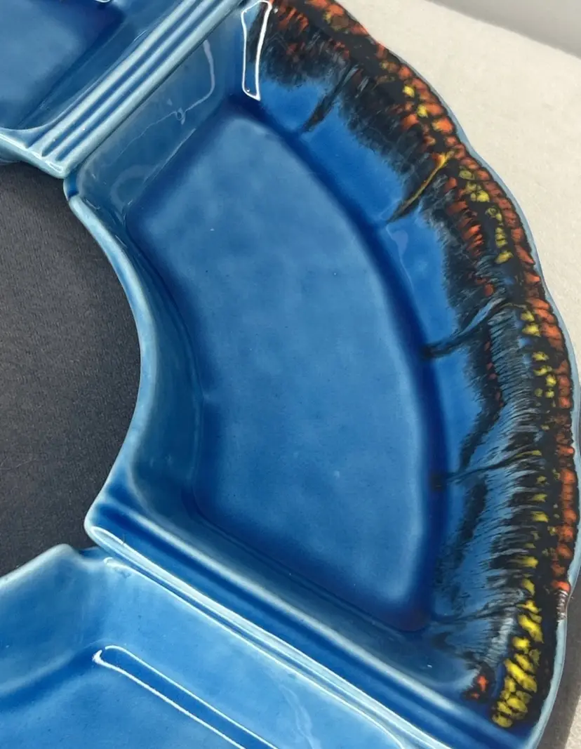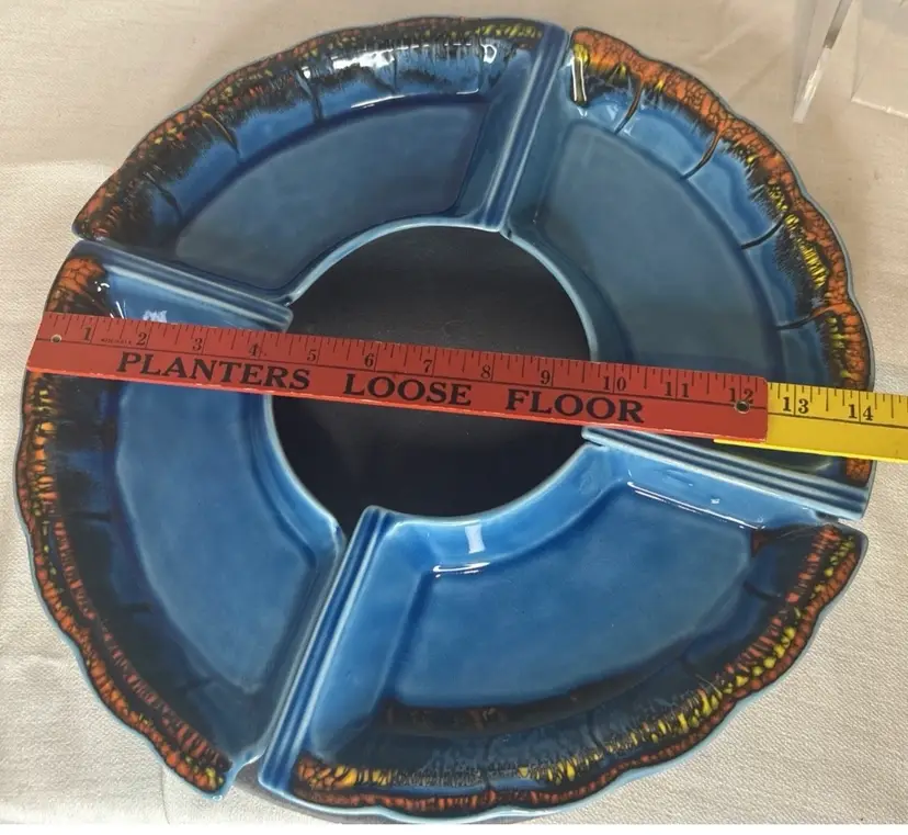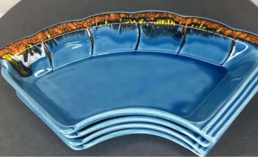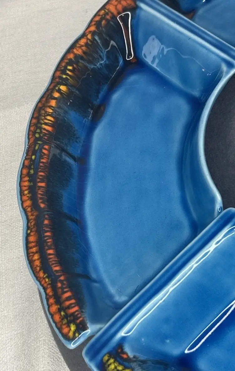 The Vintage MCM California Maurice Potter Turquois Fire Glaze Dip 4pc Set is a stunning piece of mid-century modern entertaining set that was made in America. The set includes four semi-circle unique turquoise fire glaze dishes made of ceramic by the California Pottery in their renowned Maurice pattern. This set exudes a retro charm with its vibrant blue color with wonderful orange and yellow accents that helps to identify its vintage and American style, making it a standout addition to any antique or midcentury dinning collection. Each piece measures approximately 9" inches long x 1.5" inches deep x 4.5"wide, when assembled they measure 14" in diameter with a 6" area for your bowl of choice. PLEASE ALSO NOTE THAT THERE ARE 2 SETS OF 4-PCS AVAILABLE Vintage MCM California Maurice Potter Turquois Fire Glaze Dip 4pc Set is in excellent vintage pre-owned condition, with NO chips or repairs. However, as with any vintage item it does show some slight wear in particular some crazing of the glaze. Please review all pictures for proper assessment of its excellent vintage pre-owned condition.