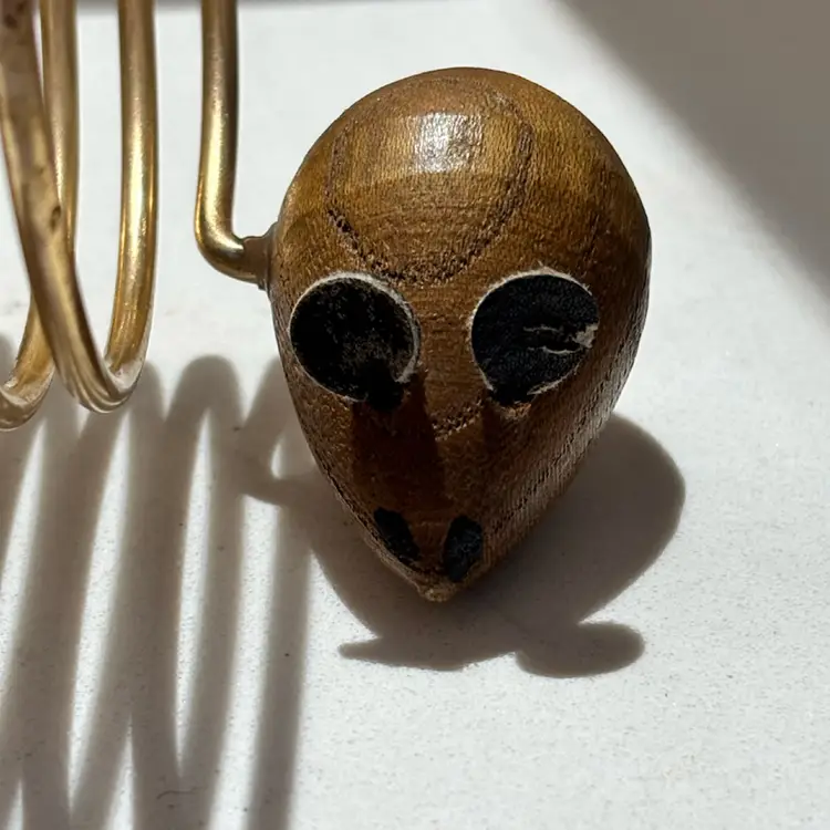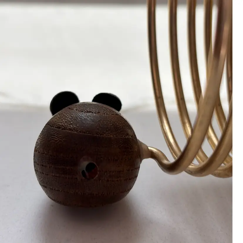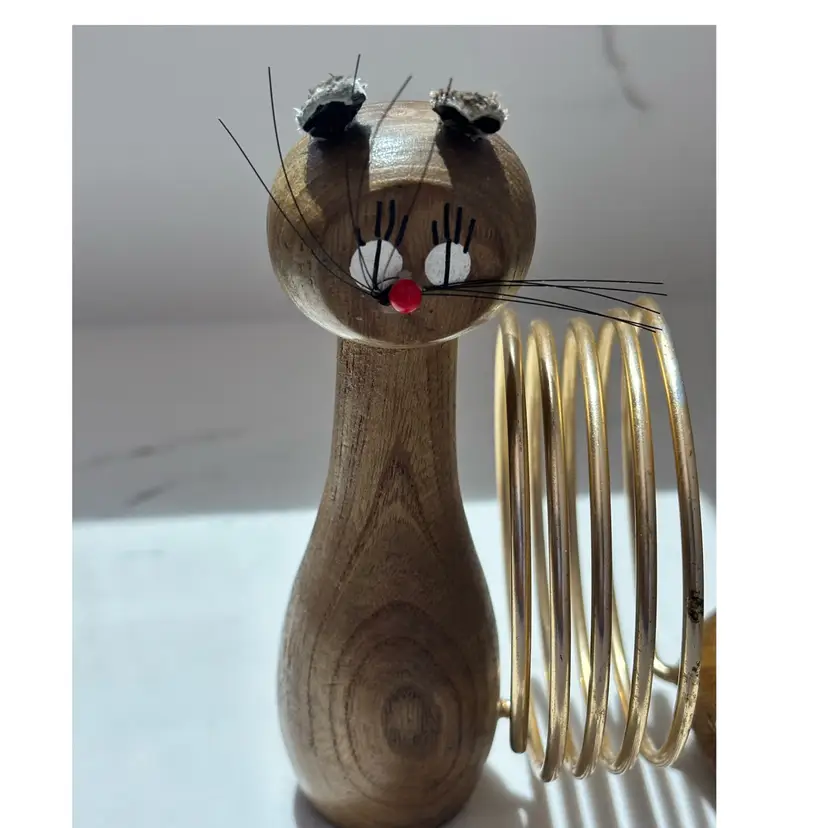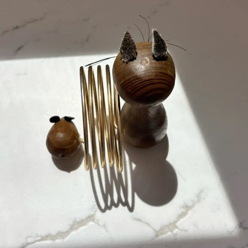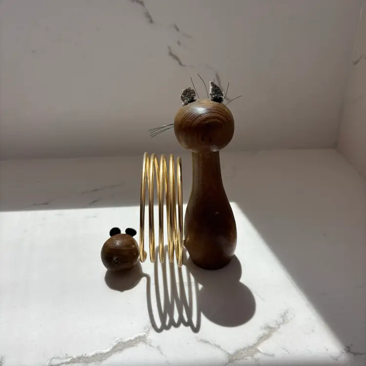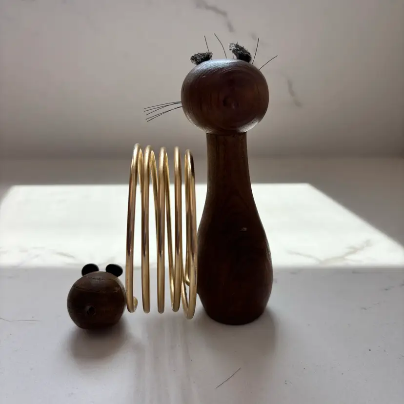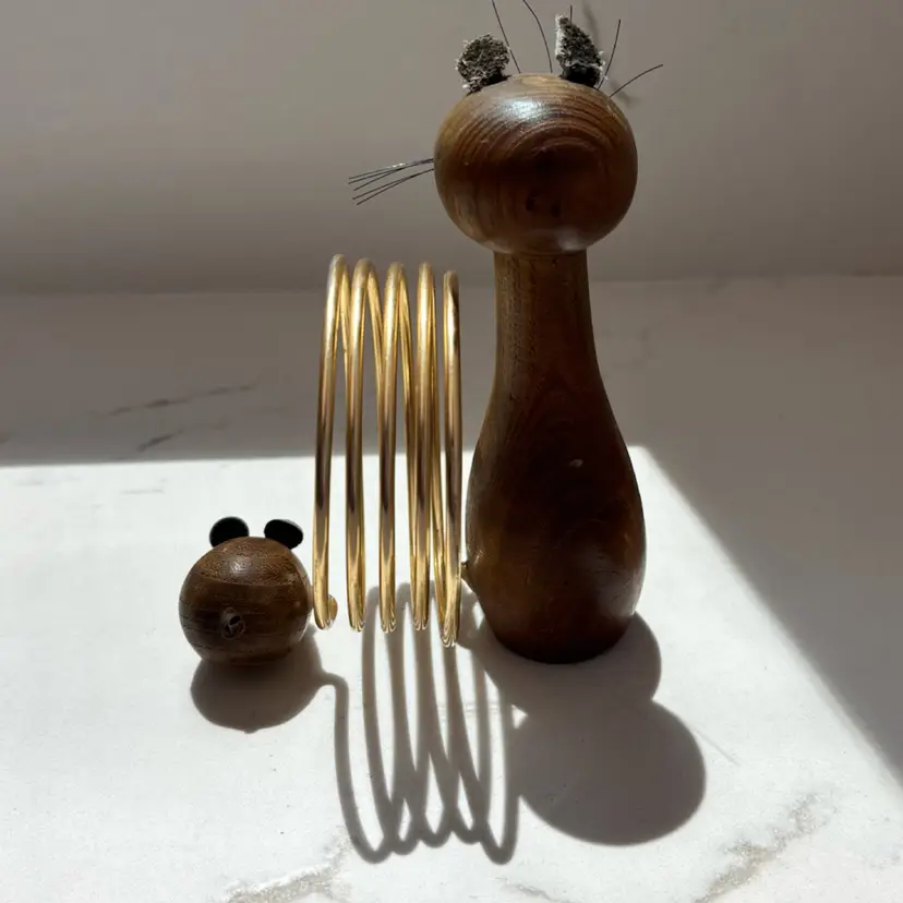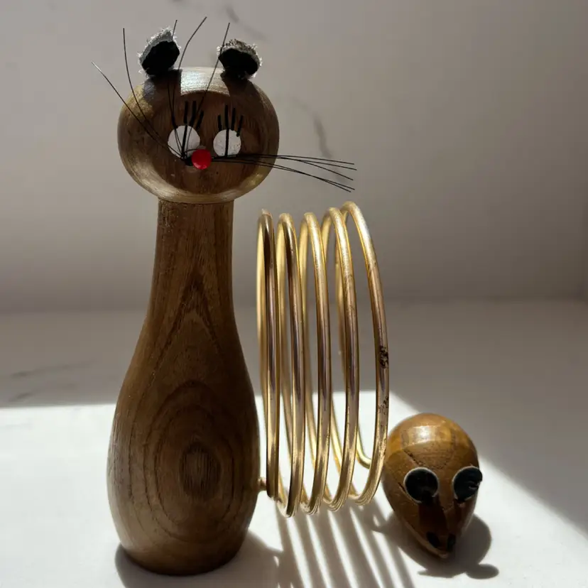 5” tall. Mouse is missing its tail. Wear to paint, ears and wood in places. Still very cool. Cat whiskers intact