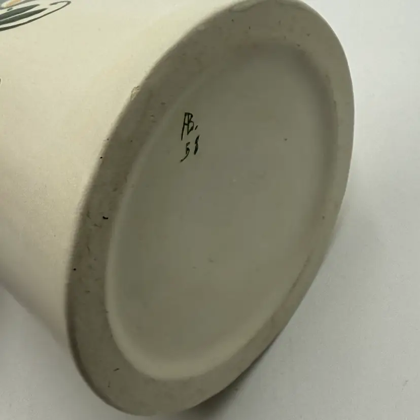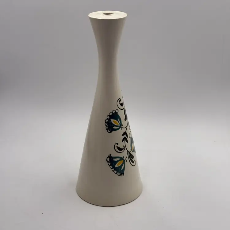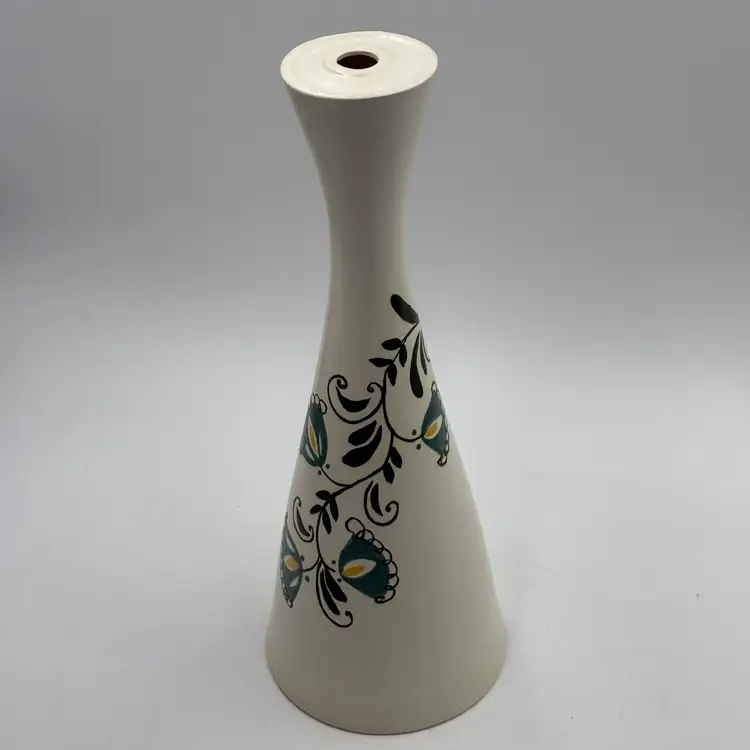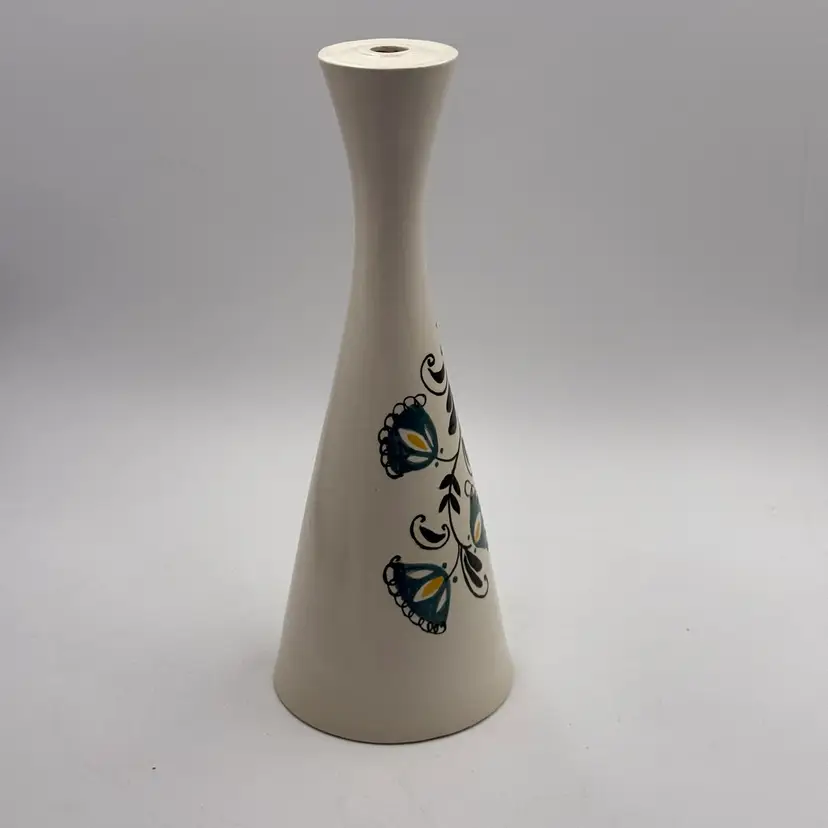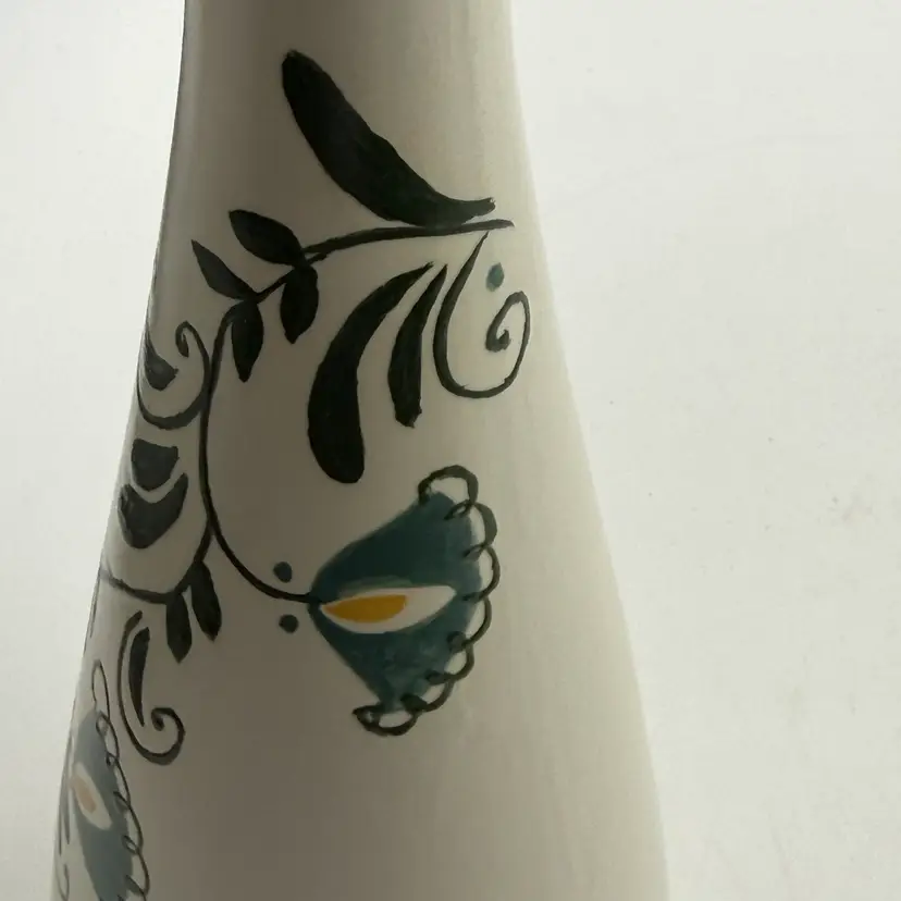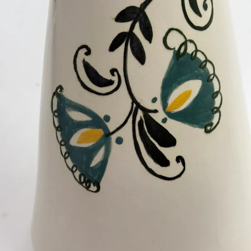 Has a hand painted floral design. In good condition. Does not have any cracks. There are some minor chips on the top rim. Measures 13 1/4 inches tall and 5 inches in diameter at the bottom. Initialed and dated ‘58 on the bottom.