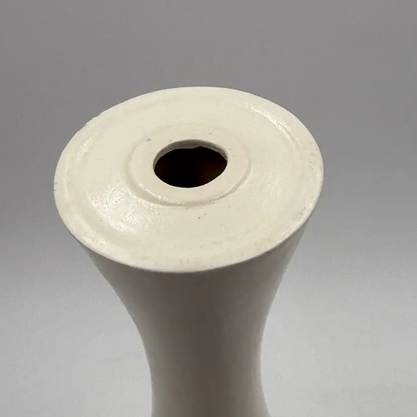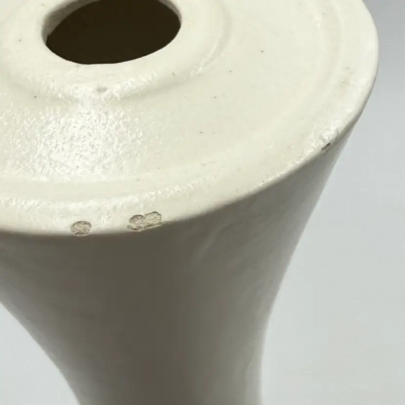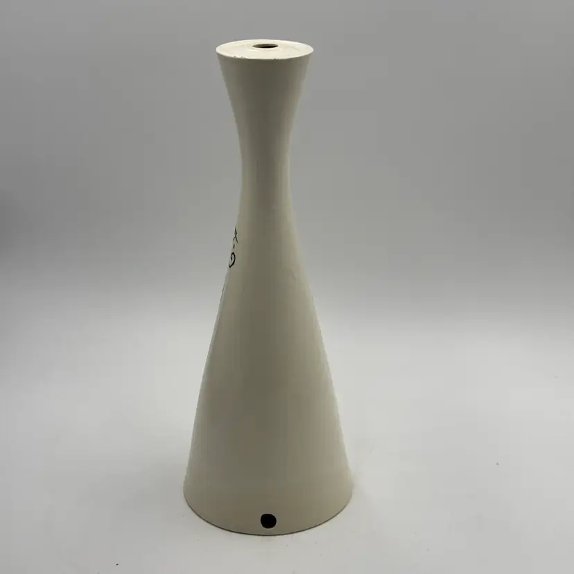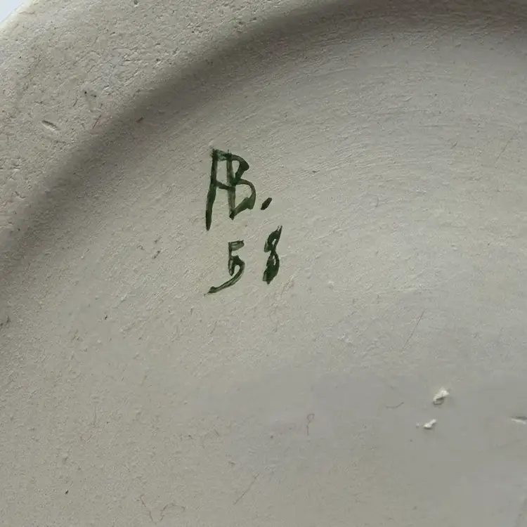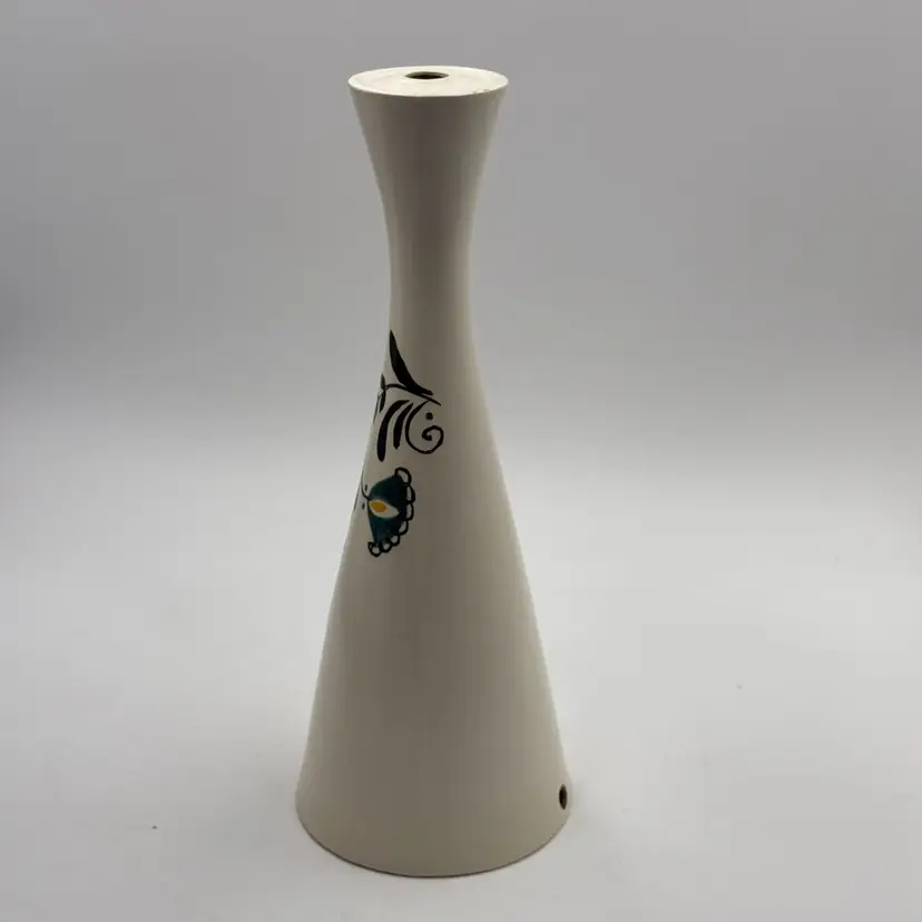 Has a hand painted floral design. In good condition. Does not have any cracks. There are some minor chips on the top rim. Measures 13 1/4 inches tall and 5 inches in diameter at the bottom. Initialed and dated ‘58 on the bottom.