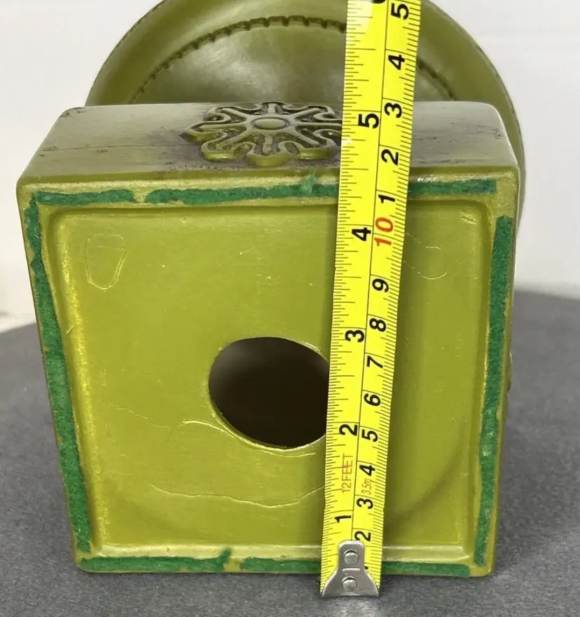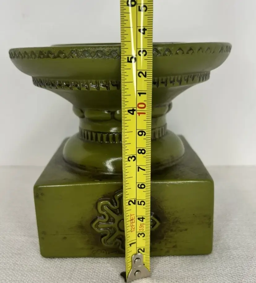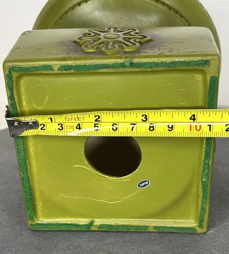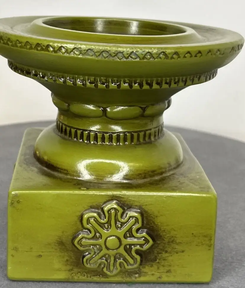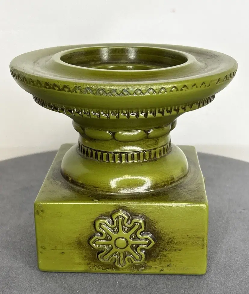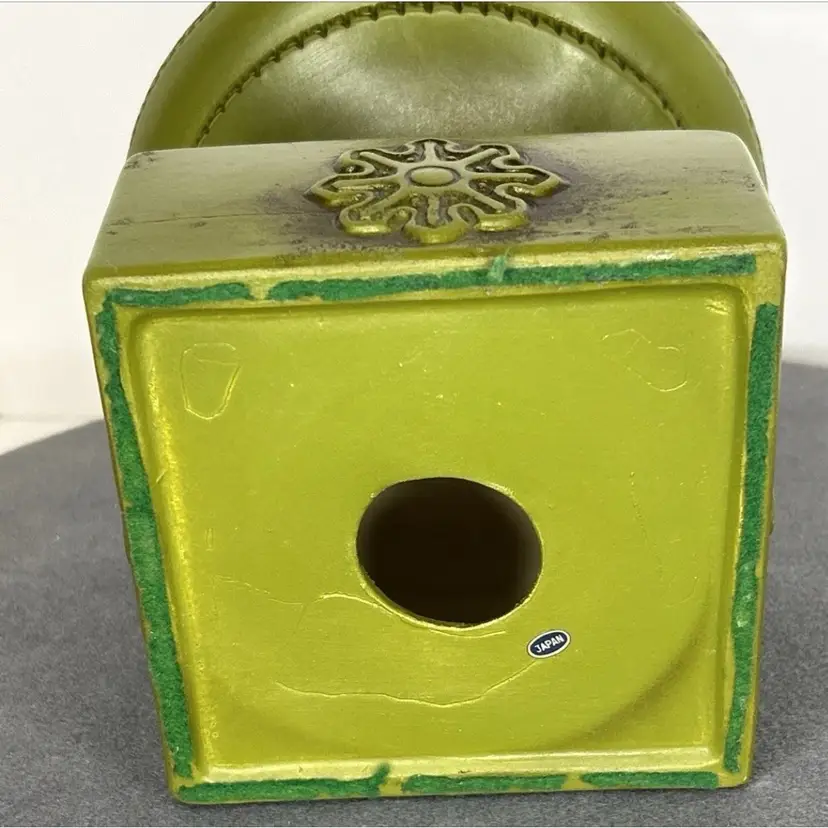 This Vintage MCM Ceramic "Starburst" Pillar Candle in Avocado Green from Japan (has its original "Japan" label) is a unique and collectible decorative piece for any home. This awesome ceramic pillar candle holder is decorated with "starburst" on each of its four (4) sides and can accommodate different size pillar candles. The nostalgic green ceramic holder with textured carvings and a 3D effect makes it a standout feature for furniture placement. This wonderful pillar candle holder measures 5.5" inches tall, 4.25" inches wide at the base and 6" inches in width at the top rim. Vintage MCM Ceramic "Starburst" Pillar Candle Pedestal ~ Avocado Green ~ Japan, is in excellent vintage pre-owned condition, with NO chips, cracks or repairs. Please review all pictures for proper assessment of its excellent vintage pre-owned condition.