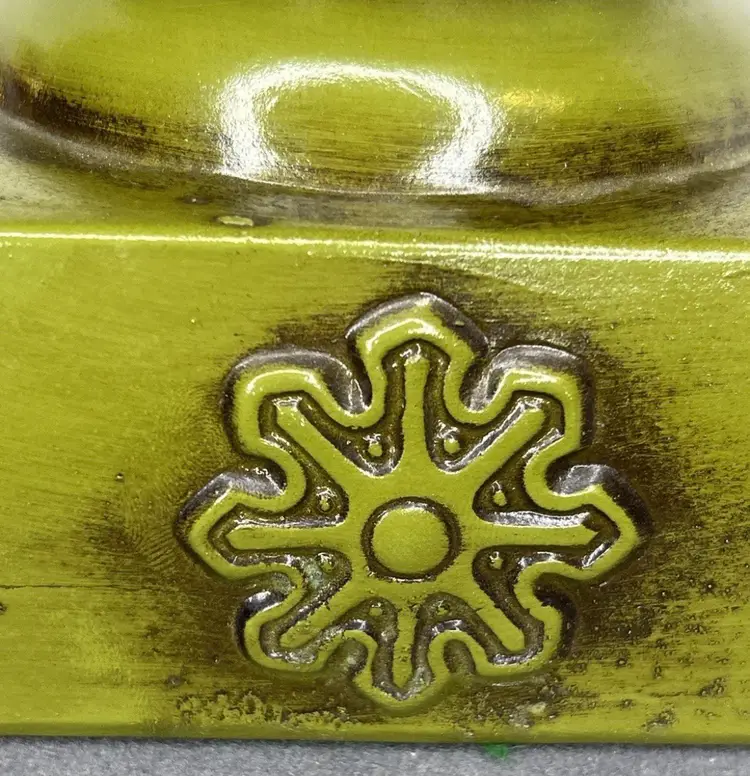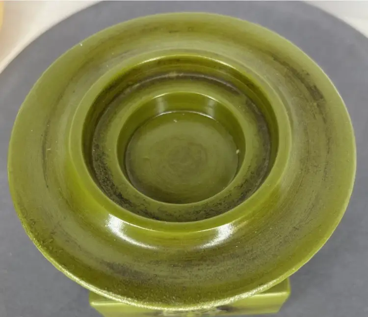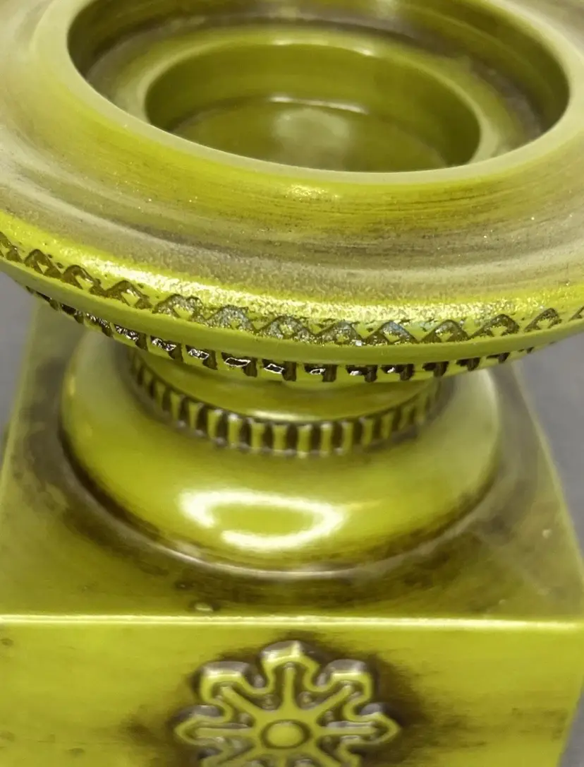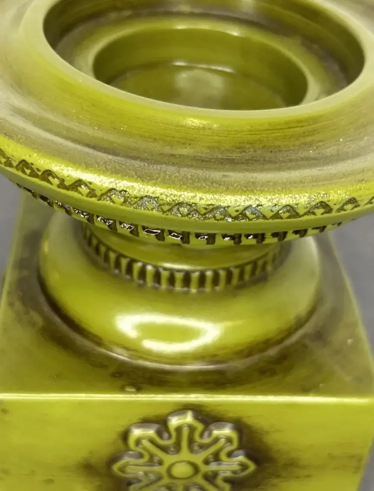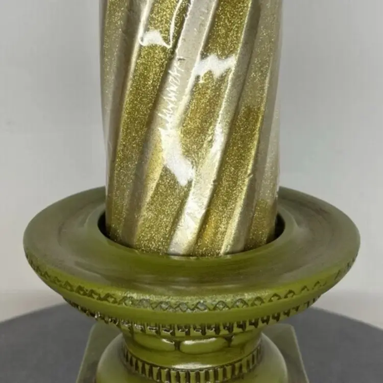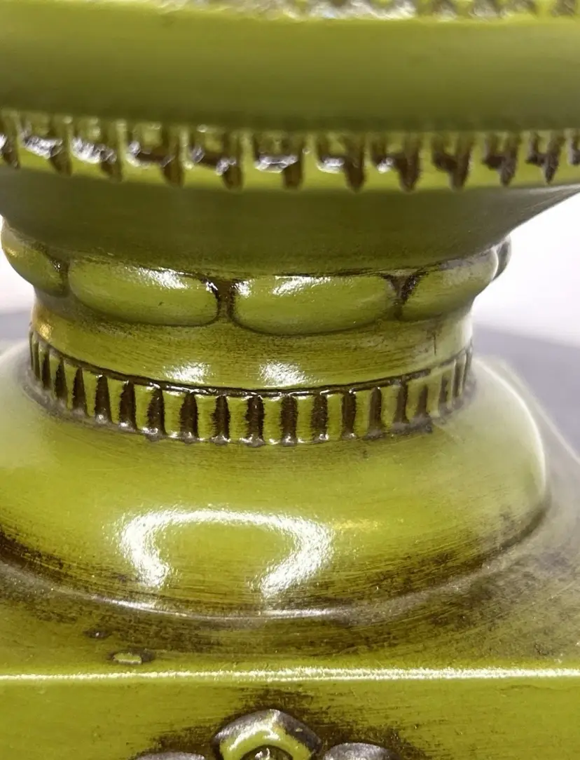 This Vintage MCM Ceramic "Starburst" Pillar Candle in Avocado Green from Japan (has its original "Japan" label) is a unique and collectible decorative piece for any home. This awesome ceramic pillar candle holder is decorated with "starburst" on each of its four (4) sides and can accommodate different size pillar candles. The nostalgic green ceramic holder with textured carvings and a 3D effect makes it a standout feature for furniture placement. This wonderful pillar candle holder measures 5.5" inches tall, 4.25" inches wide at the base and 6" inches in width at the top rim. Vintage MCM Ceramic "Starburst" Pillar Candle Pedestal ~ Avocado Green ~ Japan, is in excellent vintage pre-owned condition, with NO chips, cracks or repairs. Please review all pictures for proper assessment of its excellent vintage pre-owned condition.
