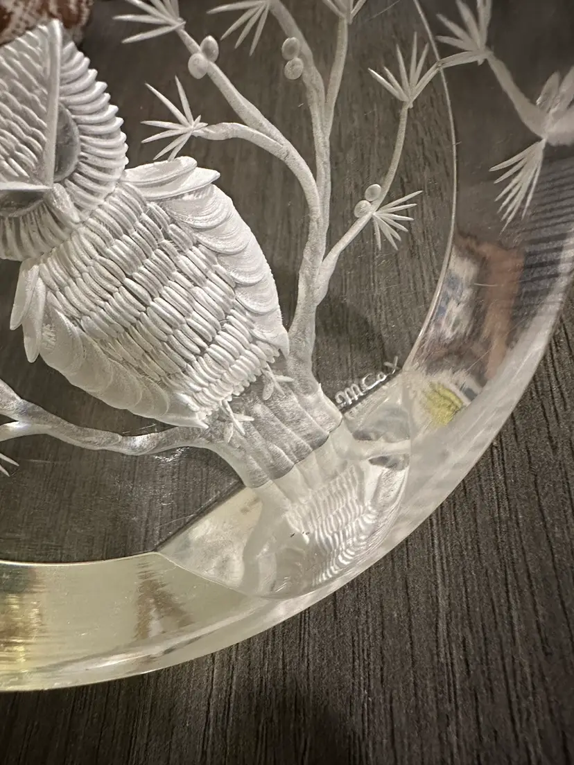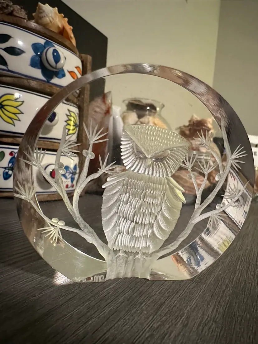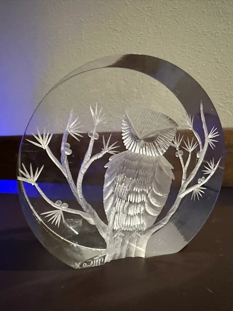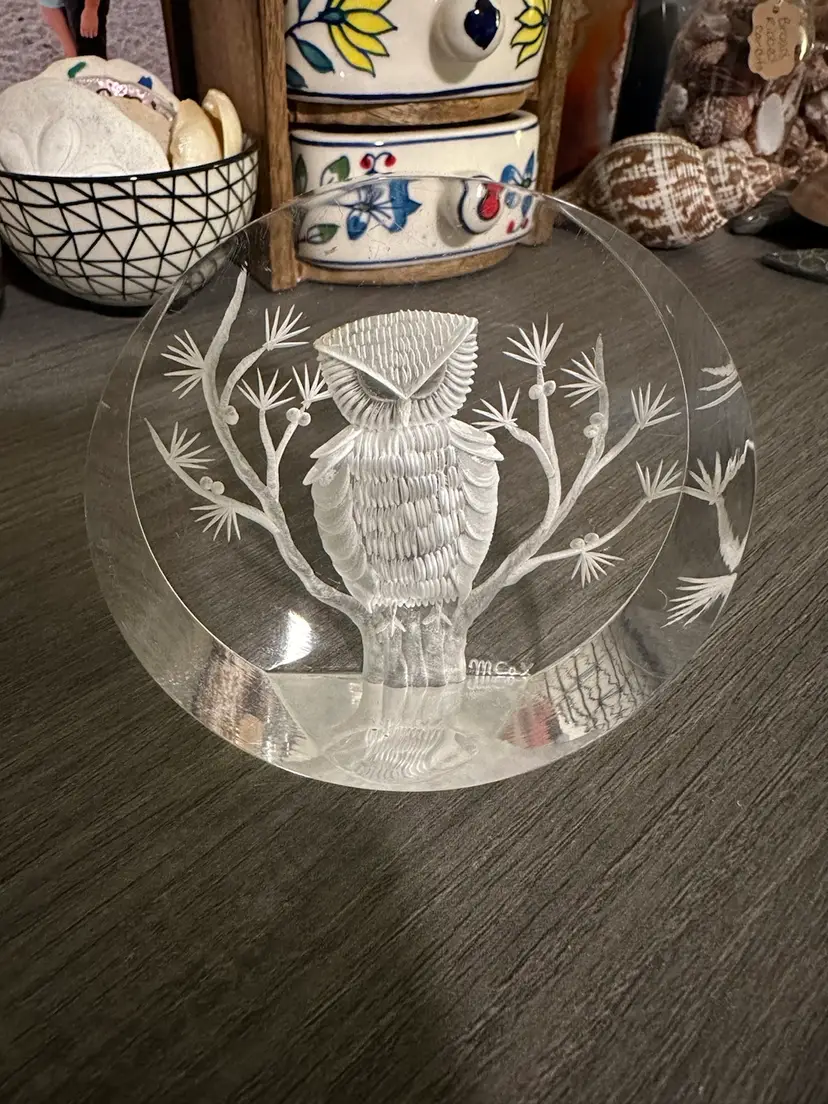 Vintage MCM Clear Reverse Carved Owl Lucite Paperweight Signed Michael F. Cox Very good condition
