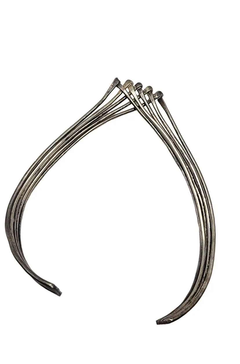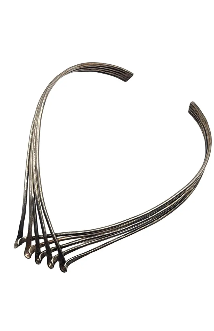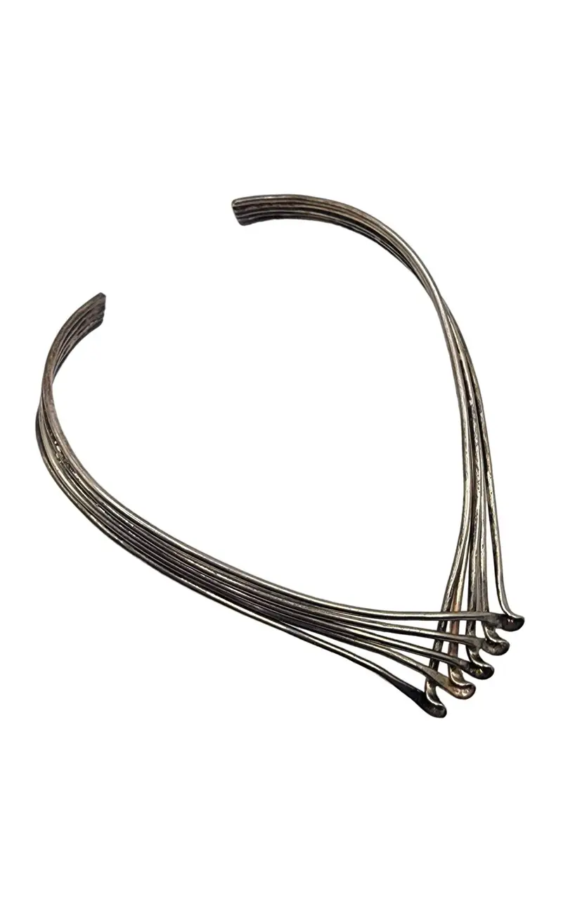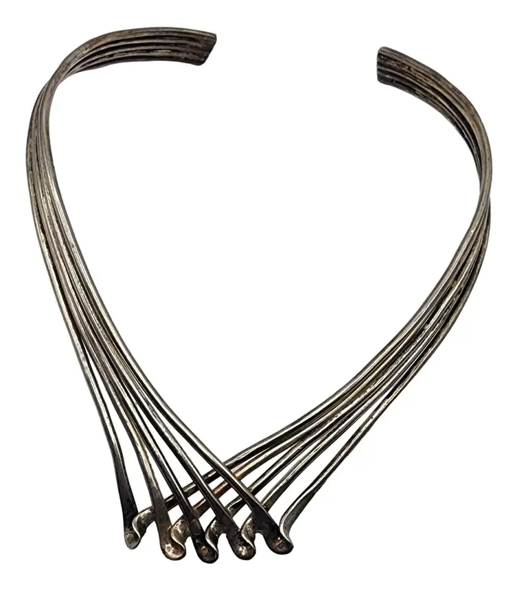 Size: Adjustable Color: Silver Condition: Very good vintage Signed: None Details: Adjustable cuff necklace. Looks and feels like silver but does not test as sterling.