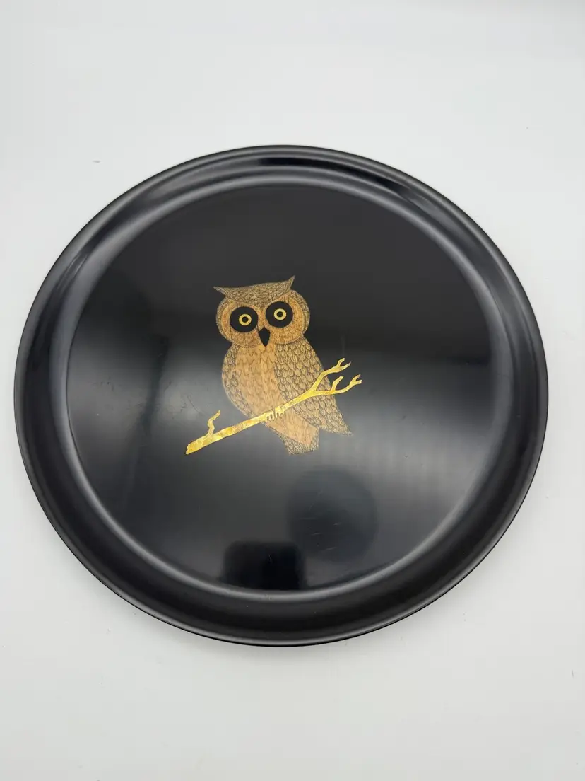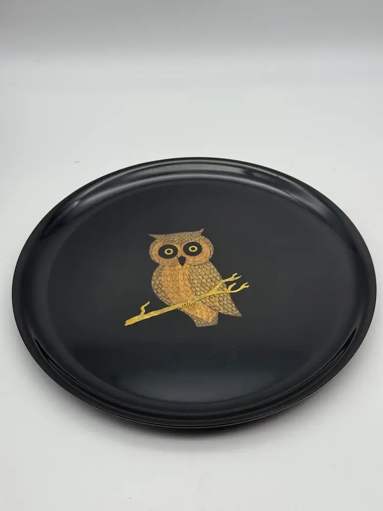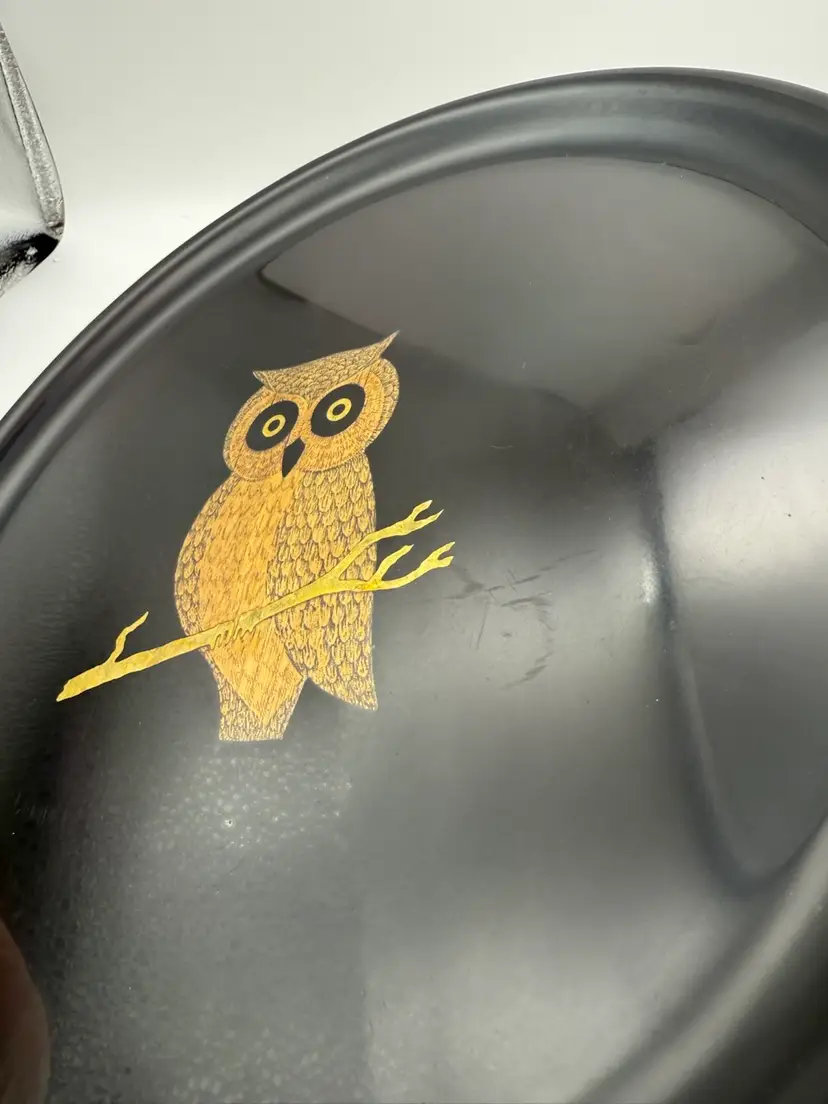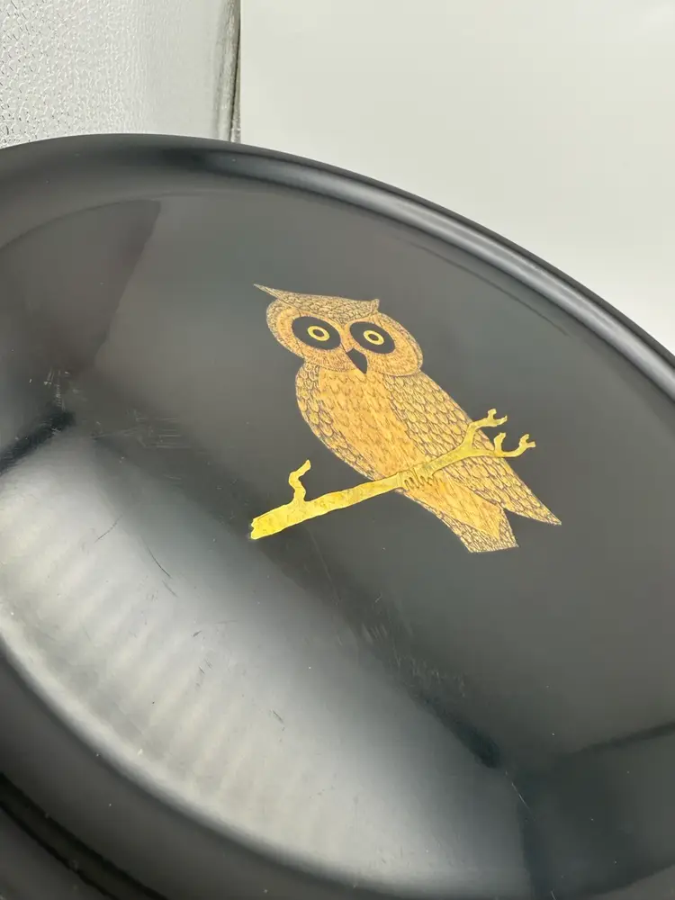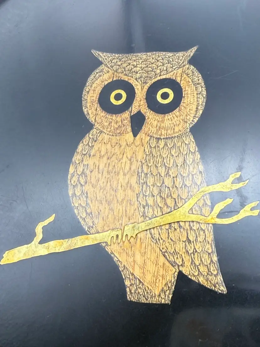 Original sticker still attached to back. Some minor scuffing, as to be expected with a piece of age. No cracks or chips. Beautiful inlay owl design.