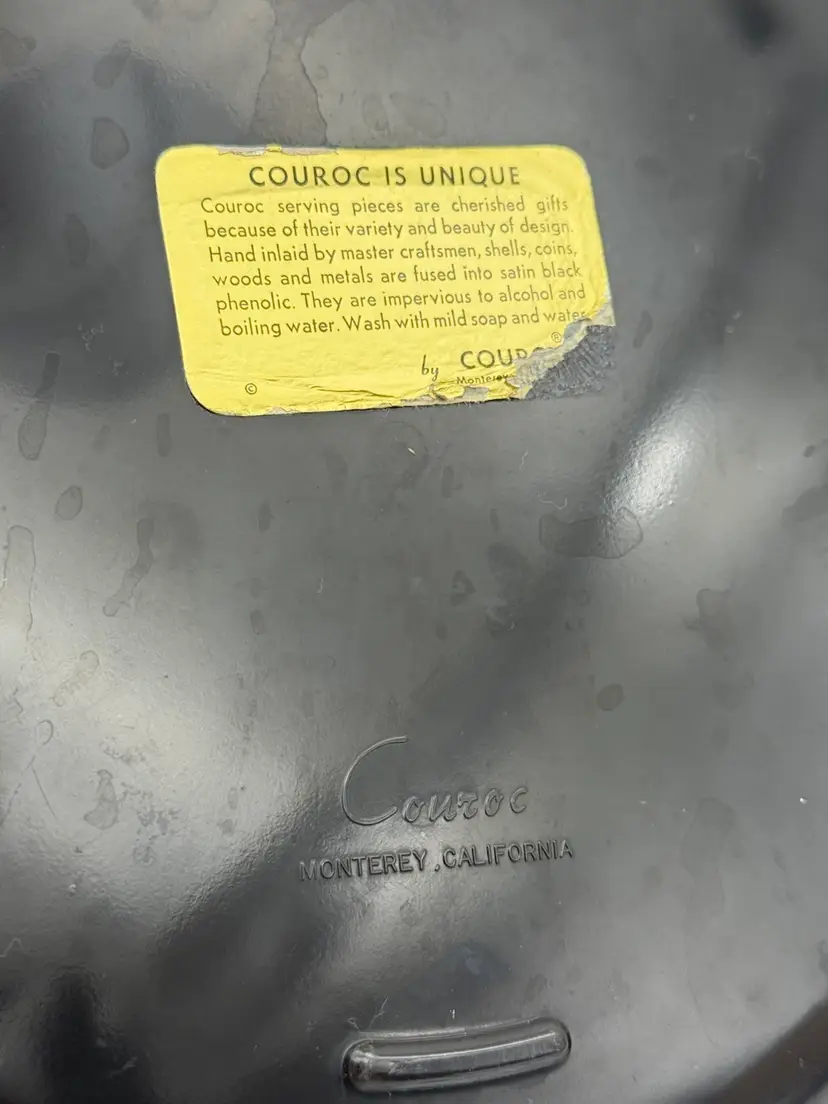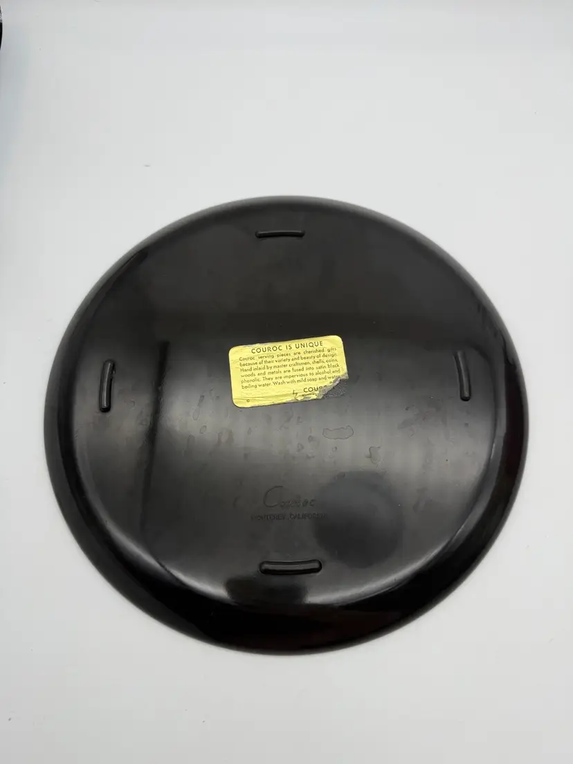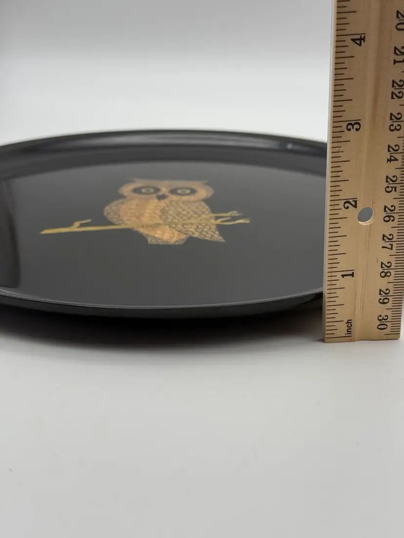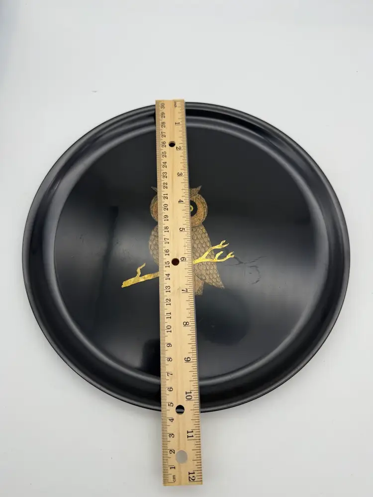 Original sticker still attached to back. Some minor scuffing, as to be expected with a piece of age. No cracks or chips. Beautiful inlay owl design.