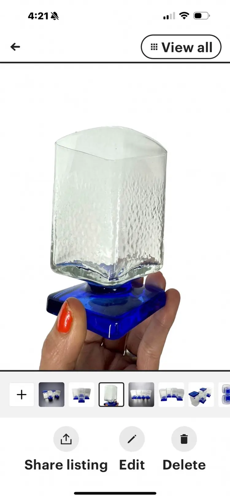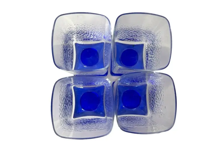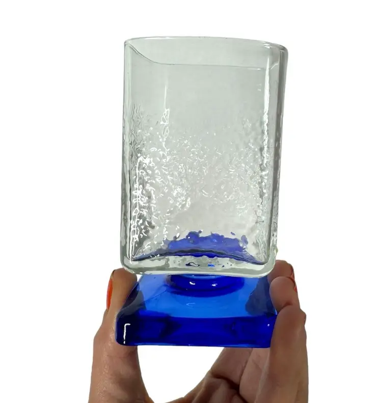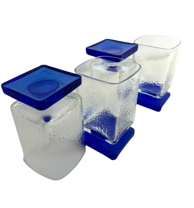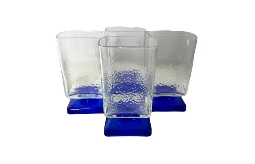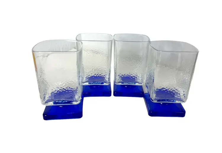Set of 4 Disaronno Midcentury Modern/retro cocktail glasses , liqueur glasses. Clear ice textured glass with cobalt blue square footed bases. Excellent condition with no visible chips or cracks