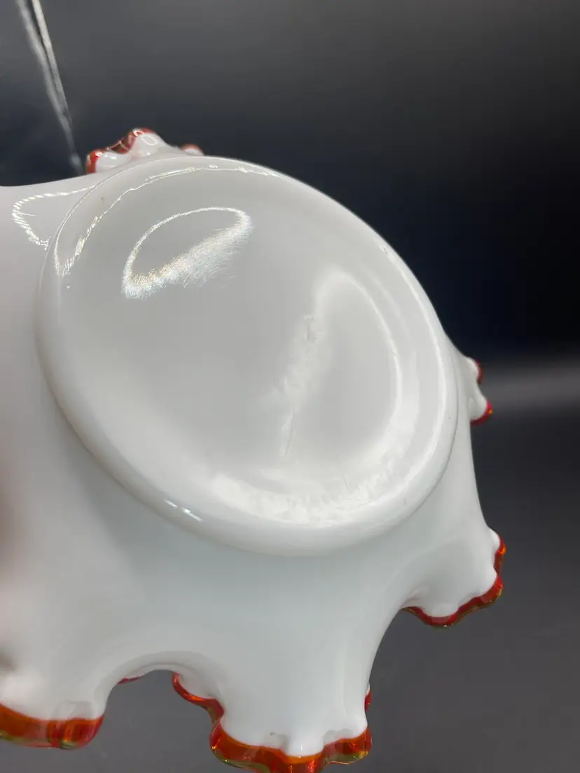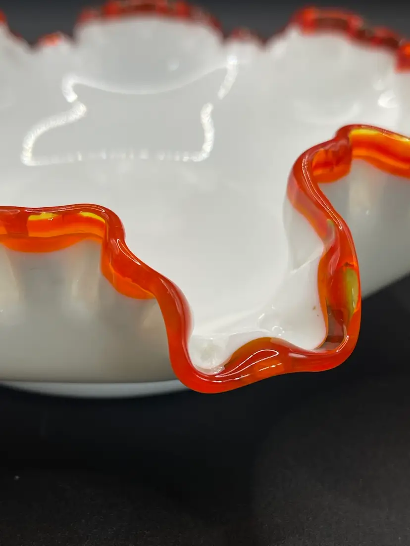 Vintage, MCM Fenton Flame Crest Ruffled Bowl. Made only in 1963, this is one of the more rare colors that Fenton did in their crested collection. This stands approximately 2 and a half inches tall and approximately 7 and 3 quarter inches wide. Check out that glow! The flame crest glows under 395 blacklight!