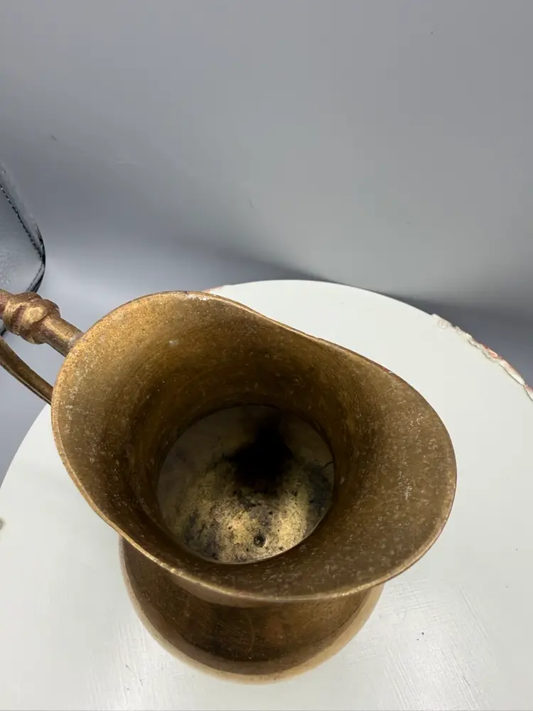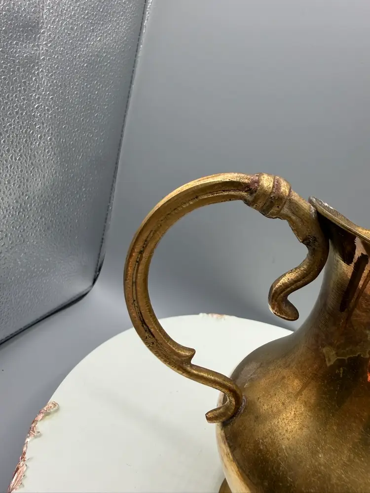 The handle is a thick brass piece with an ornate, serpentine design that curves gracefully from the top rim down to the widest part of the pitcher's body. It has a small, decorative flourish or curl near the upper attachment point, giving it an elegant, flowing appearance. Natural vintage patina w/light surface wear consistent with age.