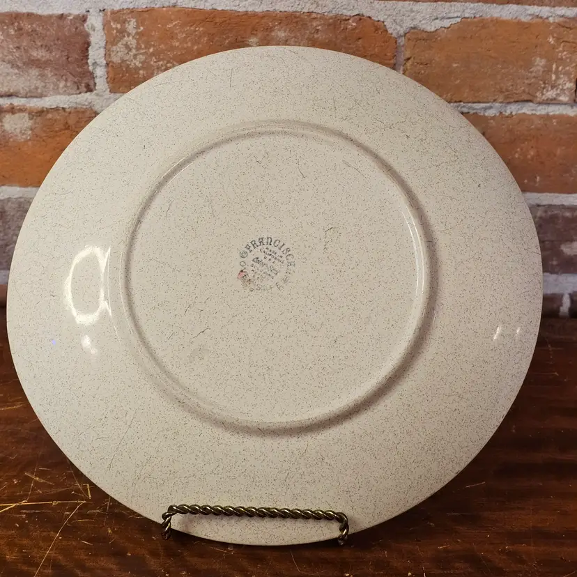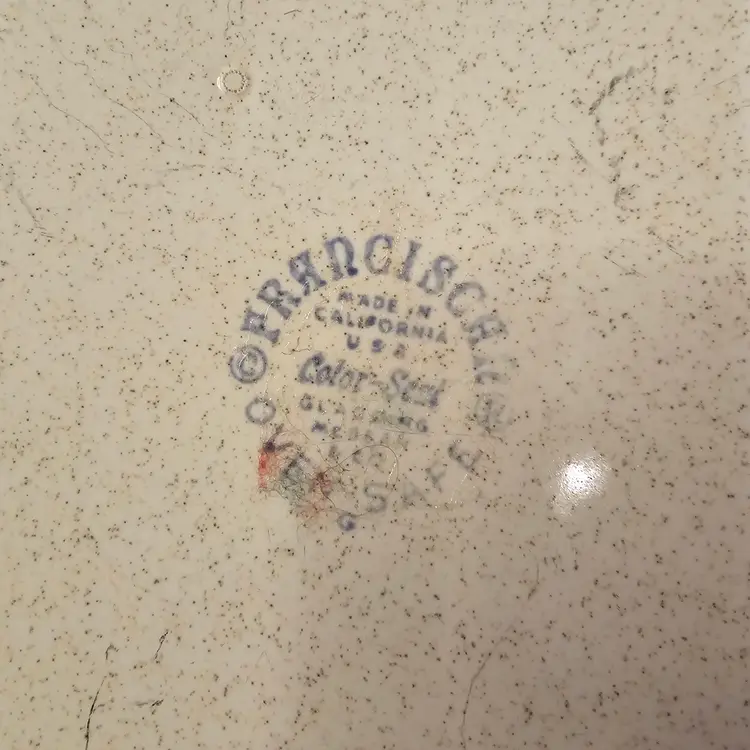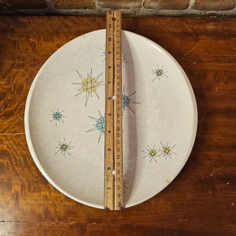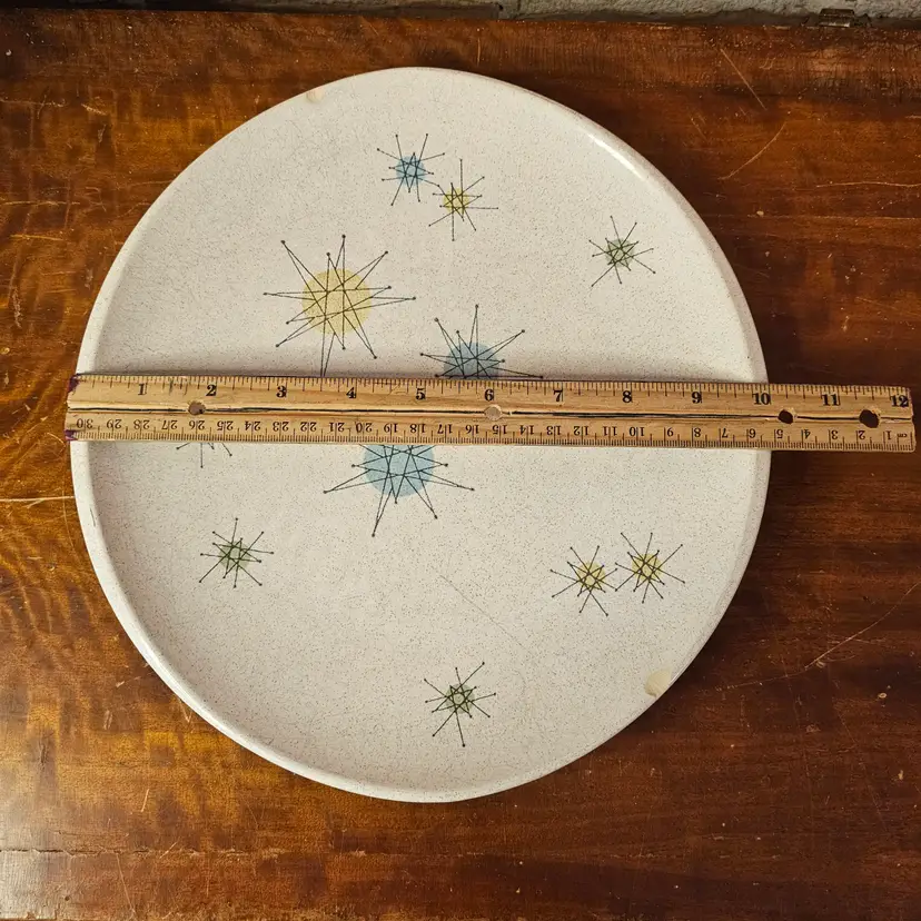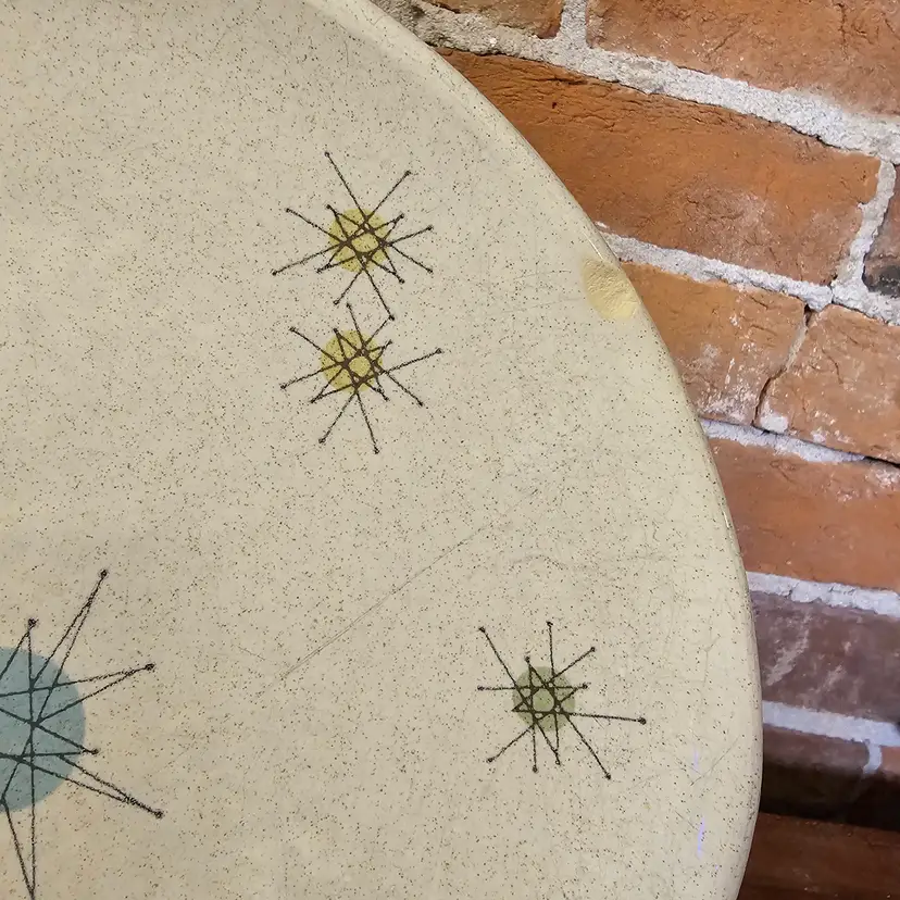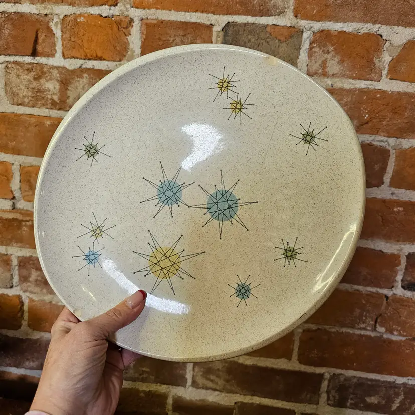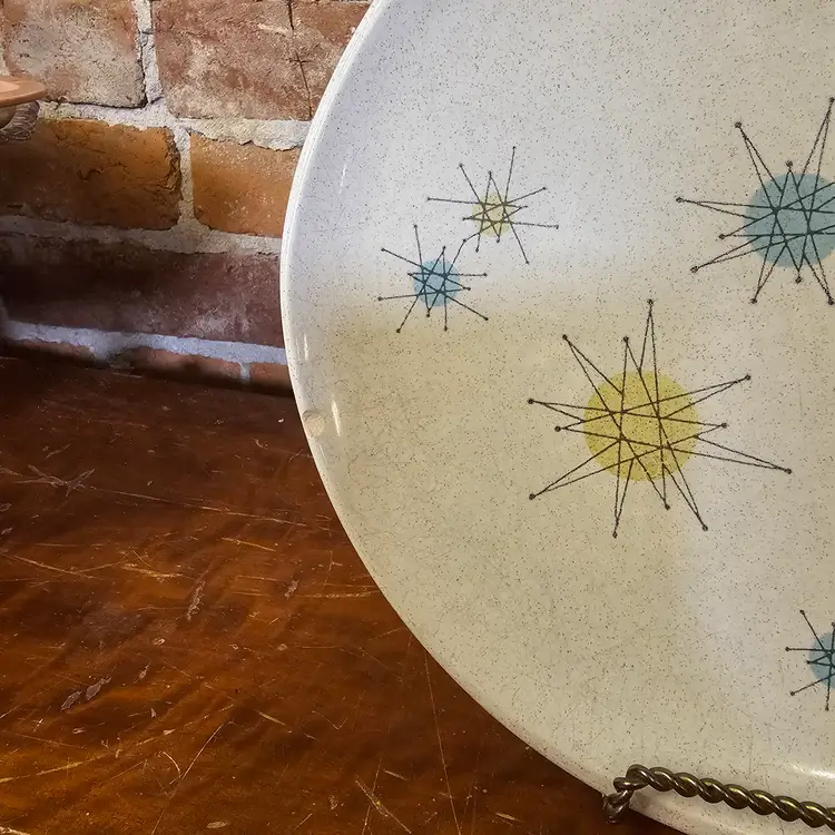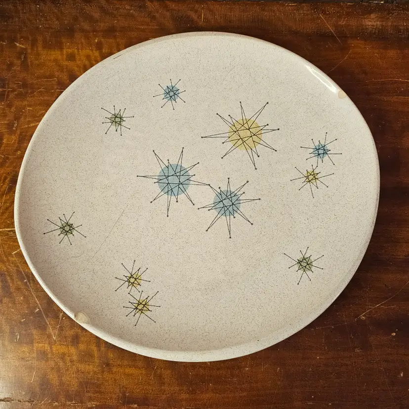 Iconic vintage Franciscan atomic star platter, made in California, USA, featuring the classic mid-century starburst pattern in soft blue, yellow, and green on a speckled off-white glaze. This is peak 1950s MCM design — clean lines, atomic energy, and very collectible.