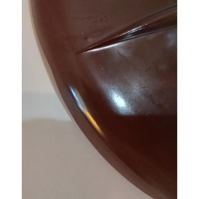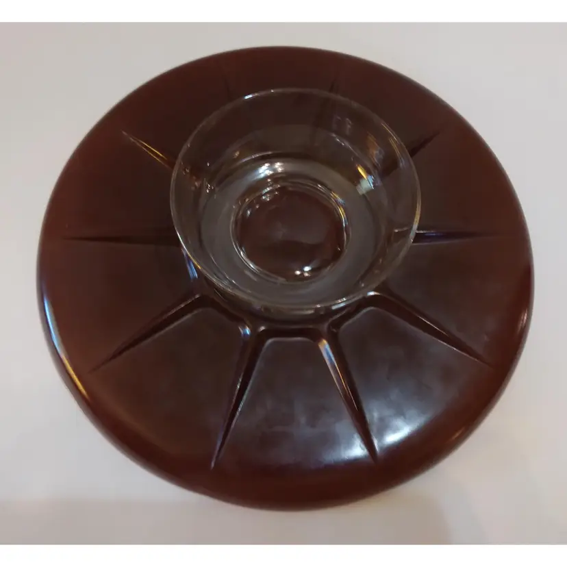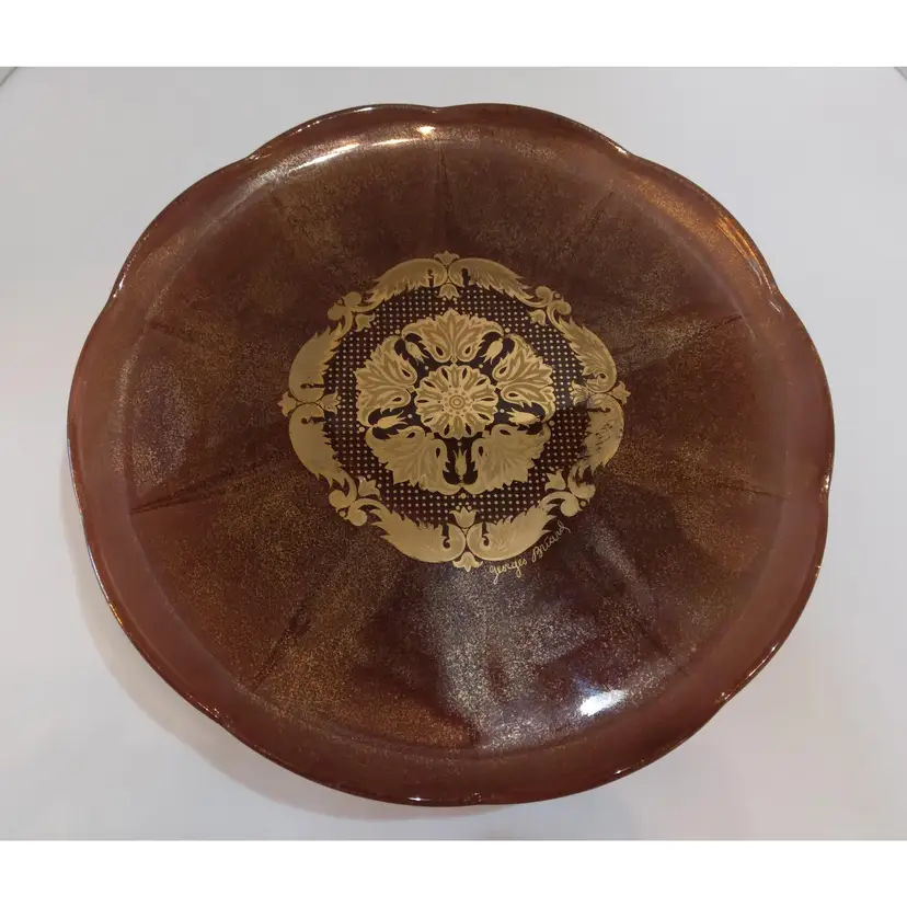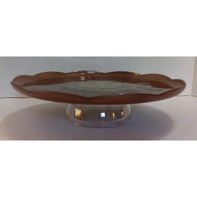 Vintage MCM Georges Briard Brown Gold Scallop Edge Footed Cake Stand 11 inches. Holy sheets cakes! This one is a stunner. Approx. 11 inches in diameter and 2 3/4 inches tall. The pedestal is clear glass sprinkled with gold flecks. No chips or cracks. There is a flea bite on the back side that doesn't show well in photos and a production mark on the back. Please see photos. I am a careful and experienced shipper.