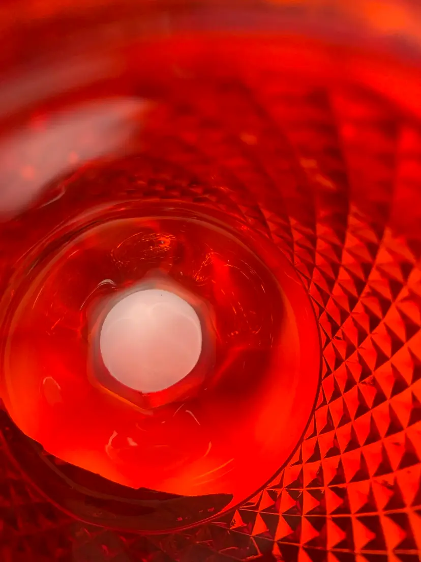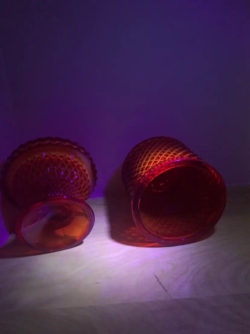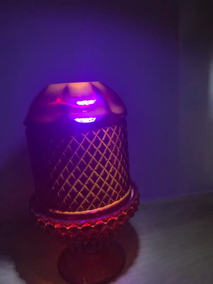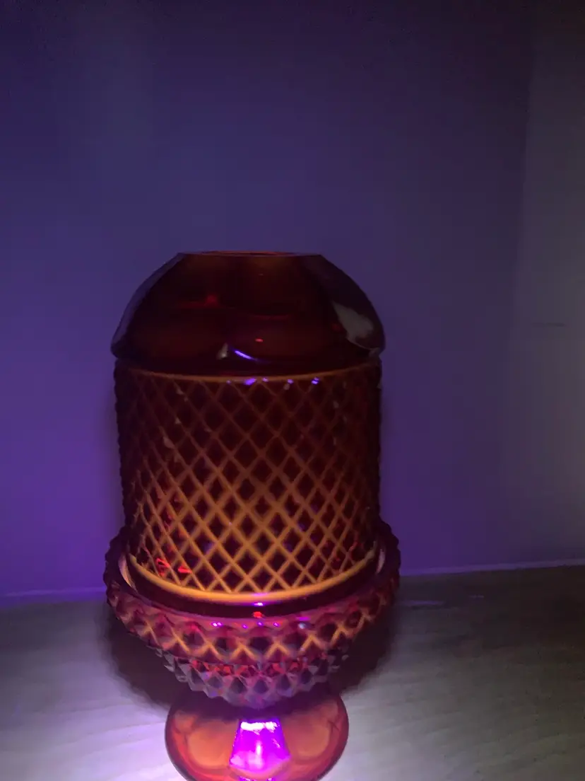 The mcm Viking fairy lamp glows and is previously owned. It is 6 3/4 “tall and is 2 1/2 “ wide at base. It does have a very small flea bite on the inner top rim.