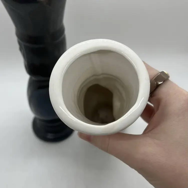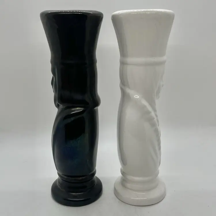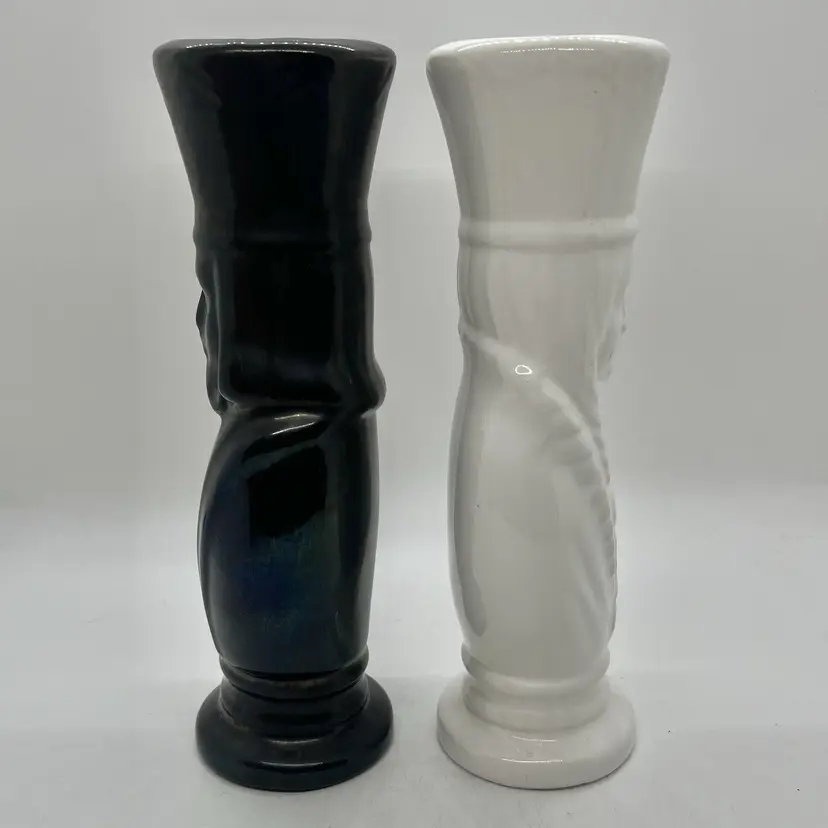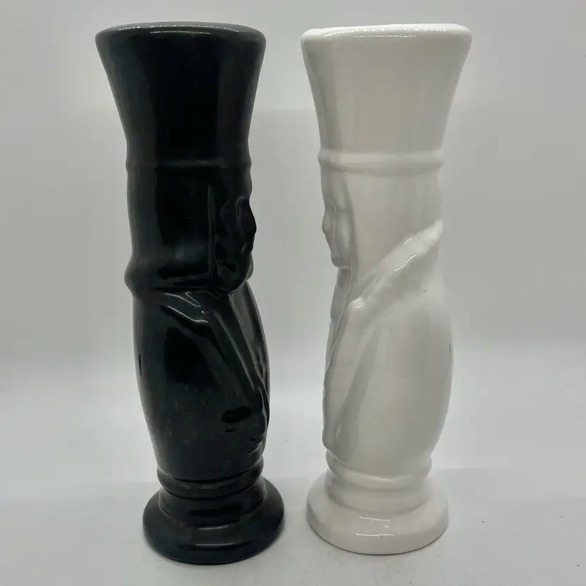 A beautiful pair of hobbyist made ceramic vases. Features black king and white queen chess pieces. No chips or cracks, the queen is initialed by artist. They measure a little over 8" tall and almost 2" diameter across the top.