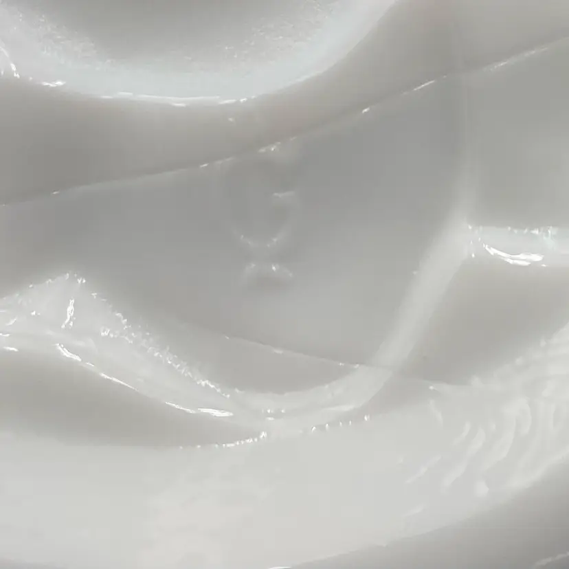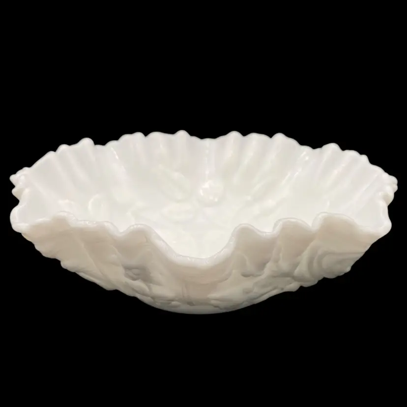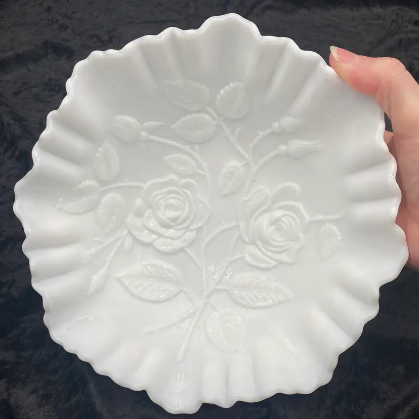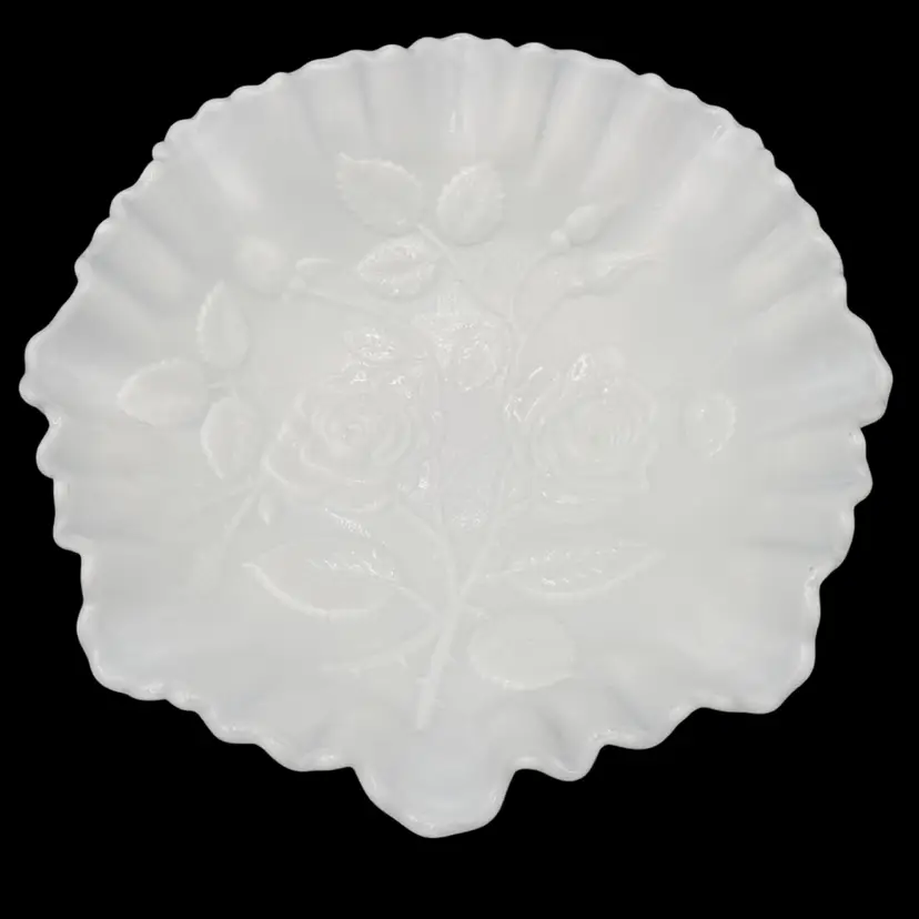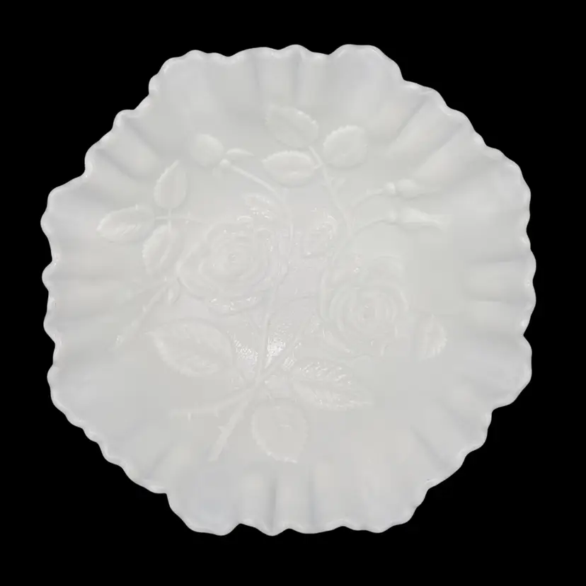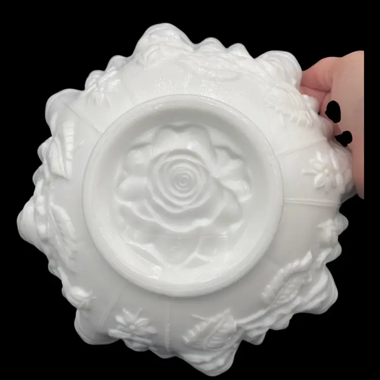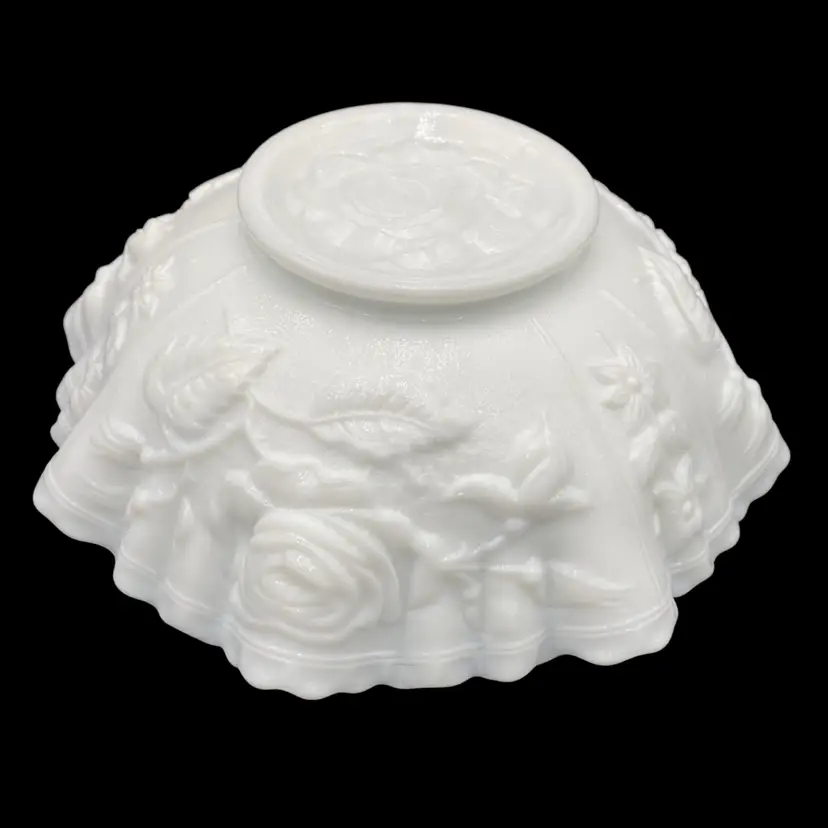 Experience the charm of the mid-century modern era with this exquisite Imperial Glass Rose Milk round bowl. Crafted in the late 1960s, this piece showcases an embossed open rose pattern, complemented by a crimped edge. It is a lovely white milk glass and measures 9 inches wide and 3 inches tall. This original, handmade piece weighs in just over 2 pounds. It has the Imperial Glass imprint on the underside base. This particular line was made from 1950-1971.