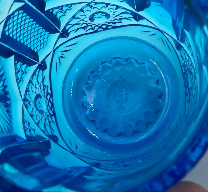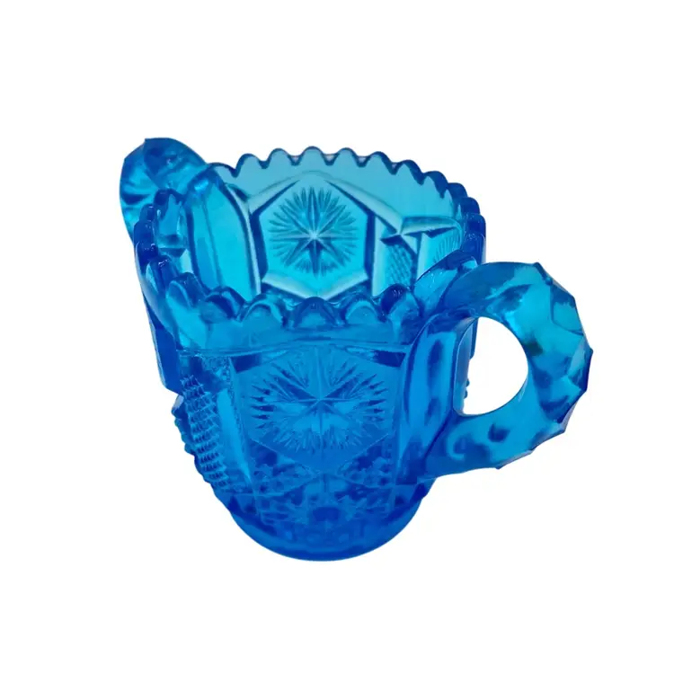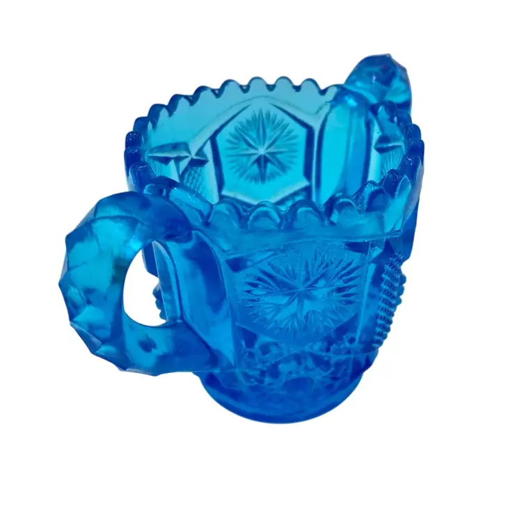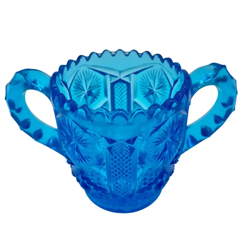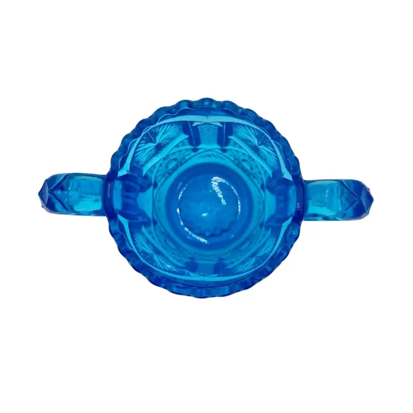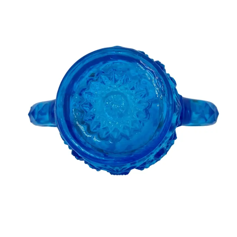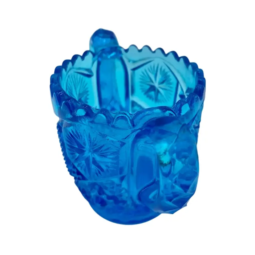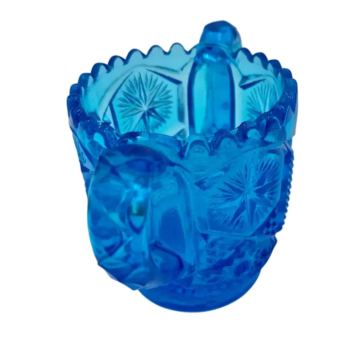 This is a vintage Imperial Glass "Stars and Files" (pattern #612) Spooner or Toothpick Holder in Blue. The original launch of this pattern was in the 1920s, but Imperial revived it in the 1950s. This piece has their logo, "IG", in the center, which indicates that it came from the 1950s (they did not typically use logos in the early years). Made in Bellaire, Ohio, the piece features their embossed stars and files pattern, along with a sawtooth rim, in a beautiful aqua blue. It has a glossy finish and is 2.4 inches in height, 3.8 inches in width, and 2.2 inches in width. I believe this is a toothpick holder, but it is in the same shape as their spooner (a dish to hold extra teaspoons). Typically, a spooner was taller, though.