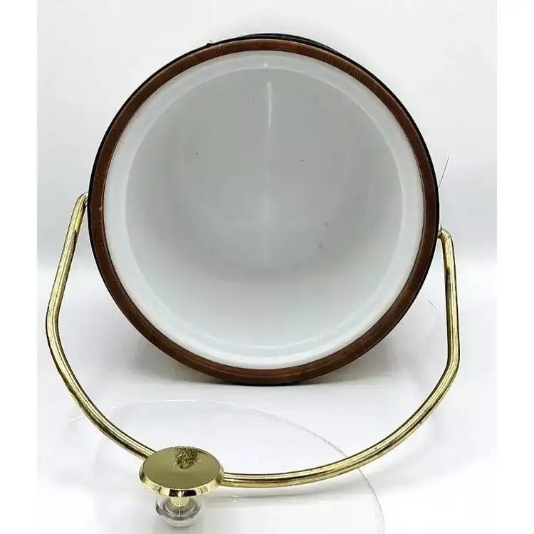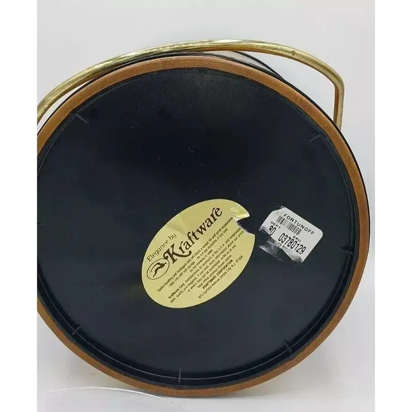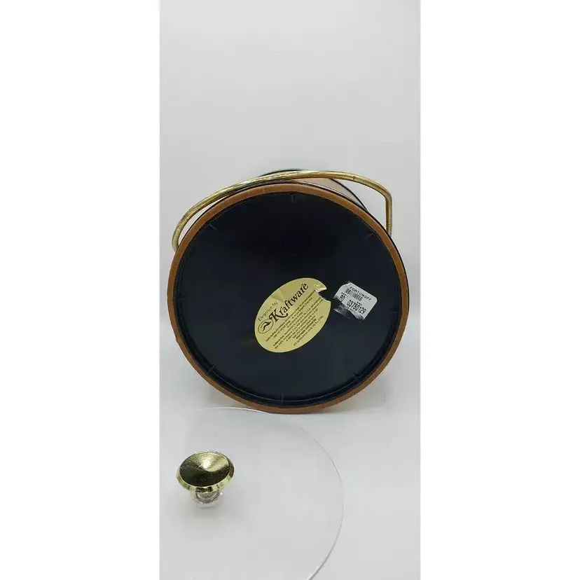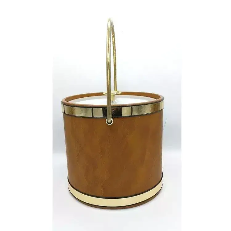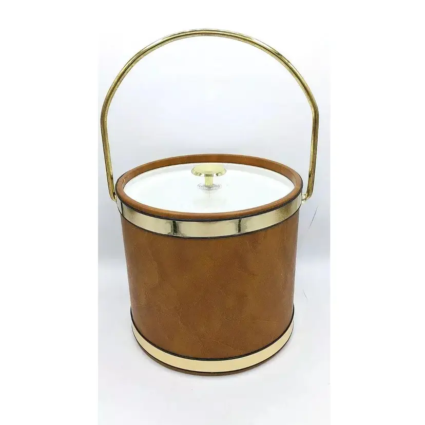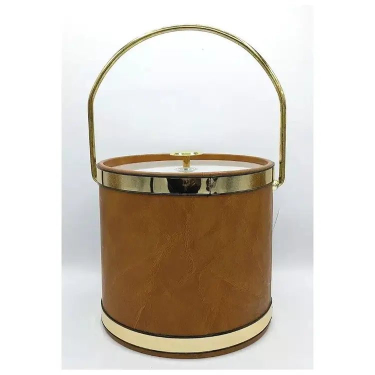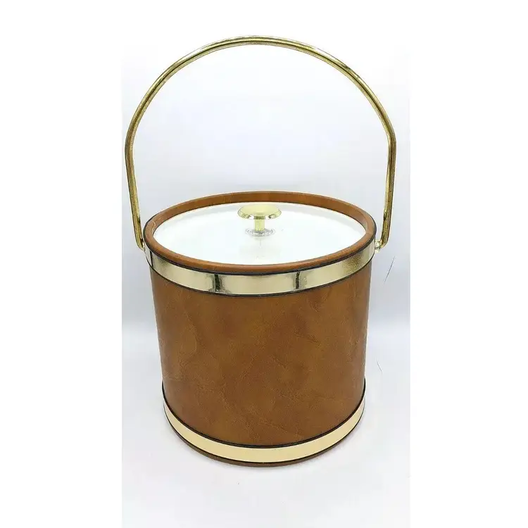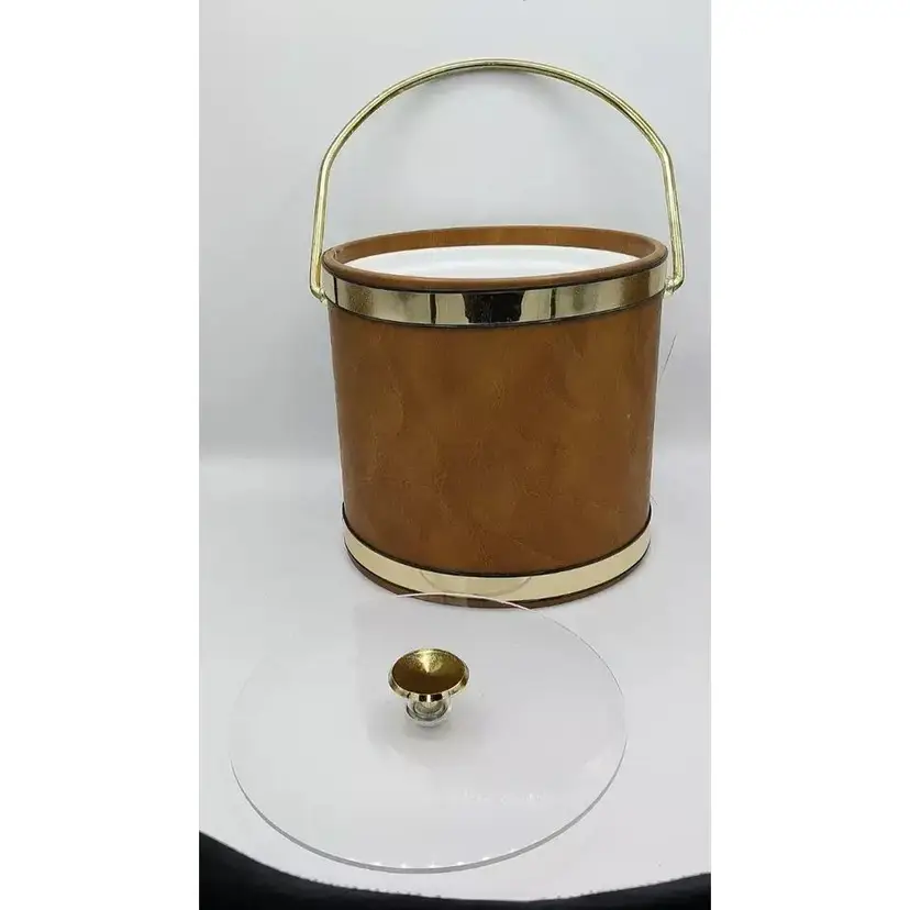 Add a vintage touch to your barware collection with this Kraftware ice bucket. The round bucket features gold handle and black and gold banding, a clear acrylic lid with a gold tone metal handle, and has a brown faux leather covering. The bucket is made of plastic and metal materials and has a capacity of 1 qt. The ice bucket is perfect for any party or gathering. It measures: 7.5" high and 7.5" in diameter. It is in great condition, with only expected, but minor, wear from years and usage. No cracks. Please see all pics, as they are part of the description.