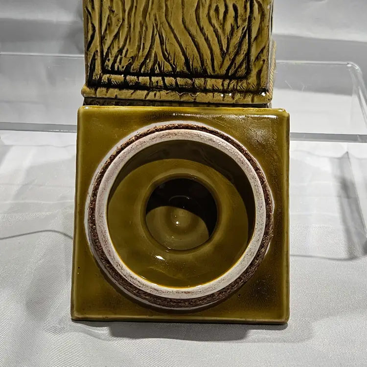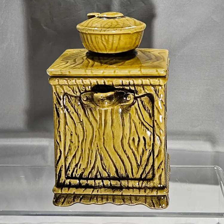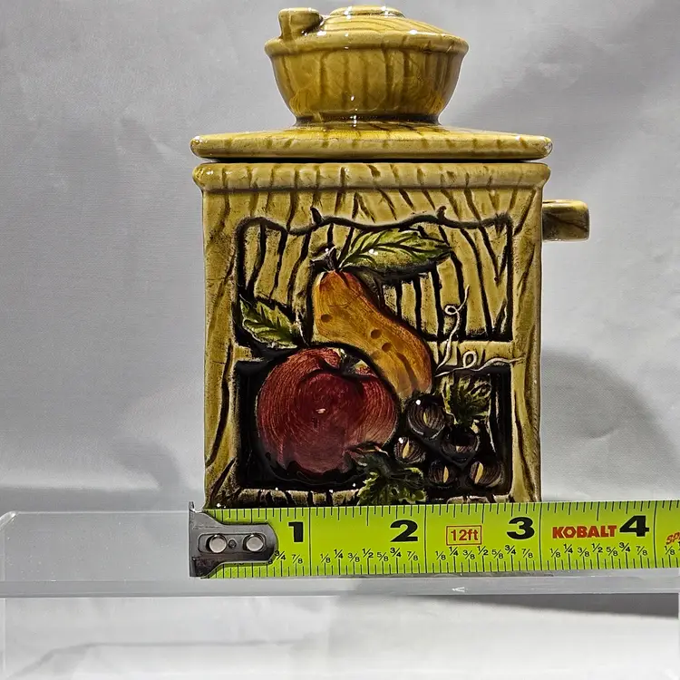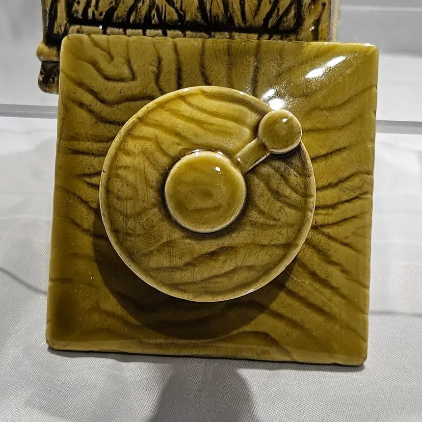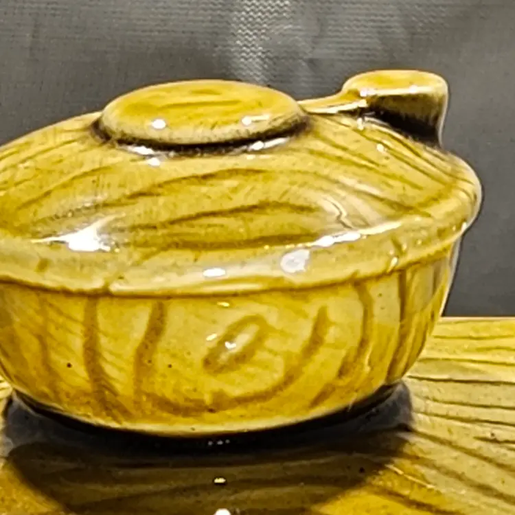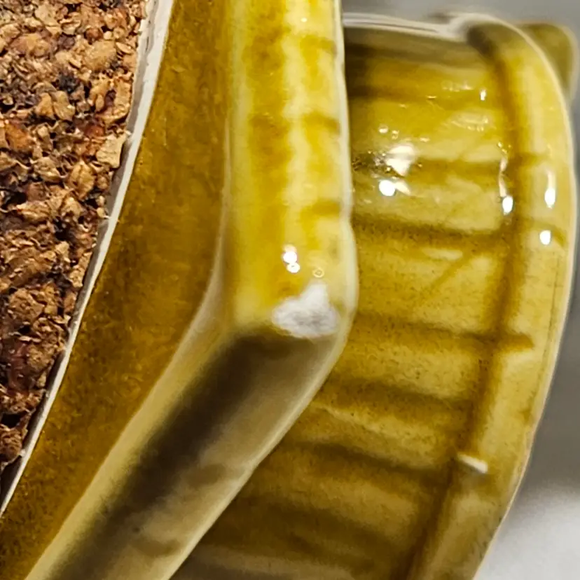 There is a small chip on the corner of the lid and the upper, round, part of the lid - Please see photos Please see photos for size Please see photos for additional details