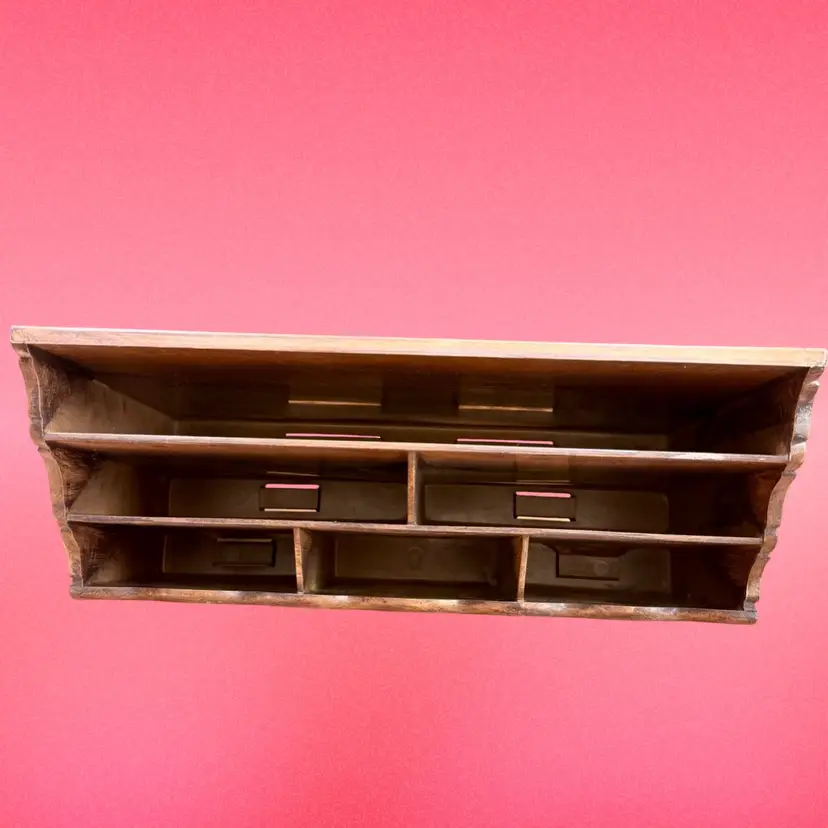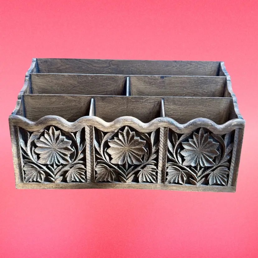 12"x7"x4 1/8". Vintage plastic faux wood desk organizer/caddy, with a lovely design on the front and sides. Has SIX compartments. No major issues! On good vintage condition. Has makers mark on bottom.