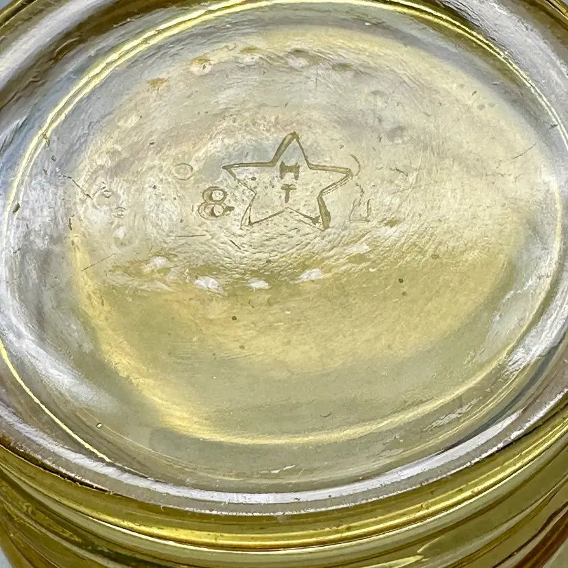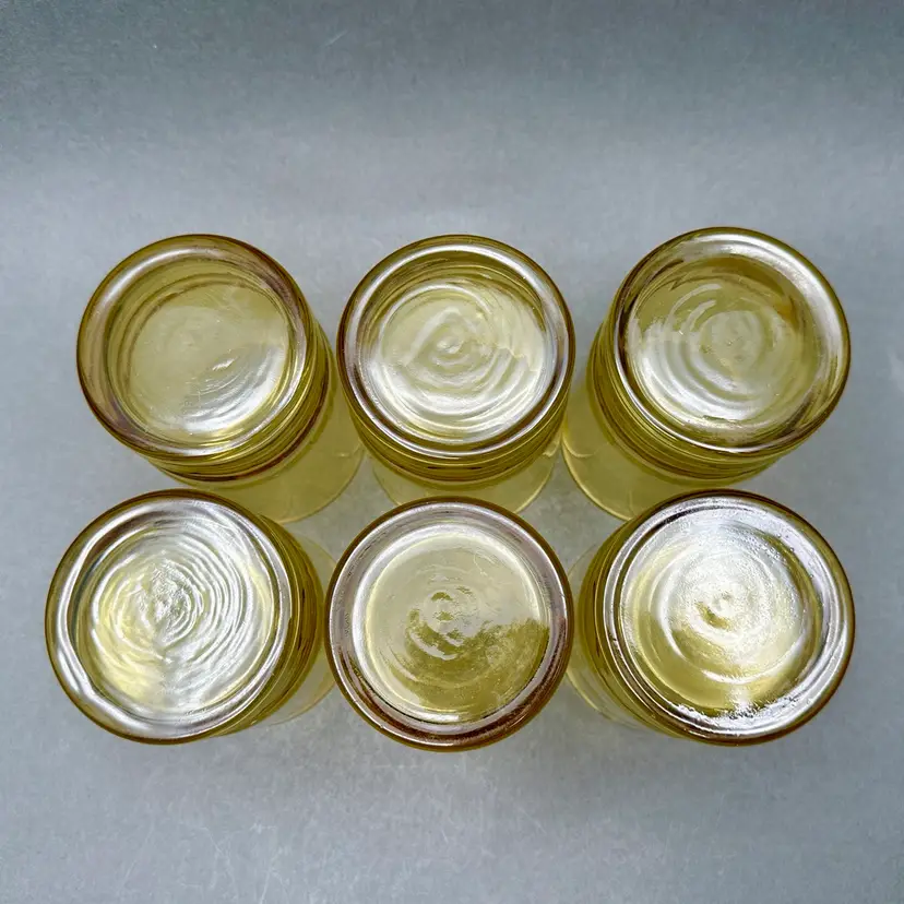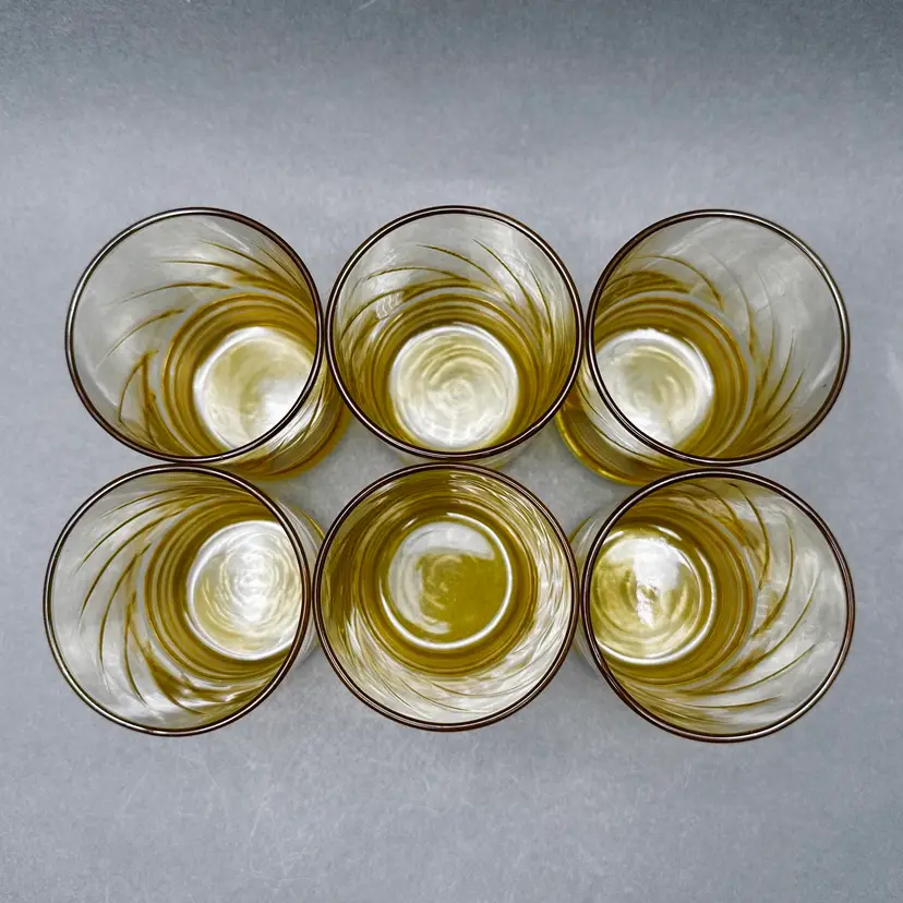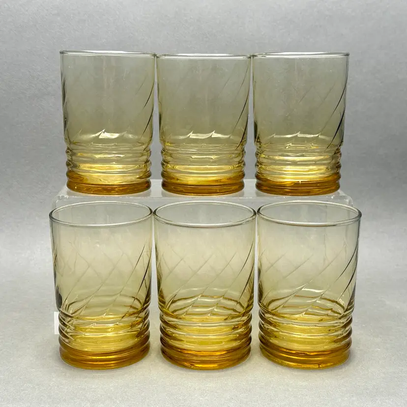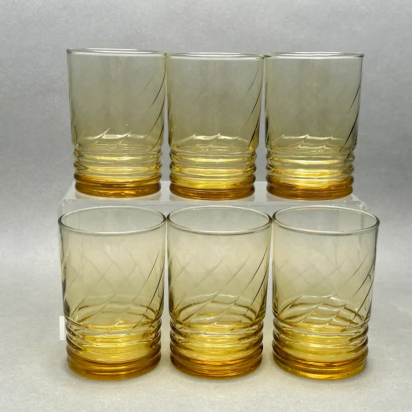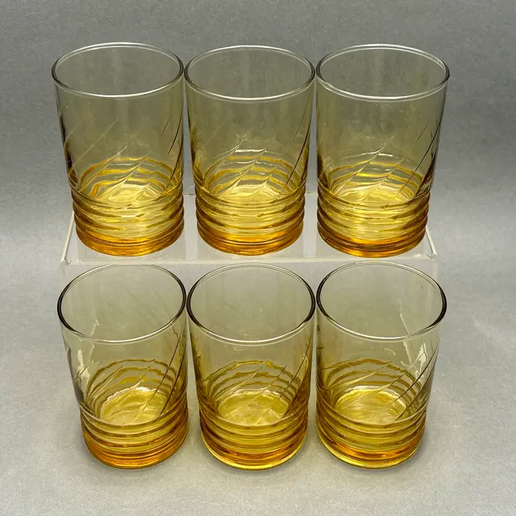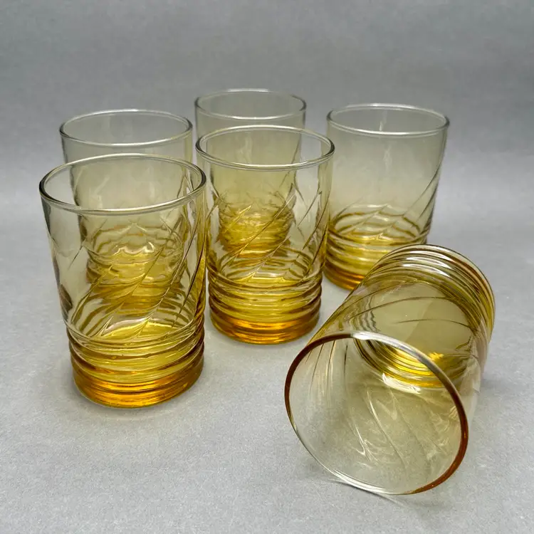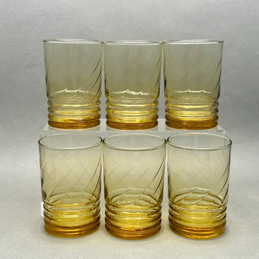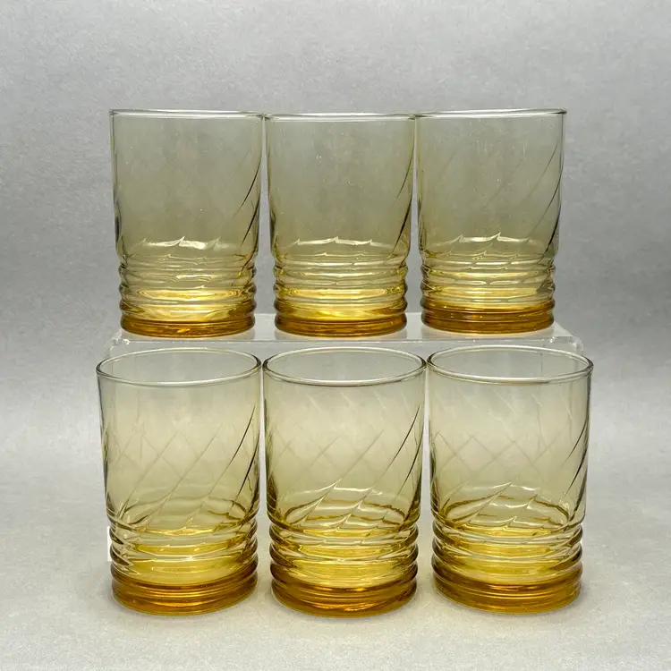 Vintage set of 6 MCM Libbey “Malibu Gold” juice glasses. They are a honey gold color with a ribbed lower body and swirl fluted upper.
