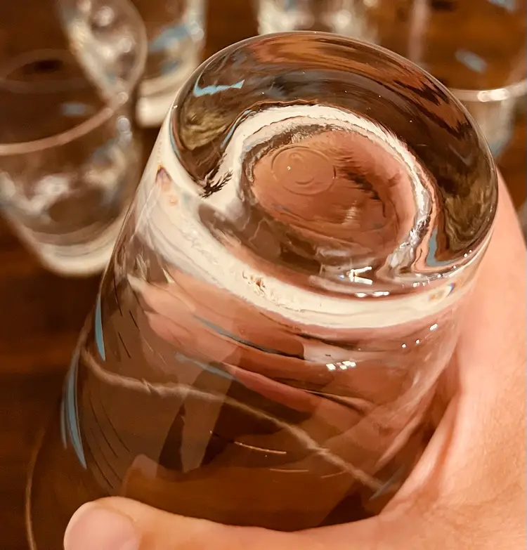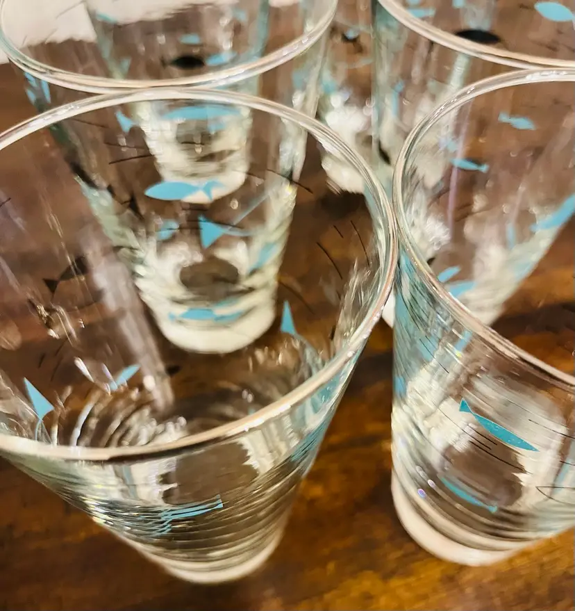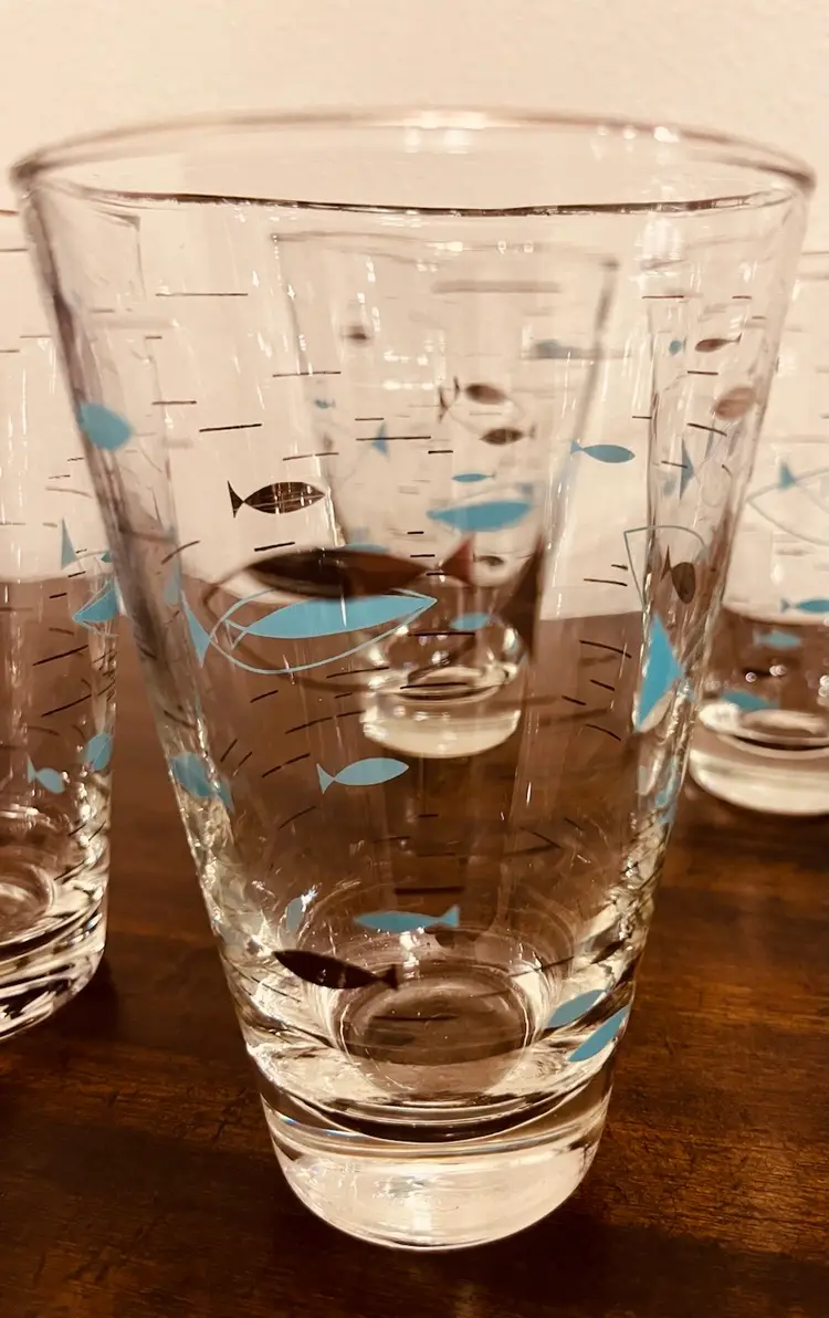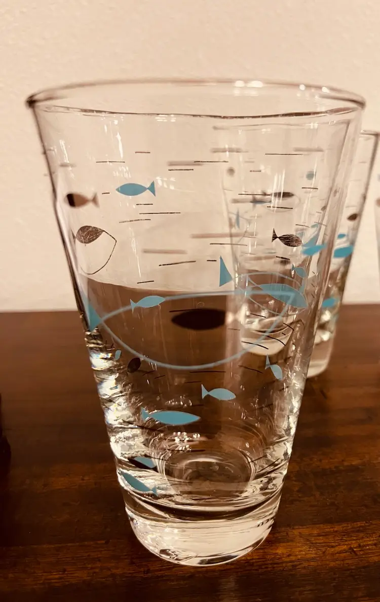 Great set of Mid-Century drinking glasses. Very gently used. 5-1/4" H x 3-1/2" across top. Minor wear to the platinum silver accents. The top rims have most of the platinum. No chips or cracks. Please view pictures carefully as they are a part of the description. Excellent vintage condition.