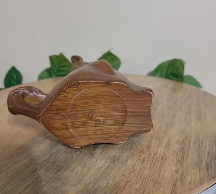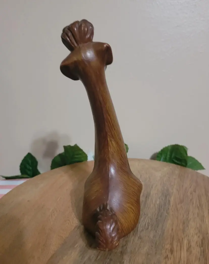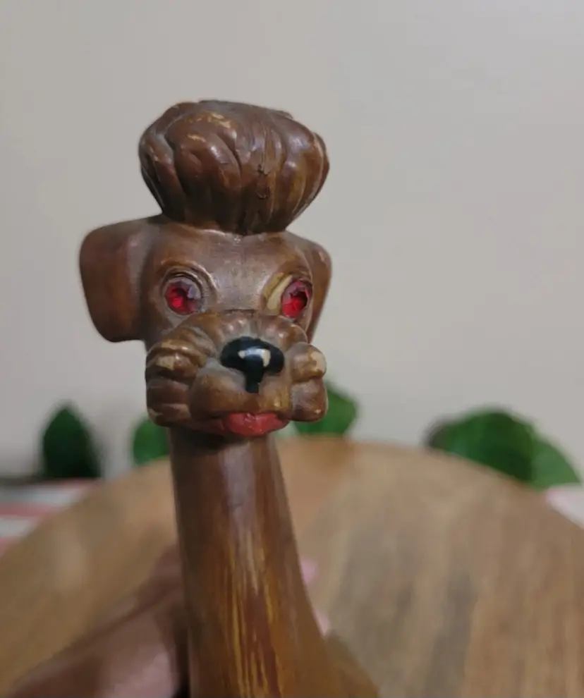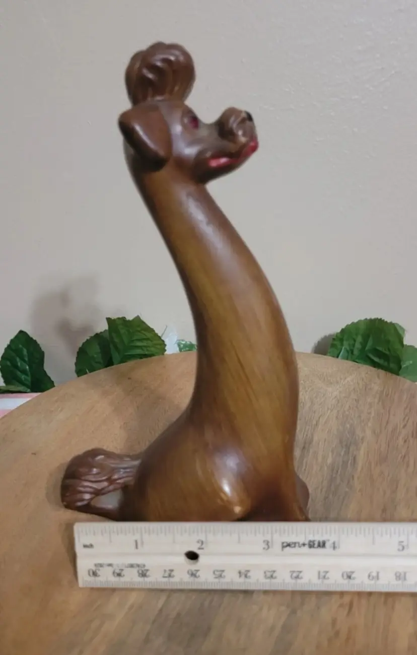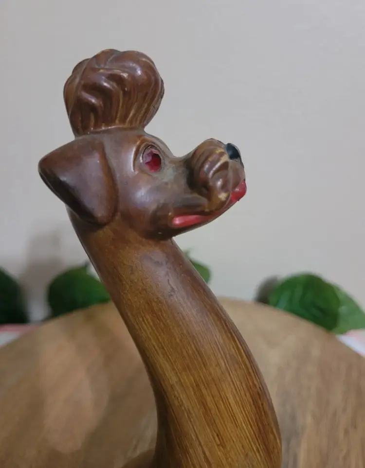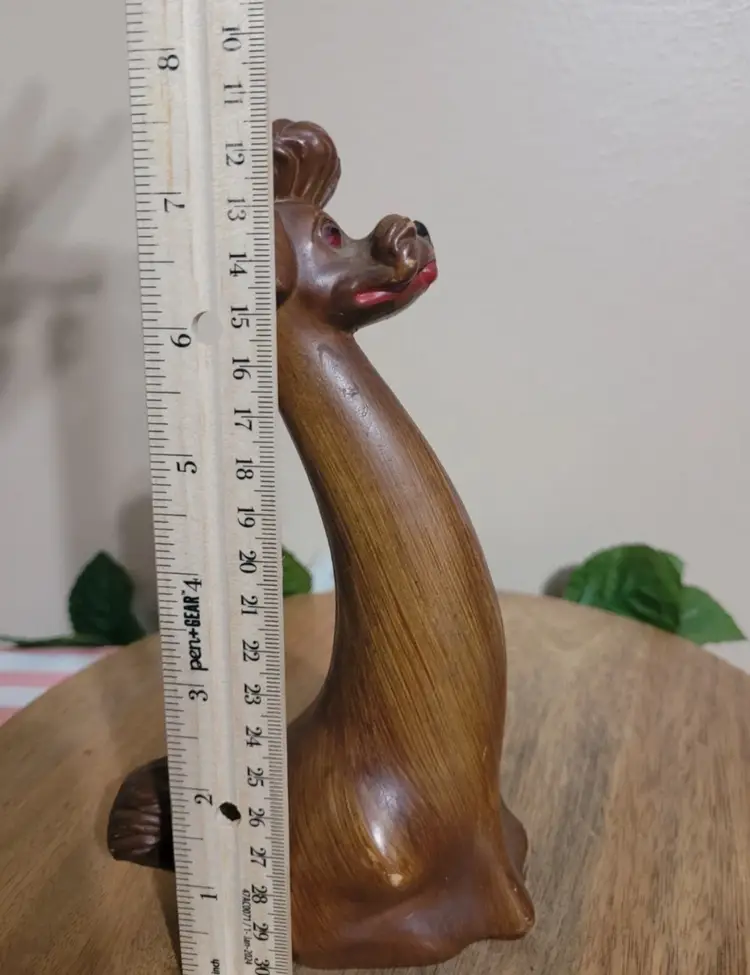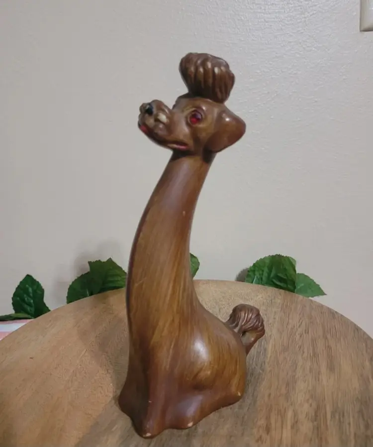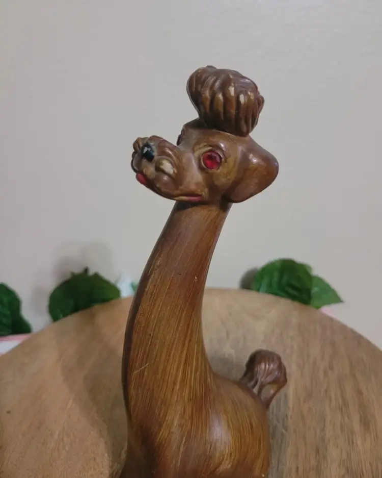 Vintage MCM long neck poodle figurine with red eyes. Made of composite wood like material, this collectible piece features a poodle as the main subject, showcasing its intricate details and unique design. Perfect for collectors of dog-themed figurines, this piece adds a touch of nostalgia and charm to any collection.