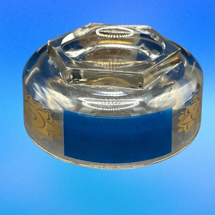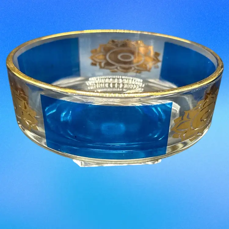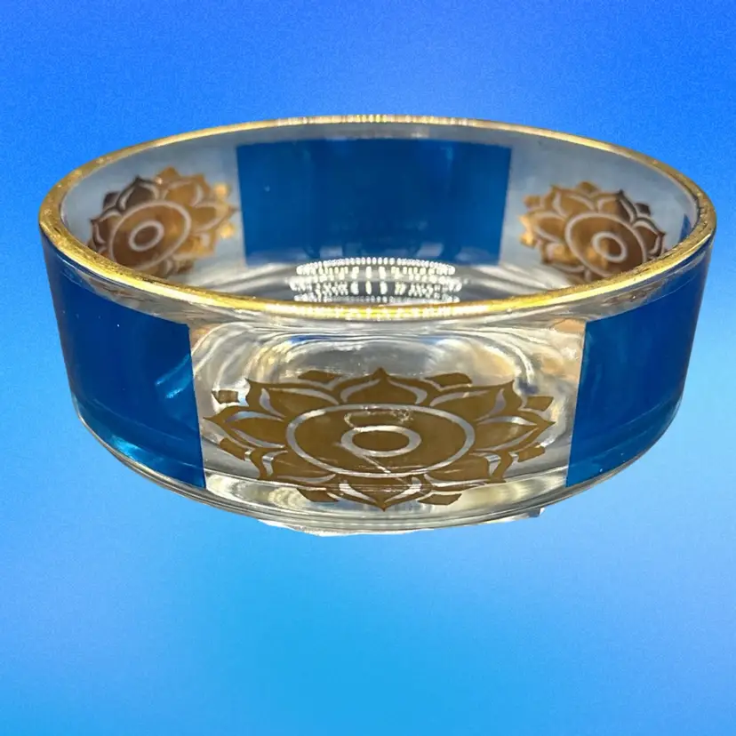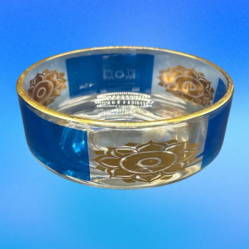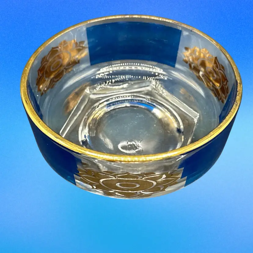 This vintage Hazel-Atlas MCM lotus flower glass dip bowl is a beautiful addition to any collection, featuring a stunning blue and gold print design with a glossy finish. Made of glass with a round shape and a height of 2 inches and a width of 4.5 inches, this one-piece bowl is perfect for serving up snacks or appetizers at any occasion. The lotus flower design and Mid-Century Modern style add a touch of nostalgia to your table setting, making it a unique and eye-catching piece from the 1950s to 1970s.
