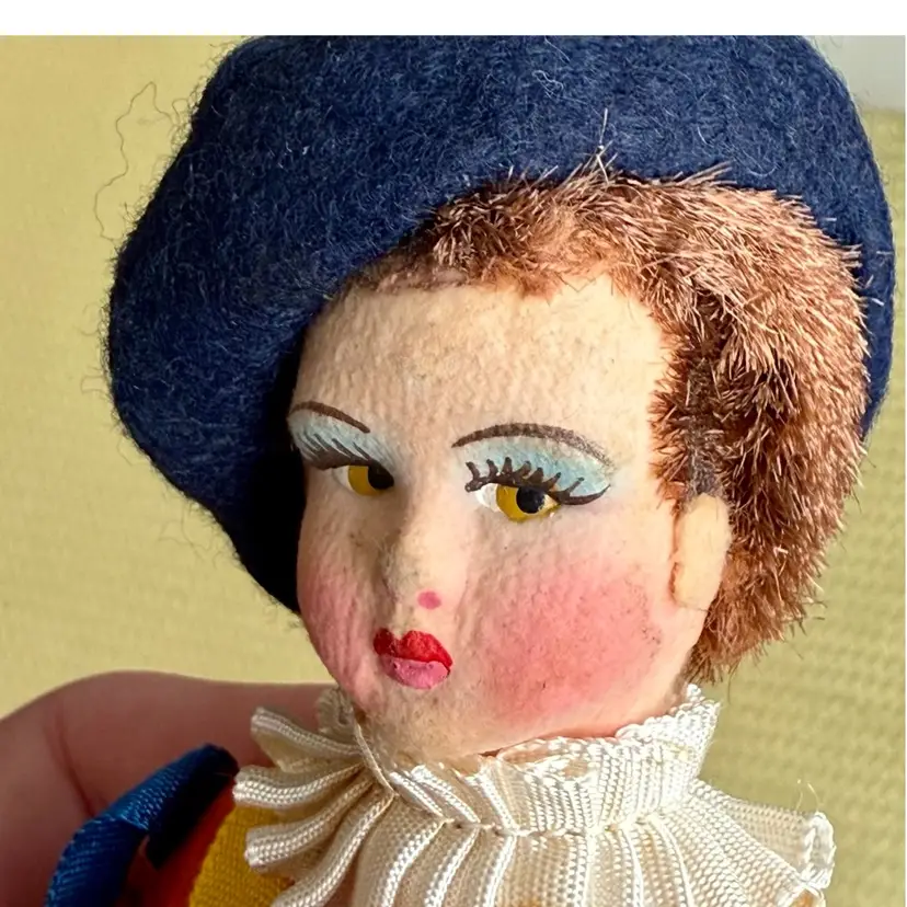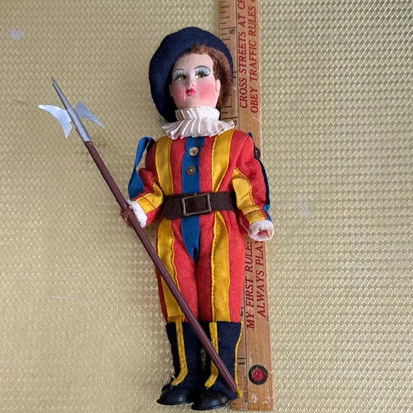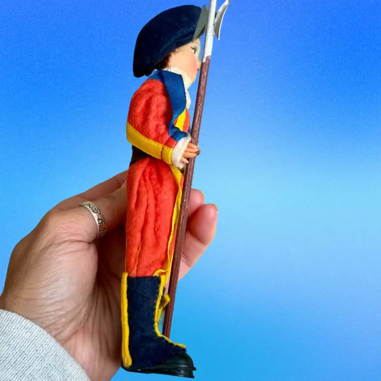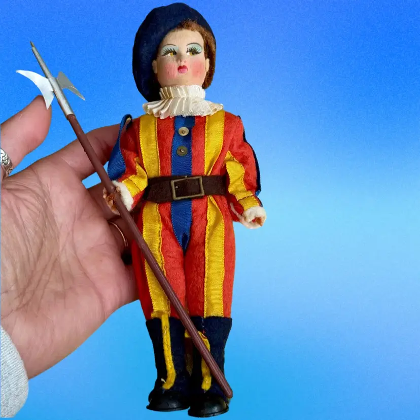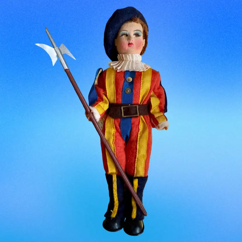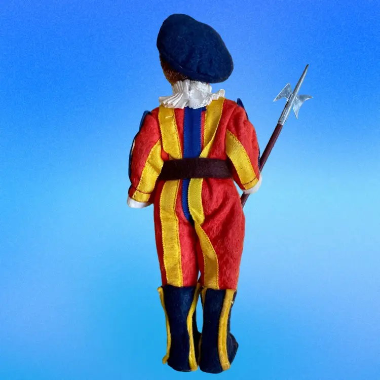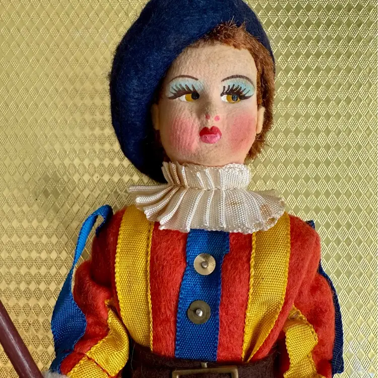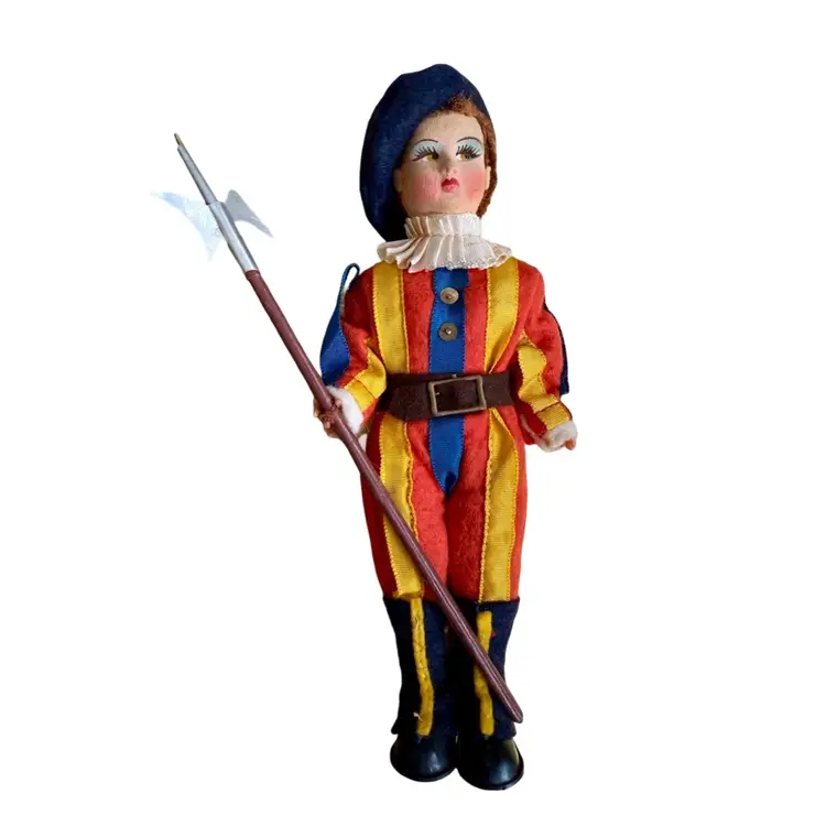 Vintage circa 1950’s Vatican Guard, "Guardia del Papa 73" 7.5" Doll - Made in Italy. This is a Magis Vatican Rome Guard Felt Souvenir Doll. The doll's position is fixed. It's head, hands, legs cannot be moved. Its felt face is similar to a Lency doll where it's eyes are looking sideways. It has a fur like hair showing under its beret. Hands are plastic. A beautiful doll to commemorate that time you travelled to the Vatican & saw these amazing guards!