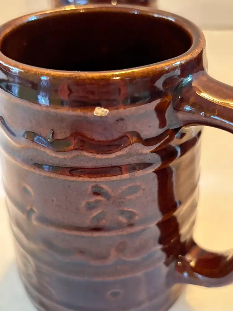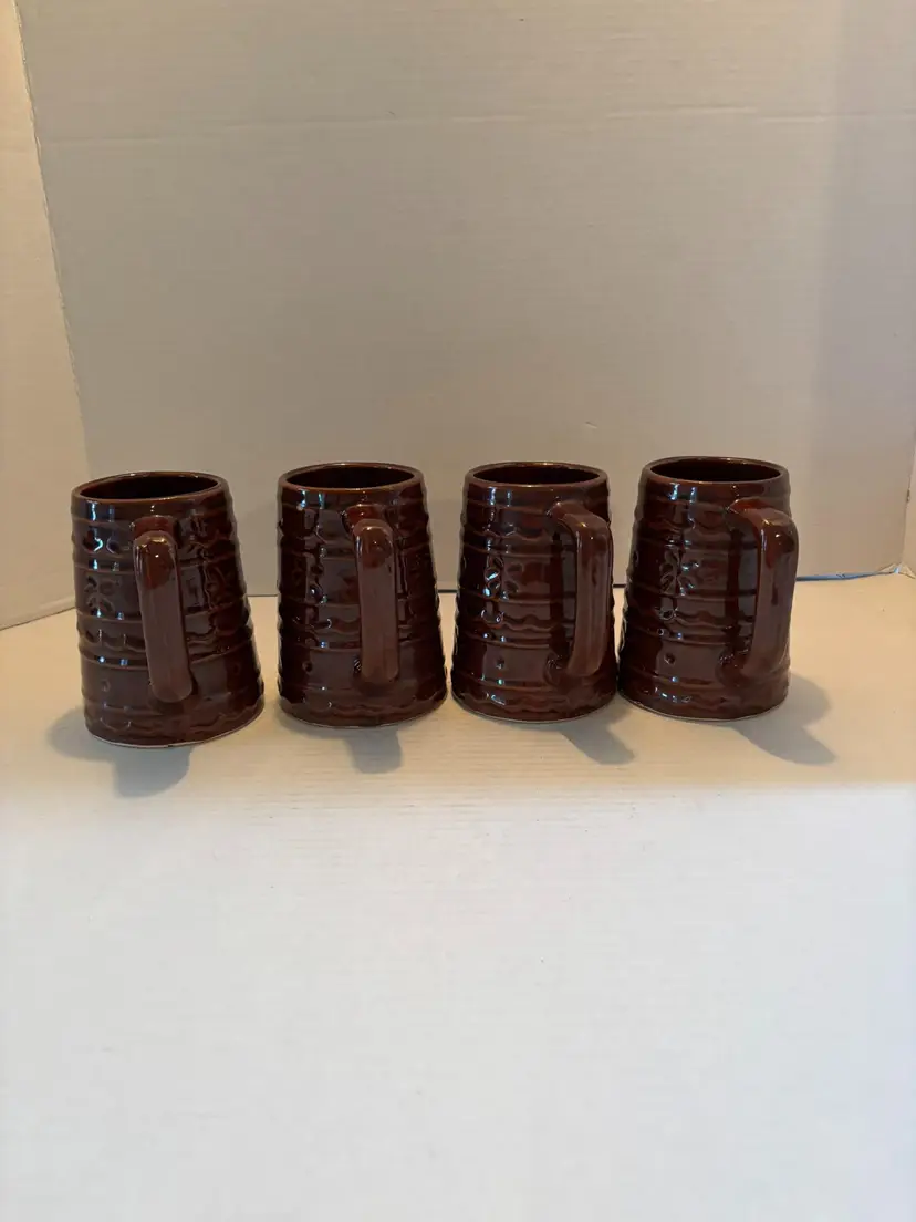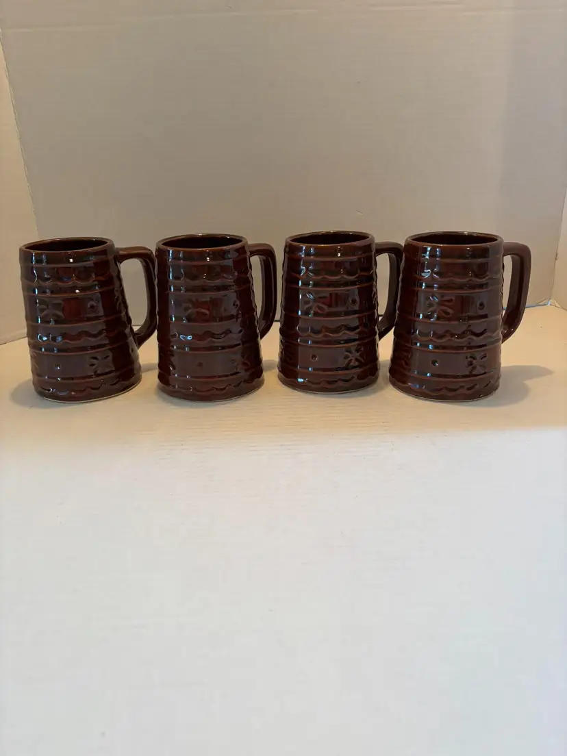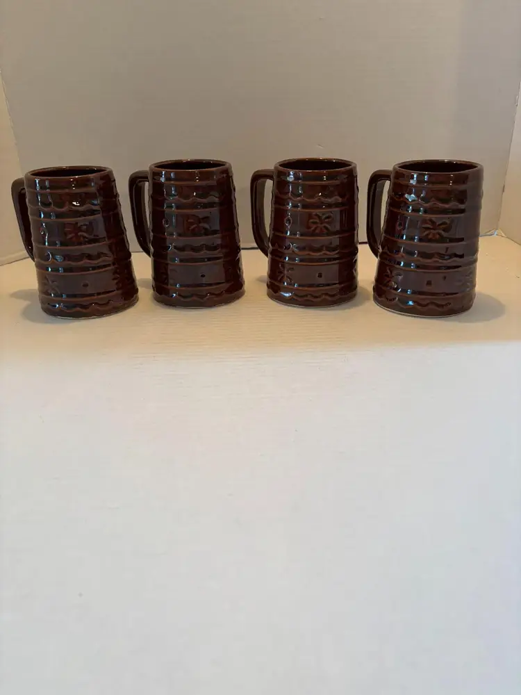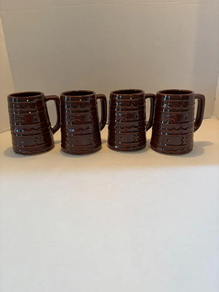 The Vintage MCM Marcrest Set of 4 Daisy & Dot Pattern Mugs in Dark Brown from Colorado, USA, showcases a classic Mid-Century Modern design. The mugs are made of stoneware with an art pottery production style, reflecting a vintage aesthetic. These original mugs feature a charming daisy and dot pattern, adding a touch of retro elegance to any kitchen or dining setting. There is a small flea bite chip in one of the mugs SEE PICTURE FOR DETAIL